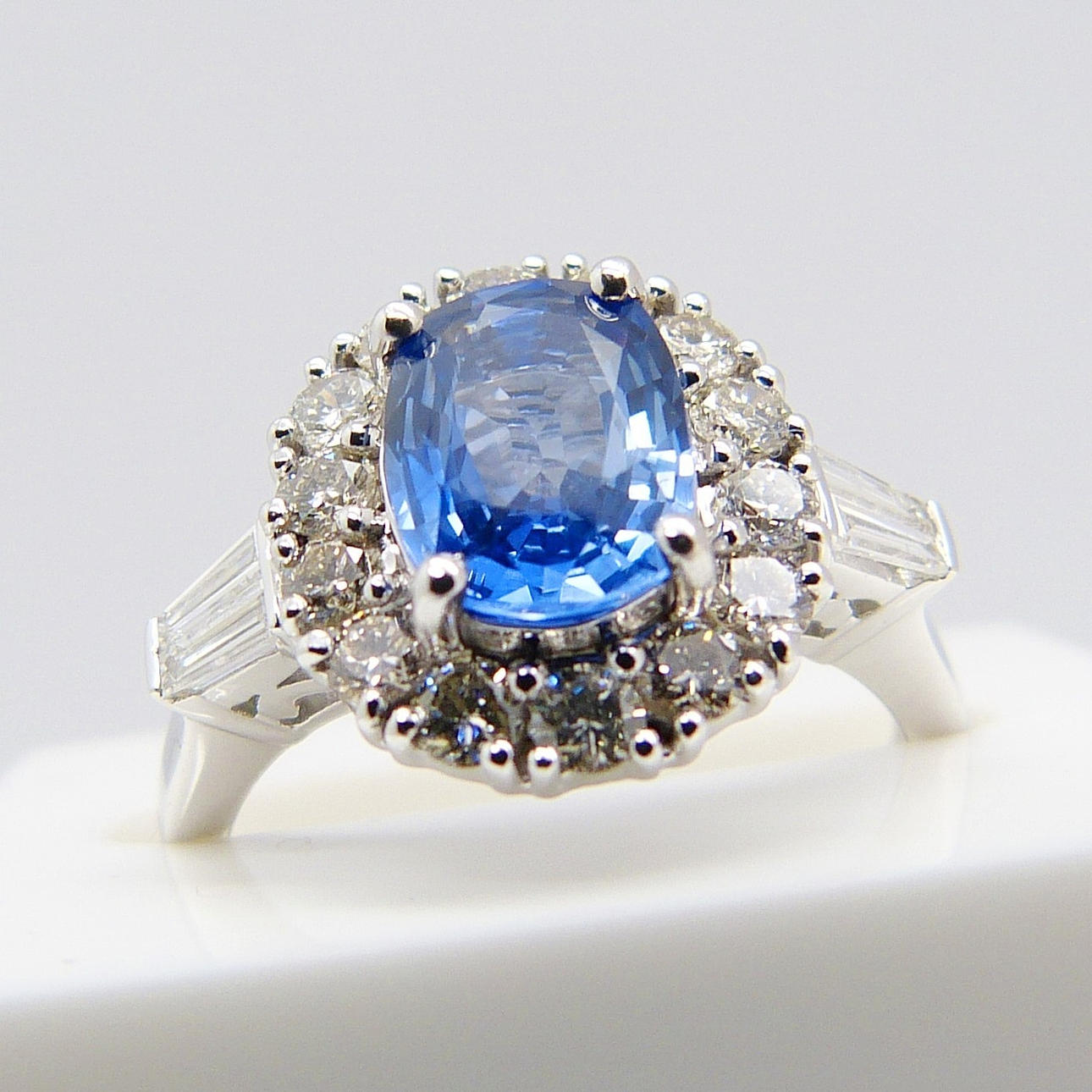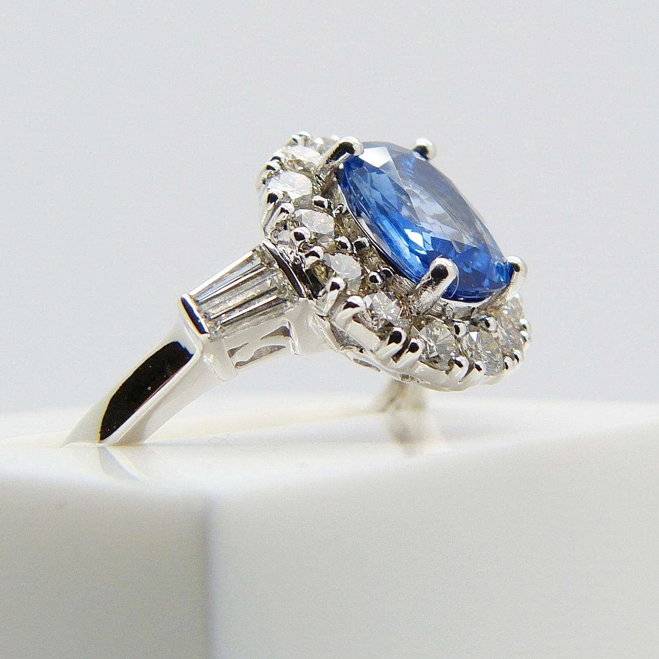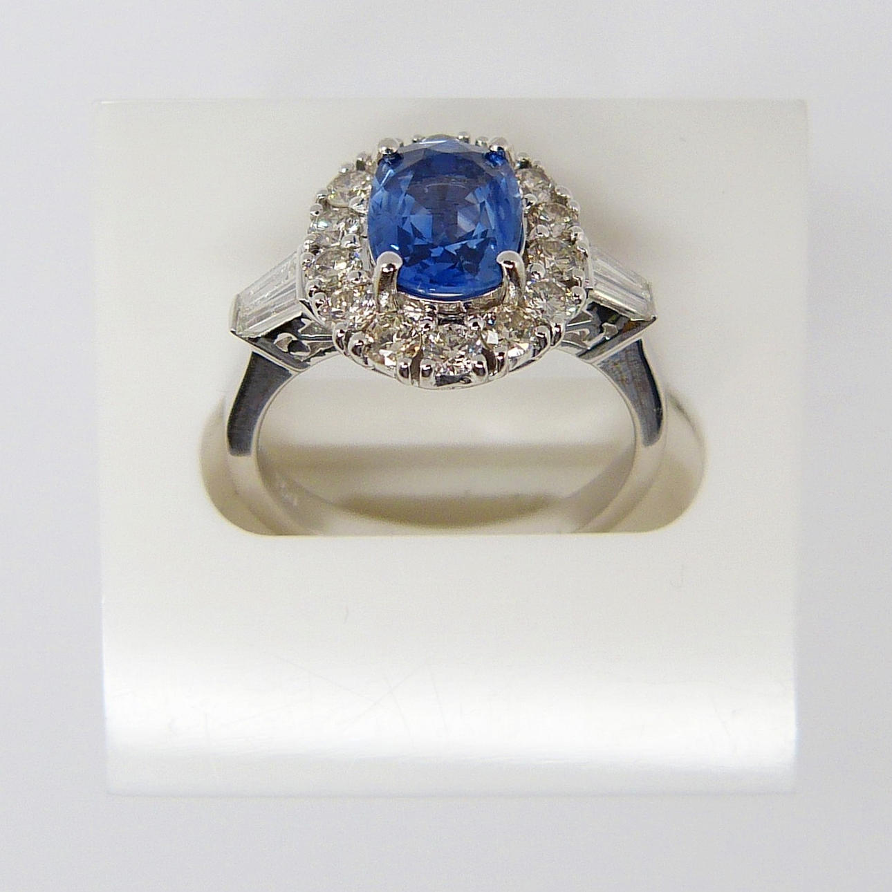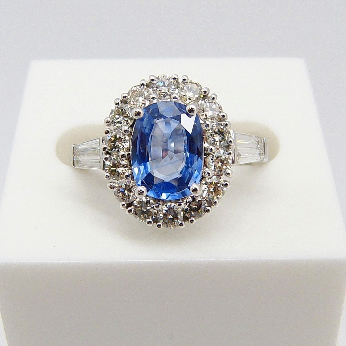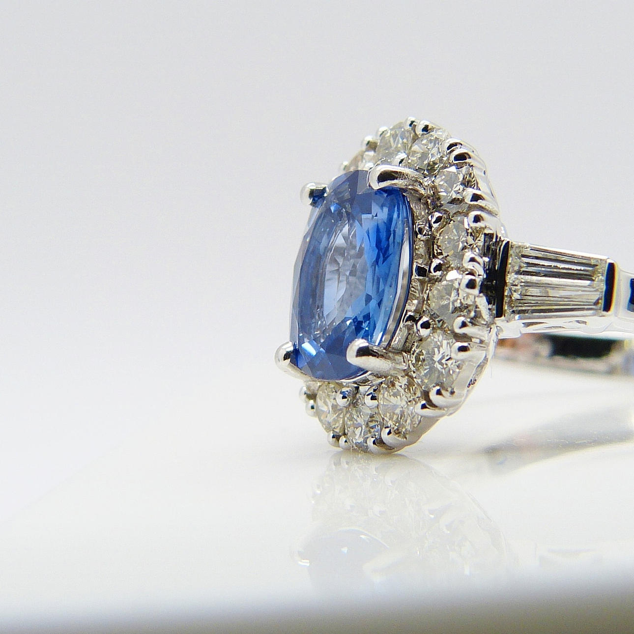 Hovedstenen i denne ring er en kornblomstblå, ovalskåret safir ædelsten med en karatvægt på 1,47 ct, anslået. Den er sat i en 4-klo montering.