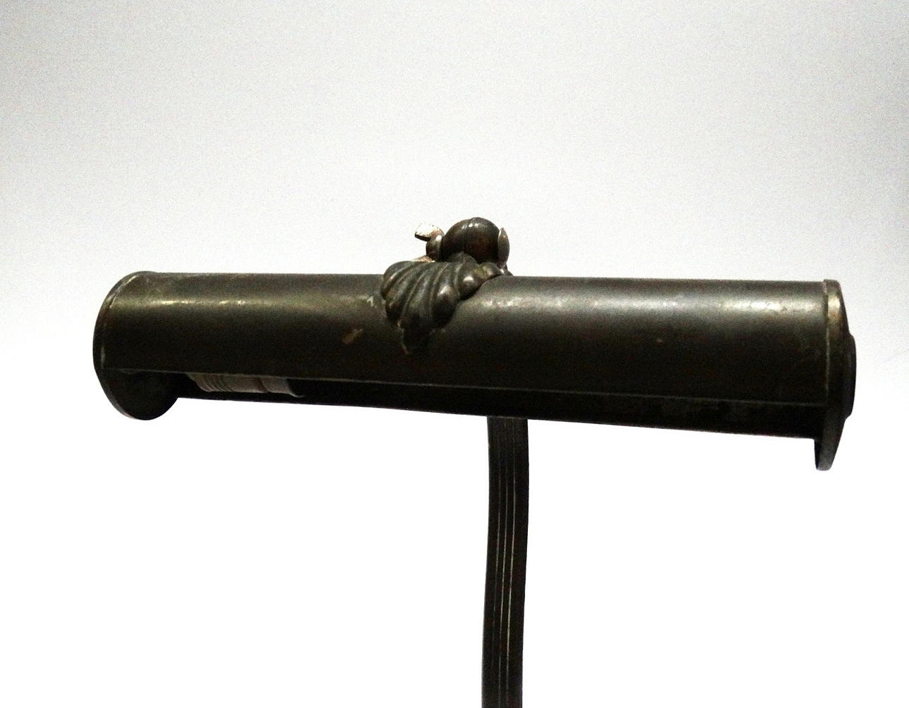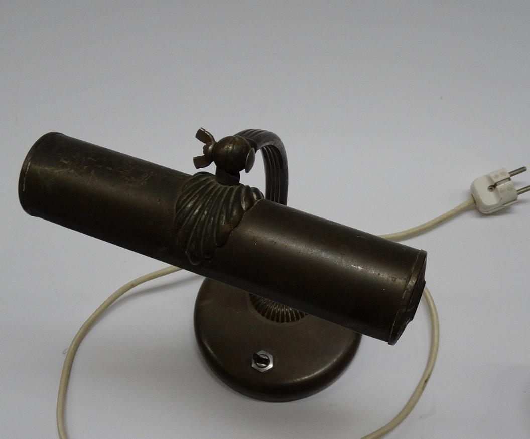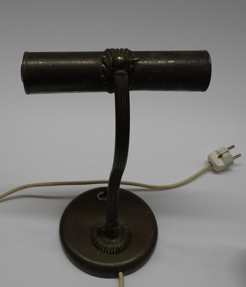 Art Deco lampe lavet af metal, dekoreret, ca. 30 cm høj, diameter på bunden ca. 13 cm, diameter på lampeskærmen ca. 5 cm, ca. 20 cm bred.