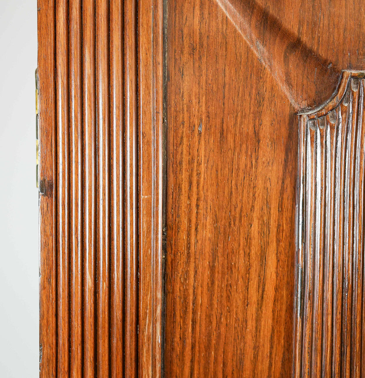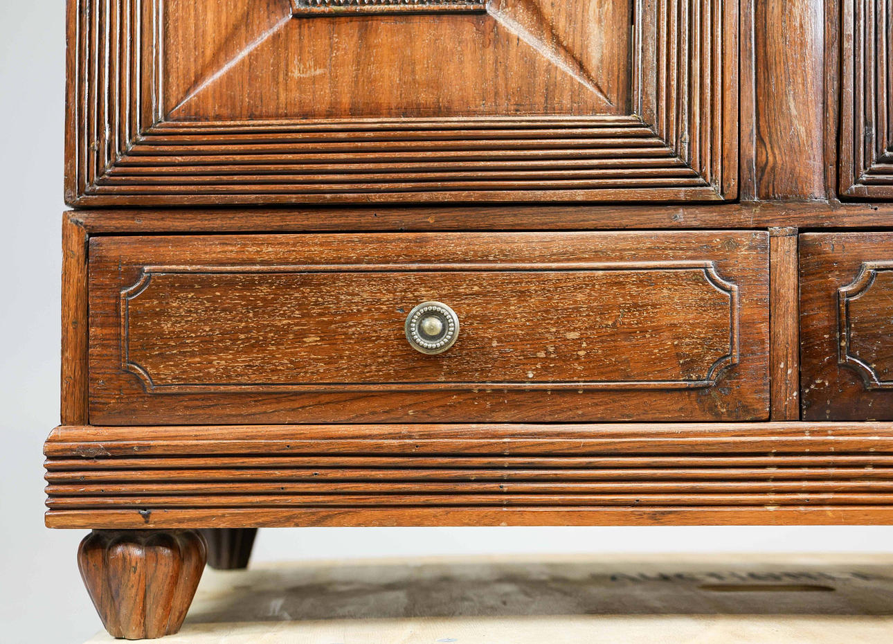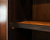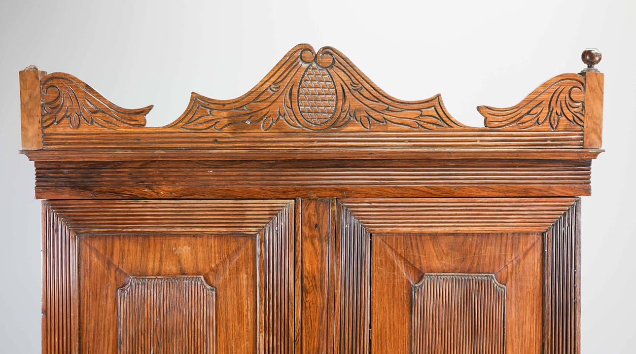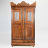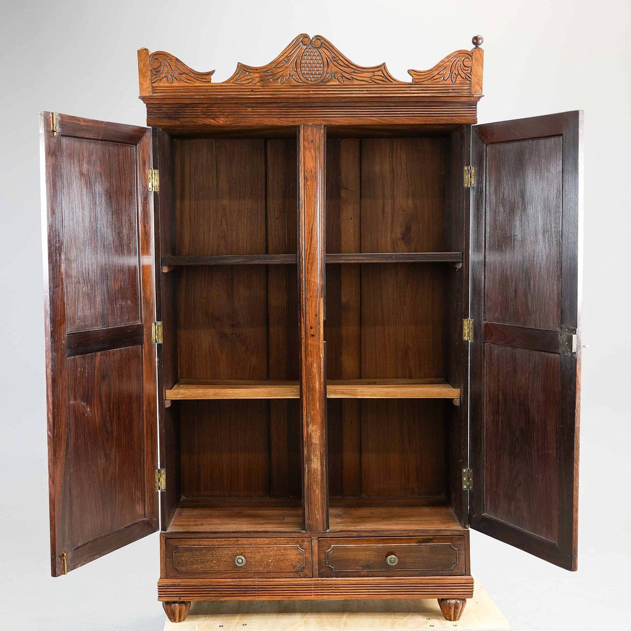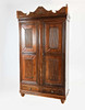 udskåret hårdttræ med to paneldøre, der omslutter hylder med to skuffer nedenfor, 201 cm H x 107 cm B x 45 cm D.