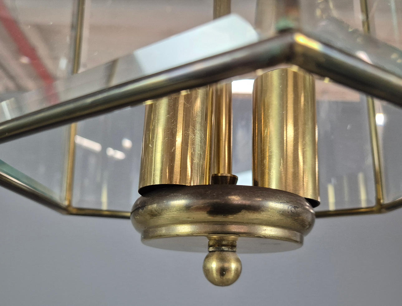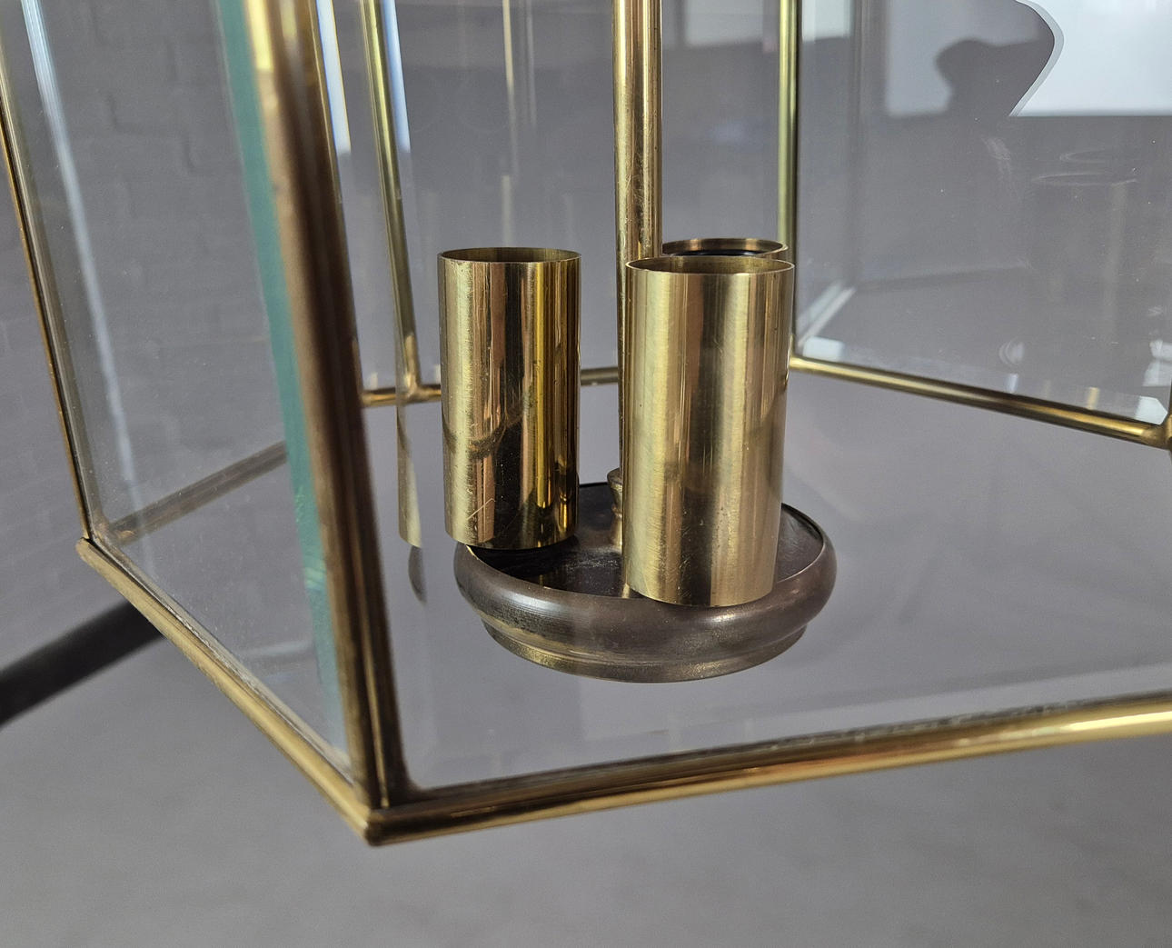 et sæt af tre, sekskantet messing med skrå glaspaneler og tre grenlys, hver 40 cm H x 21 cm B (ekskl. kæde).