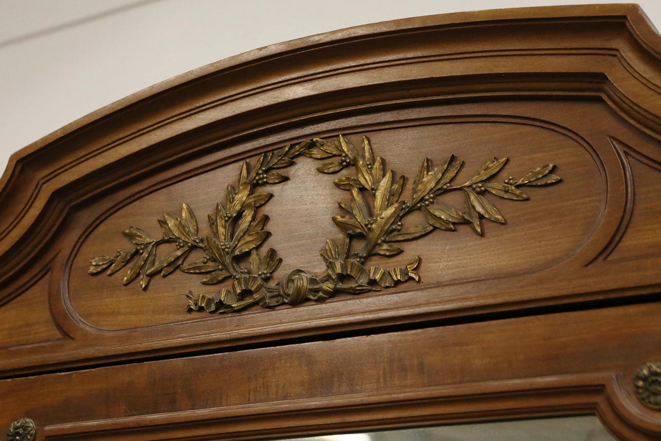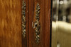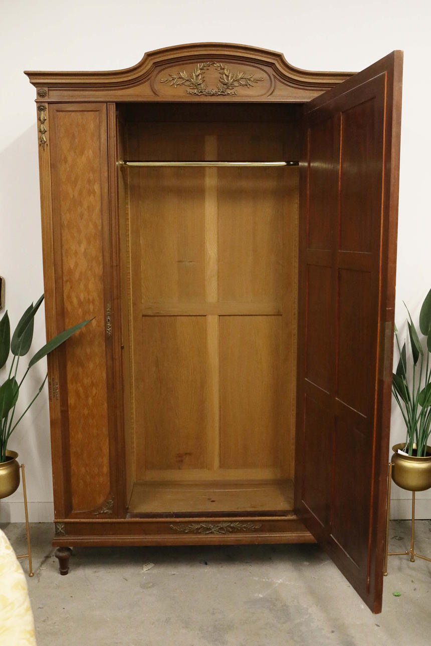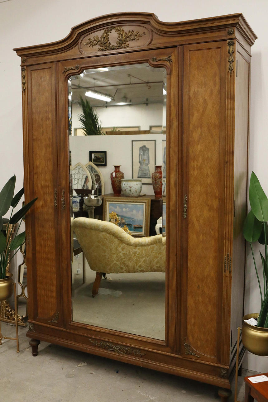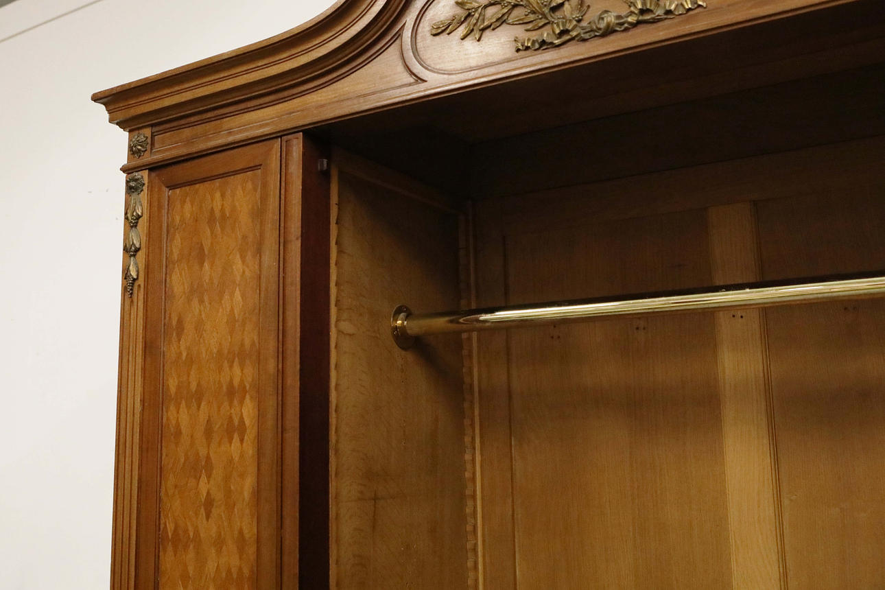 slutningen af 19./begyndelsen af det 20. århundrede fransk parket og forgyldt metal monteret, med en skrå spejlet dør flankeret af to smalle døre, der omslutter en hængende skinne, hylder og bakker, 160 cm b x 240 cm t x 51 cm s.