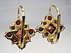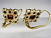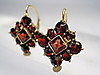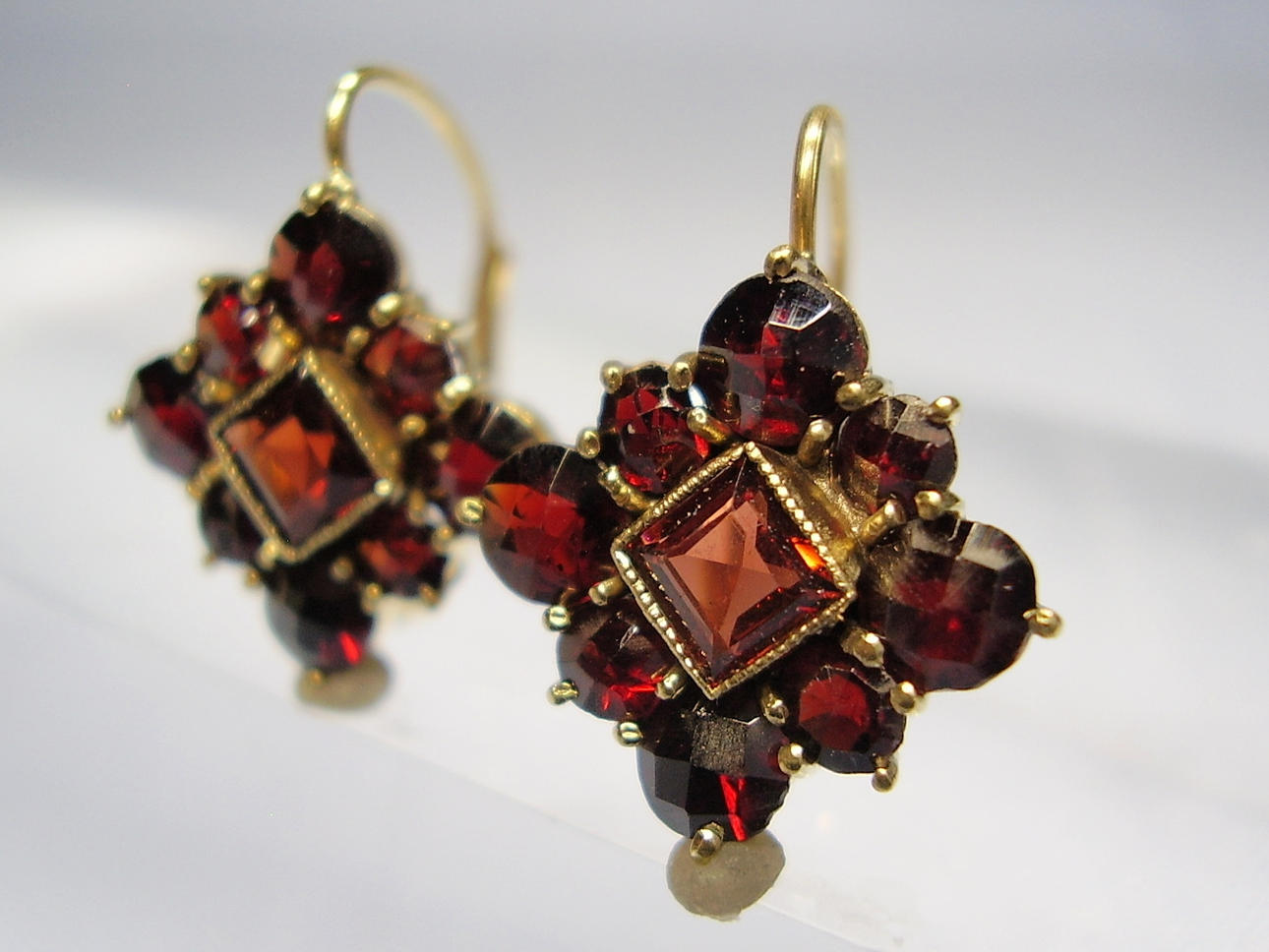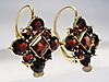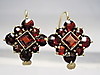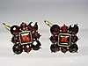 Sie haben Klapp-Ohrbügel zum rückseitigen Einhängen. Die Frontseiten sind besetzt mit quadratisch und rund facettierten, blutroten böhmischen Granaten im antiken Rosenschliff. Durch die rückseitig offen gearbeiteten Fassungen gelangt viel Licht an die herrlichen Granate und läßt sie herrlich funkeln.