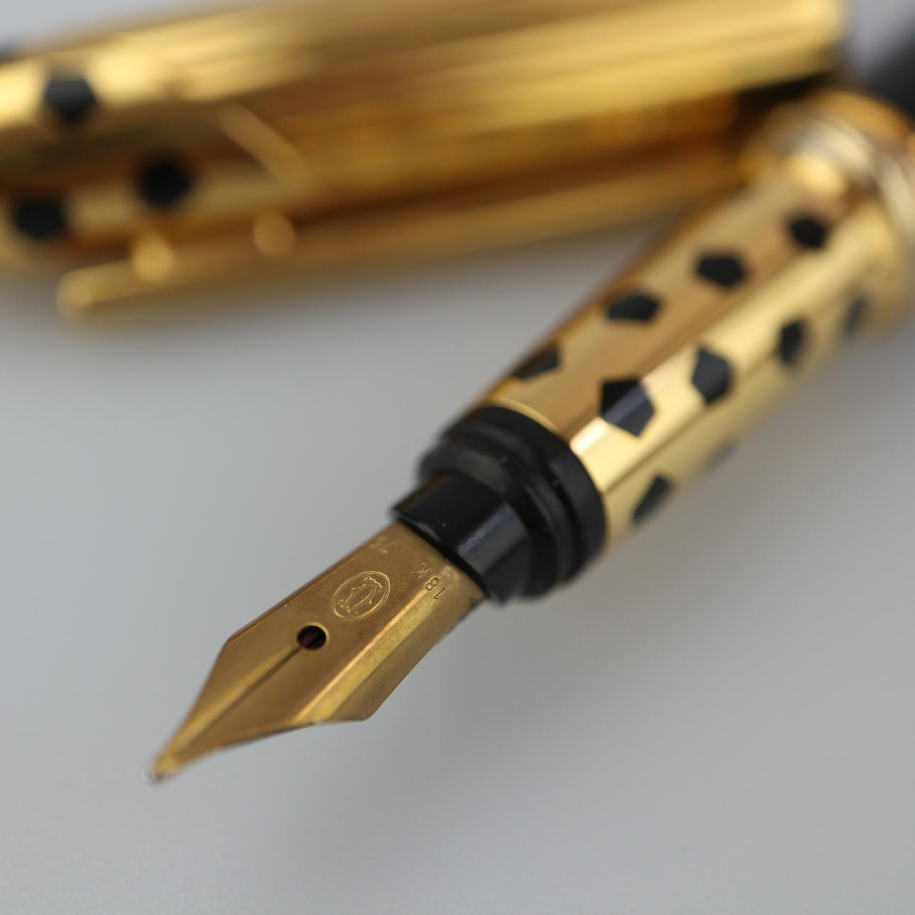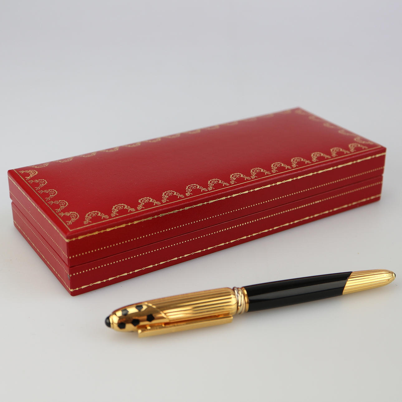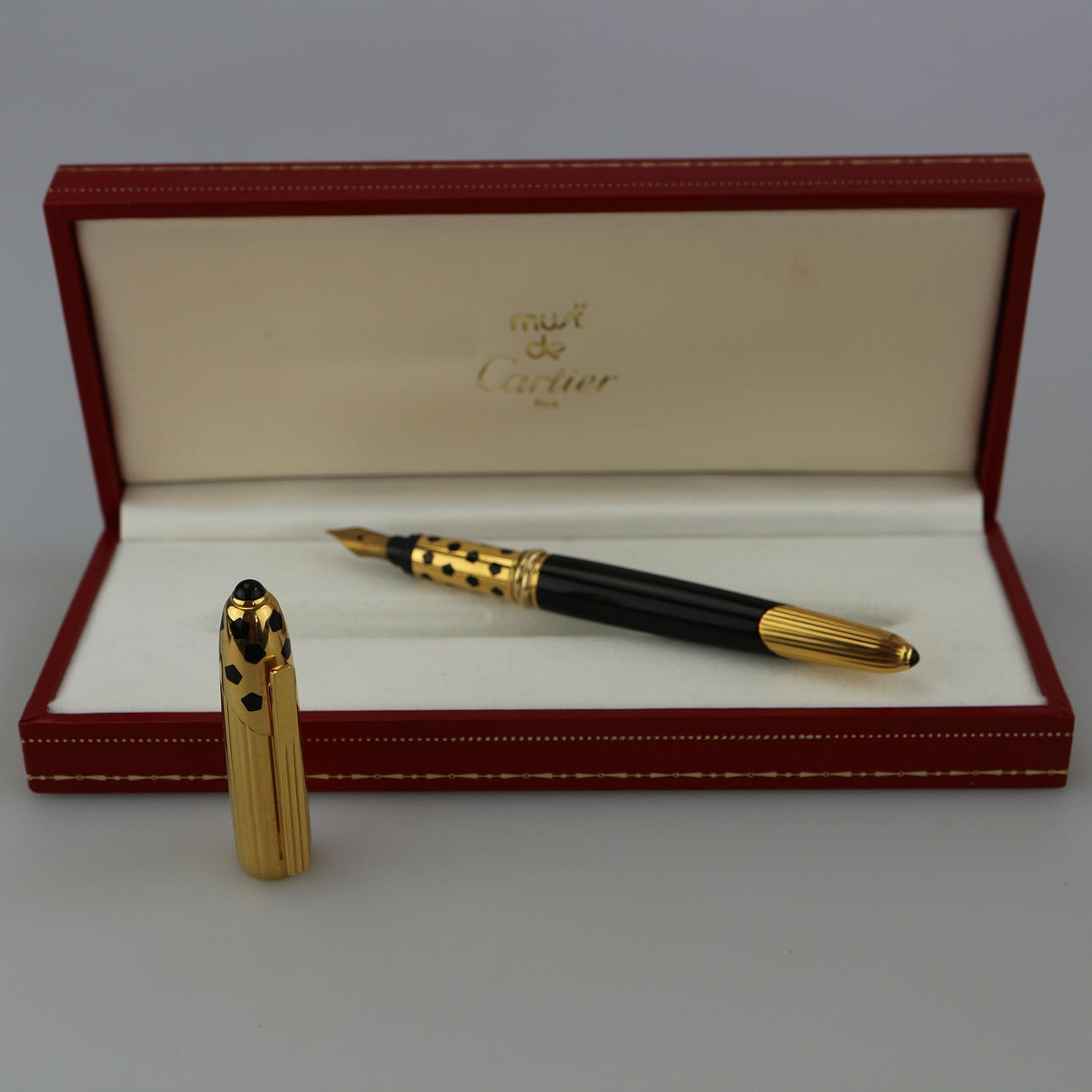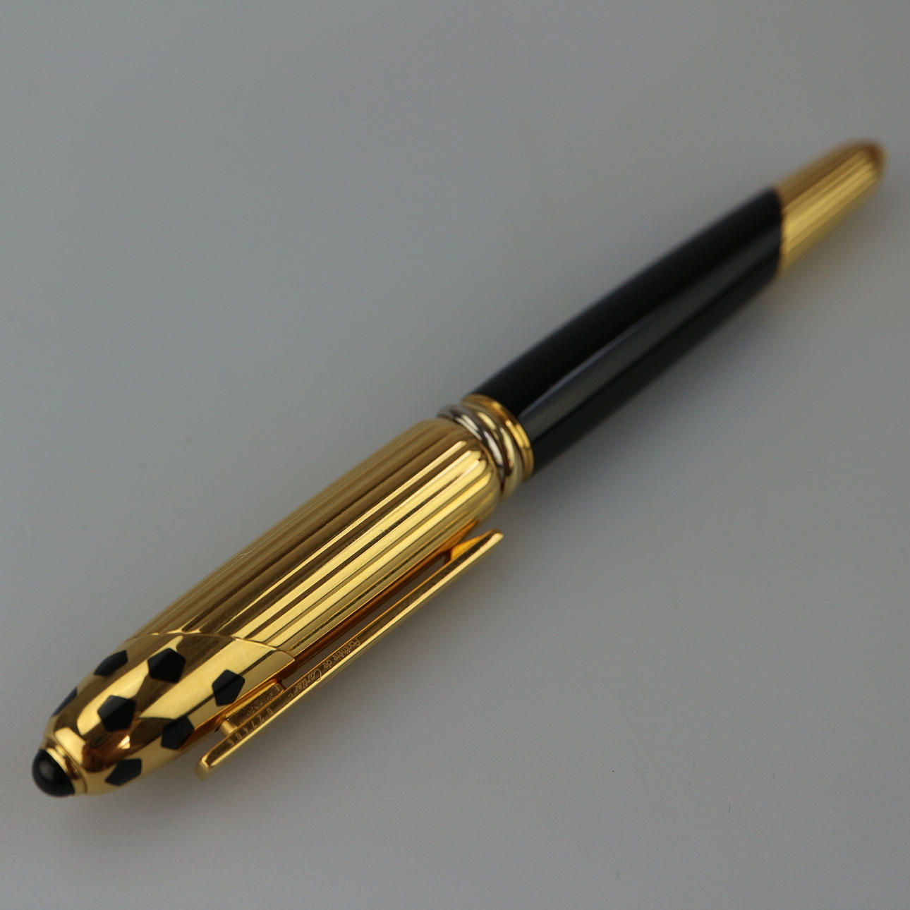 Panthere de Cartier Füller, 750/18kt, Stempel auf der Feder, Clip vergoldet mit Panthère de Cartier Aufdruck und Seriennummer / Zwischenringe ebenso vergoldet, Länge des Füllers 13 cm, mit originalem Etui.