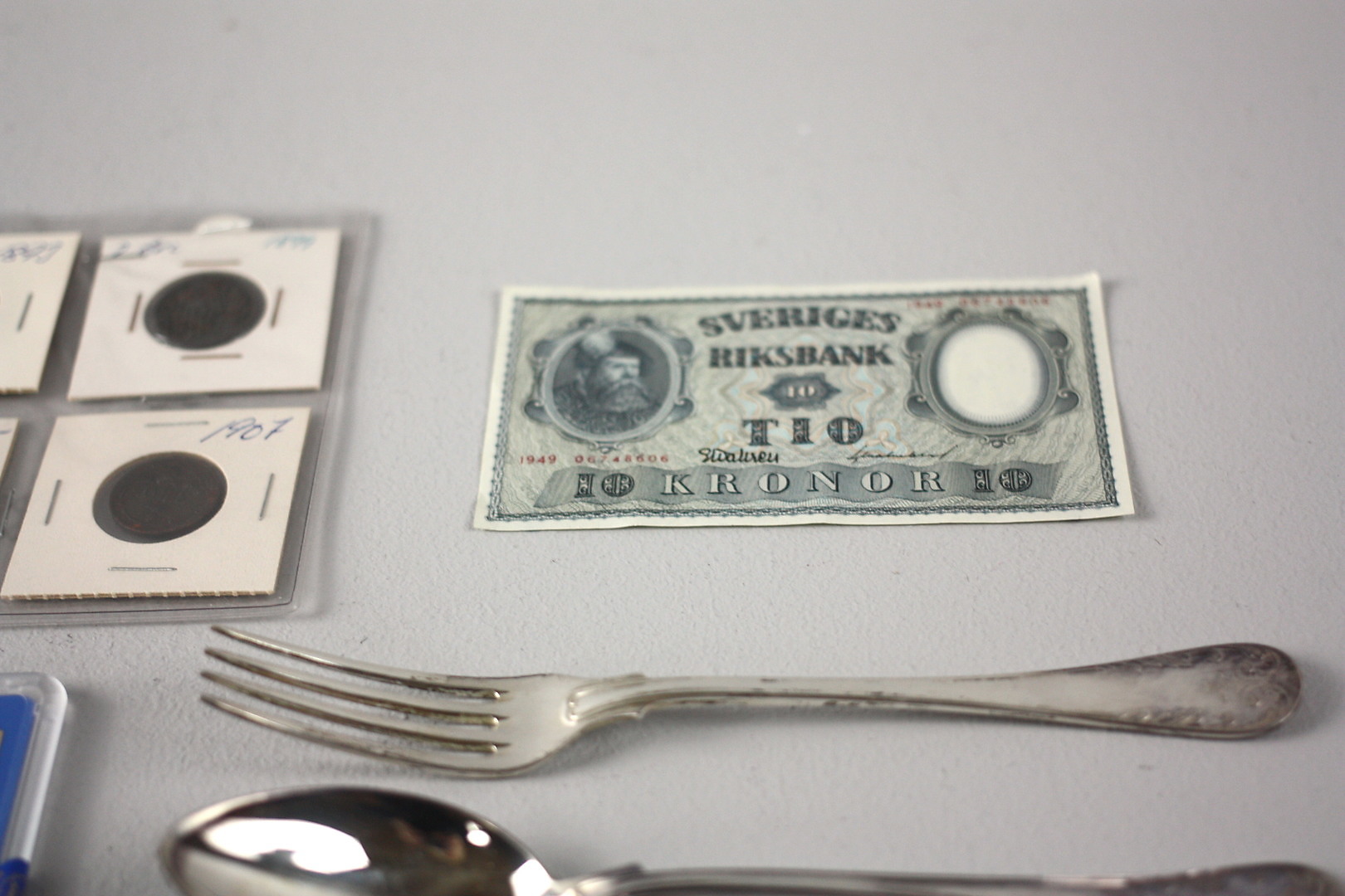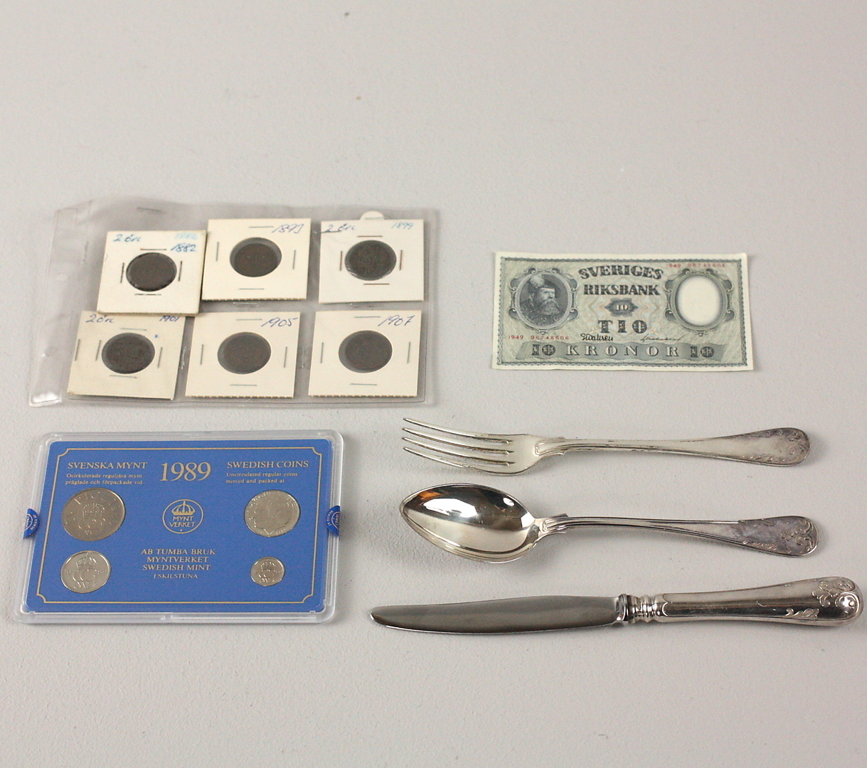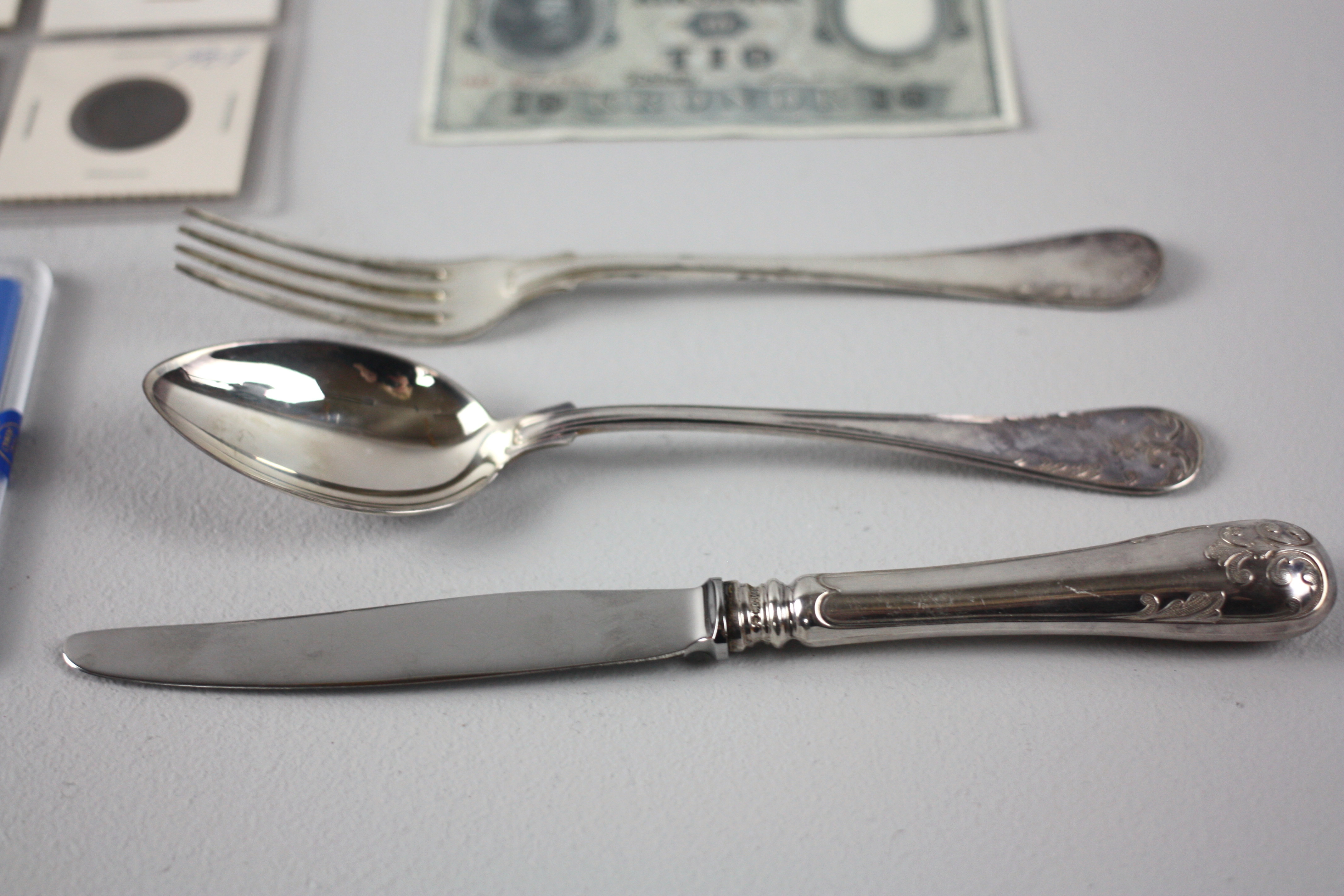 1042220. Ein Menge SILVER, Besteck, Münzen, Banknote.