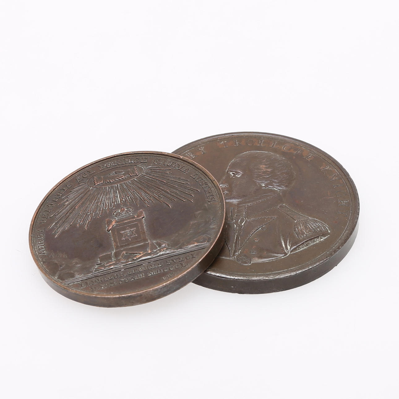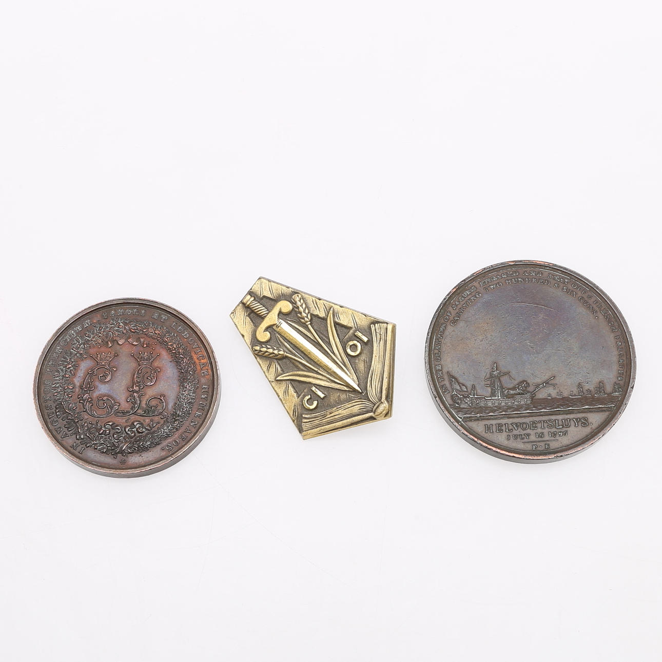 Medaille, England zum Gedenken an einen Seevorfall bei Helvoetsluys, 1796, Kupfer, Freimaurermedaille, 19. Jahrhundert, Schweden, Kupfer und französisches Anstecknadel, vergoldetes Weißmetall.