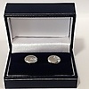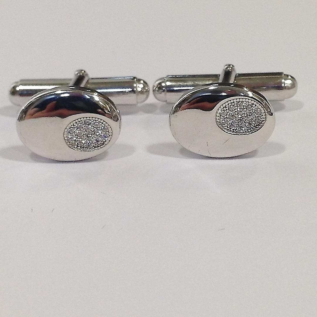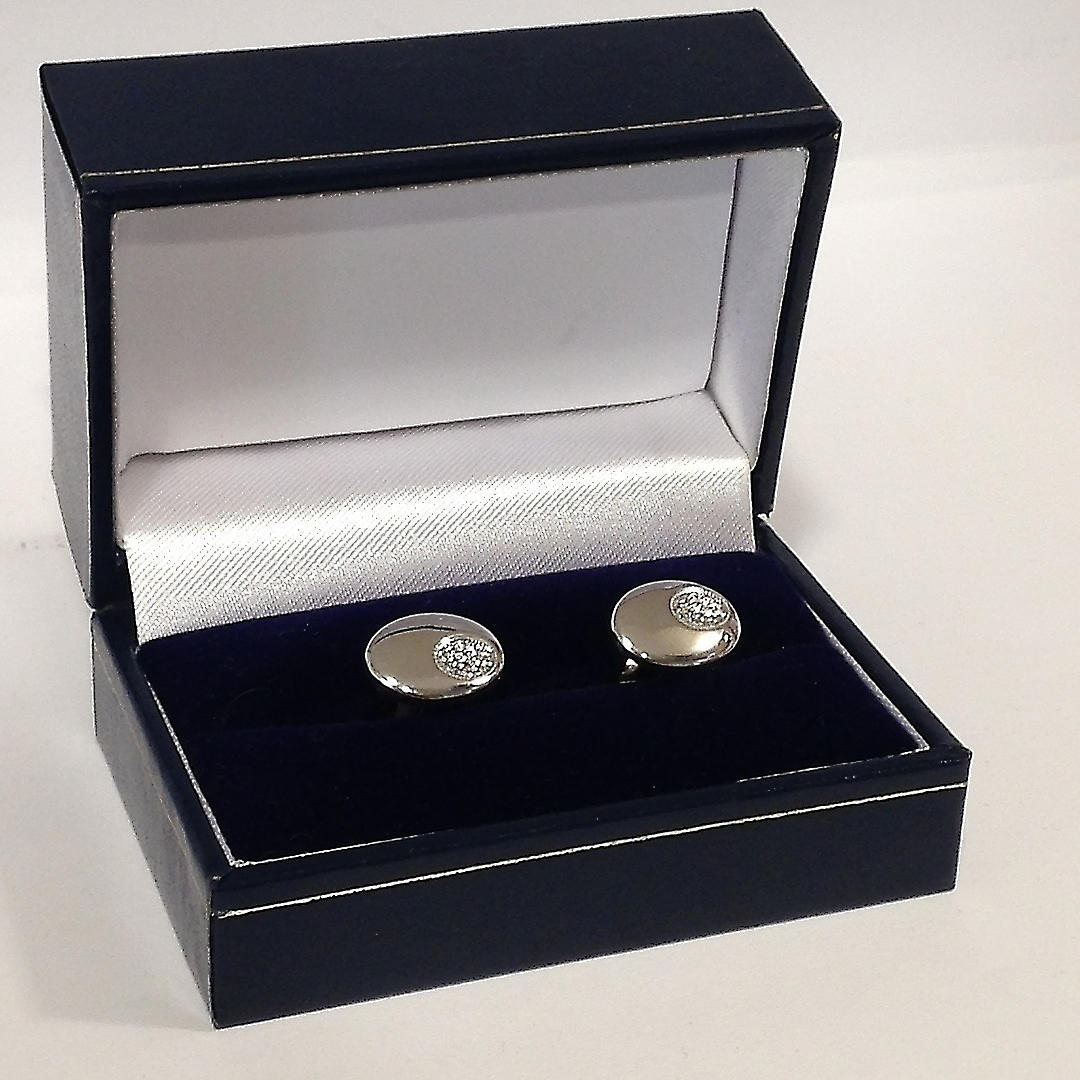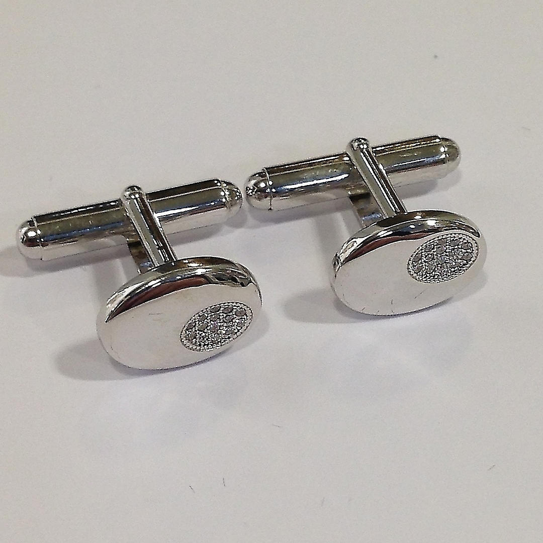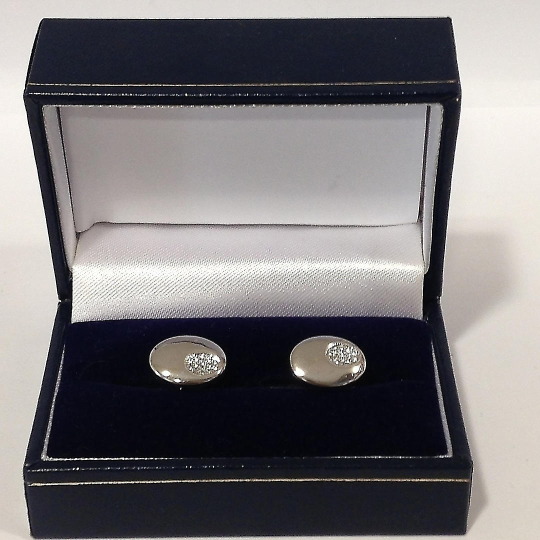 Ein Paar ovale Manschettenknöpfe aus Silber. Diese Manschettenknöpfe sind aus Silber (gestempelt „925“). Diese Manschettenknöpfe haben eine kleine Einlage, die mit einer Gruppe runder Zirkonia-Steine im Brillantschliff besetzt ist Karton Gewicht Karton: 63,2 Gramm Gewicht Manschettenknöpfe: 6,3 Gramm Gesamtgewicht: 69,6 Gramm.