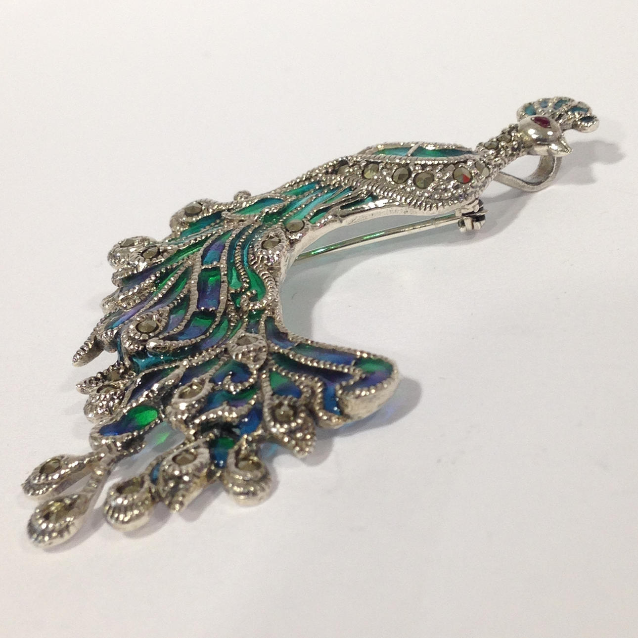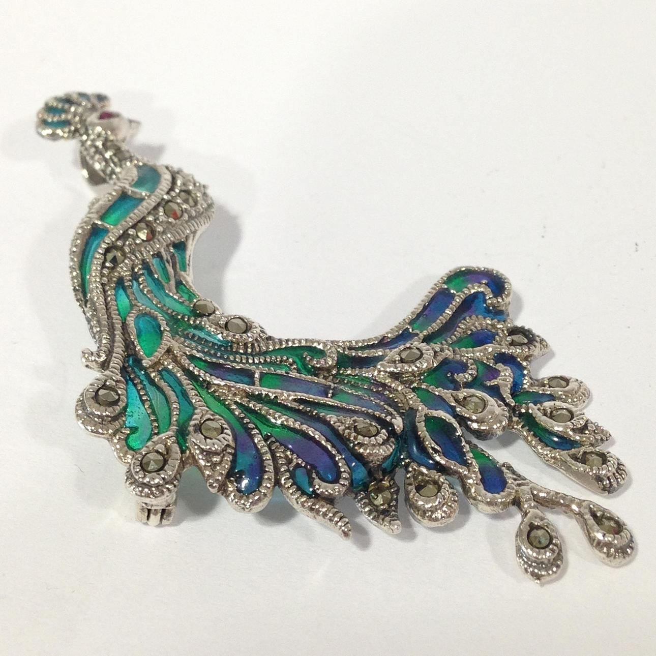 Ein kombinierter Anhänger und eine Brosche im Vintage-Stil mit Pfau, besetzt mit Rubin und Markasit und gefüllt mit farbigen Emails.