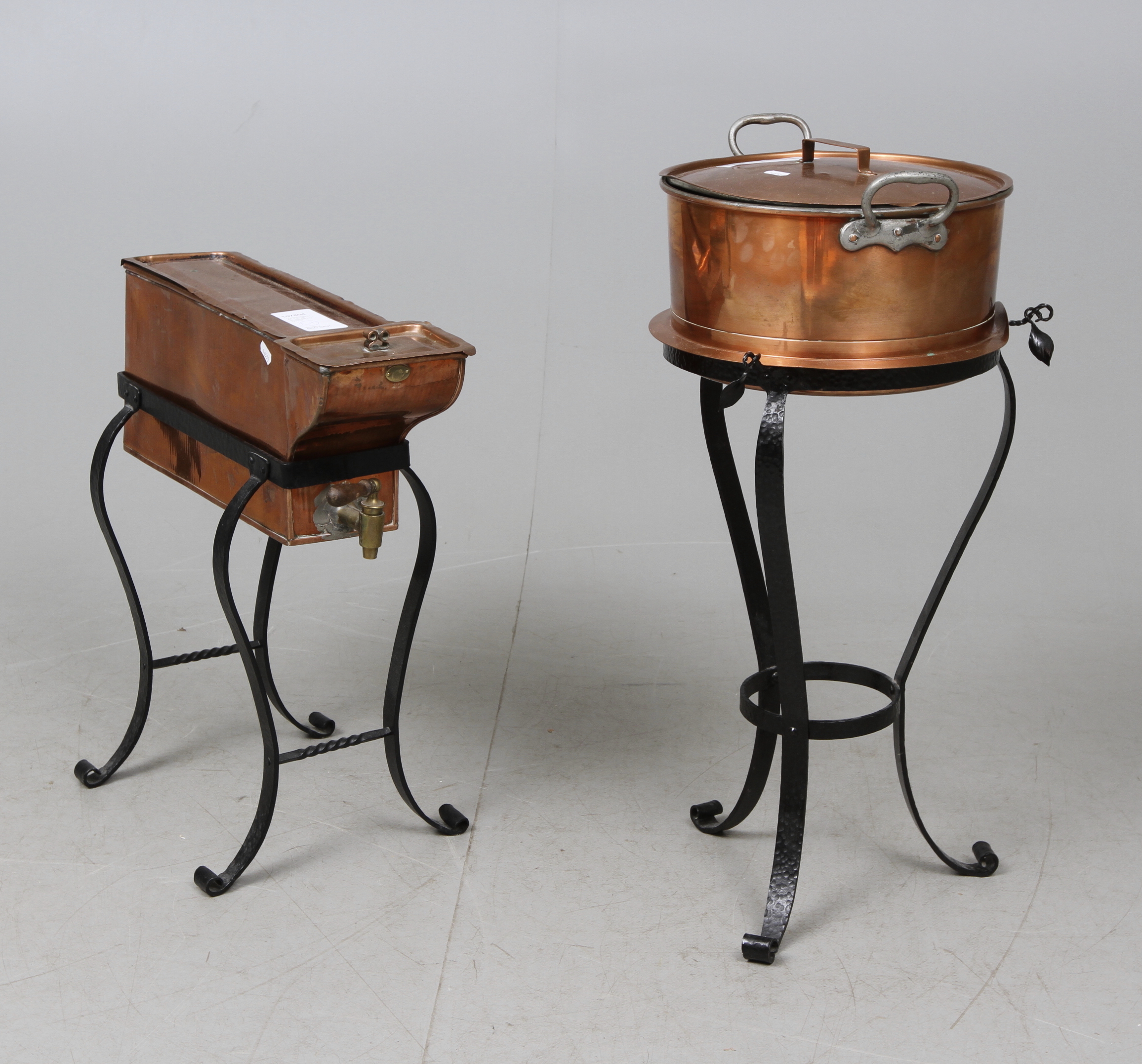 107604. KUPFEROBJEKTE, 2 Stück, auf Schmiedeständer. 1900er.