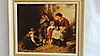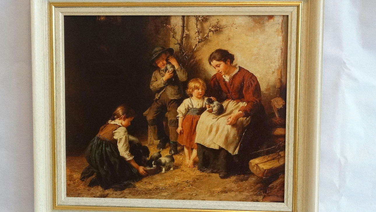 Reproduktion: Öldruck auf Leinwand, eines Gemäldes von Felix Schlesinger aus dem 19. Jahrhundert., Die kleinen Hunde, im Holzrahmen, ca. 40 x 35 / 52 x 47 cm, 20. Jh.
