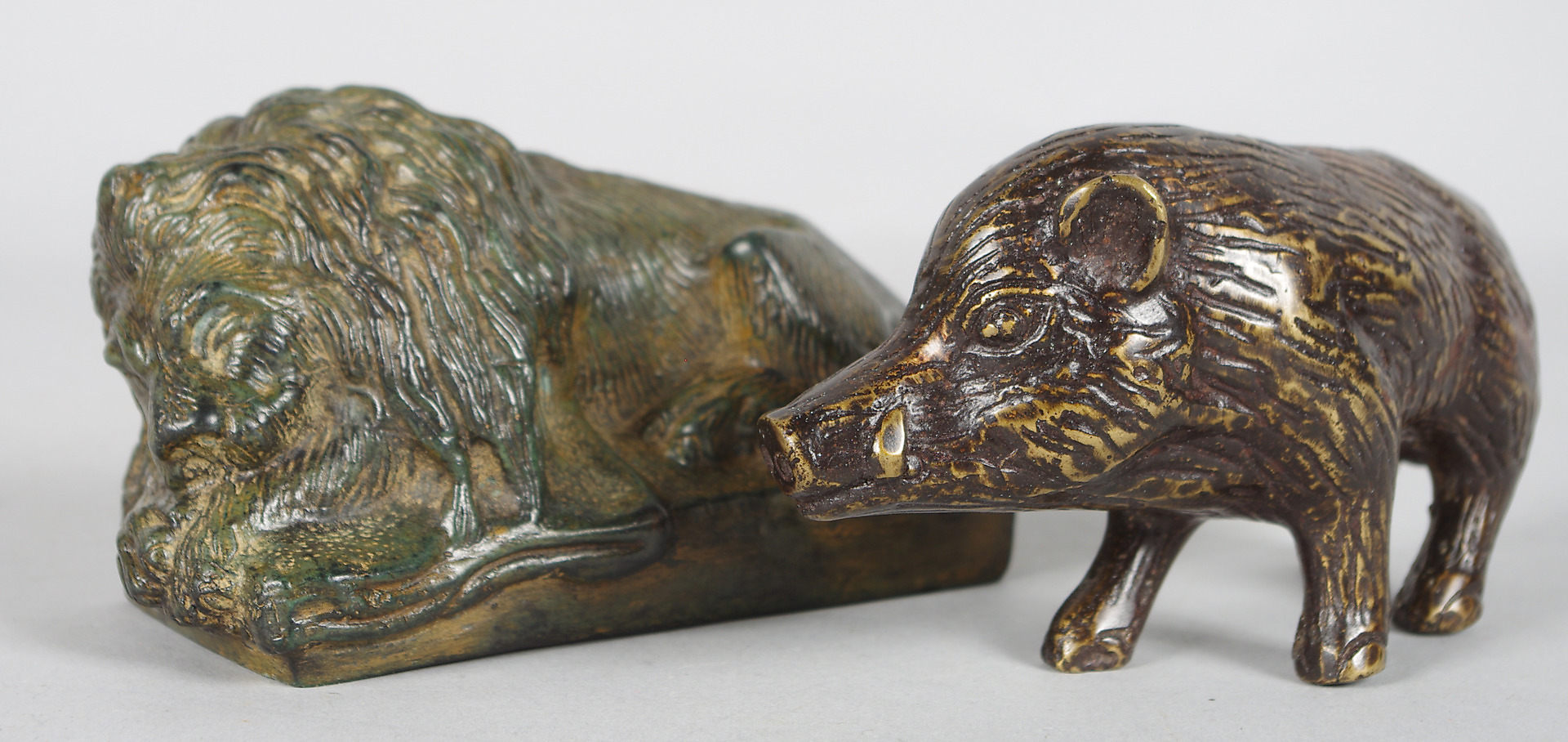 108406. BUCHDRUCKER UND BRONZESKULPTUR, Löwe und Wildschwein.