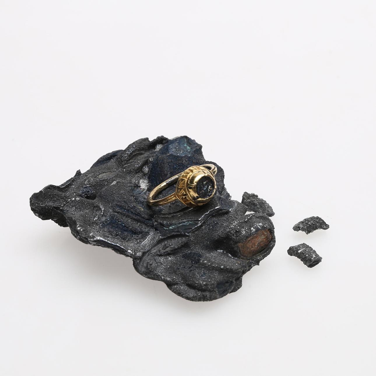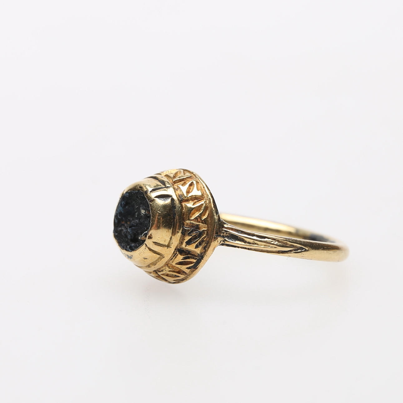 defekter Stein, Gewicht 4,5 Gramm, Durchmesser ca. 17 mm. Ein beigefügtes Dokument beschreibt, dass der Ring zusammen mit einigen Münzen 1982 in einem begleitenden Lavaklumpen auf Mallorca gefunden wurde.