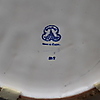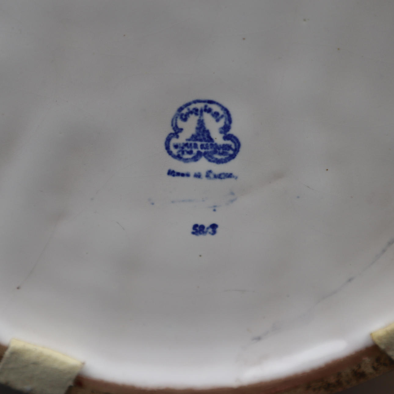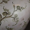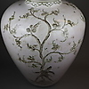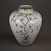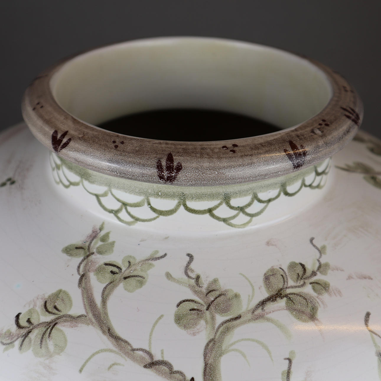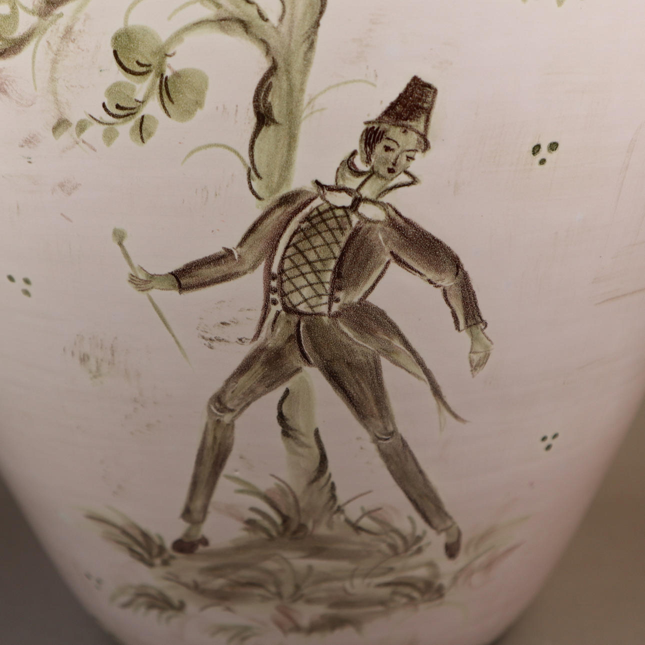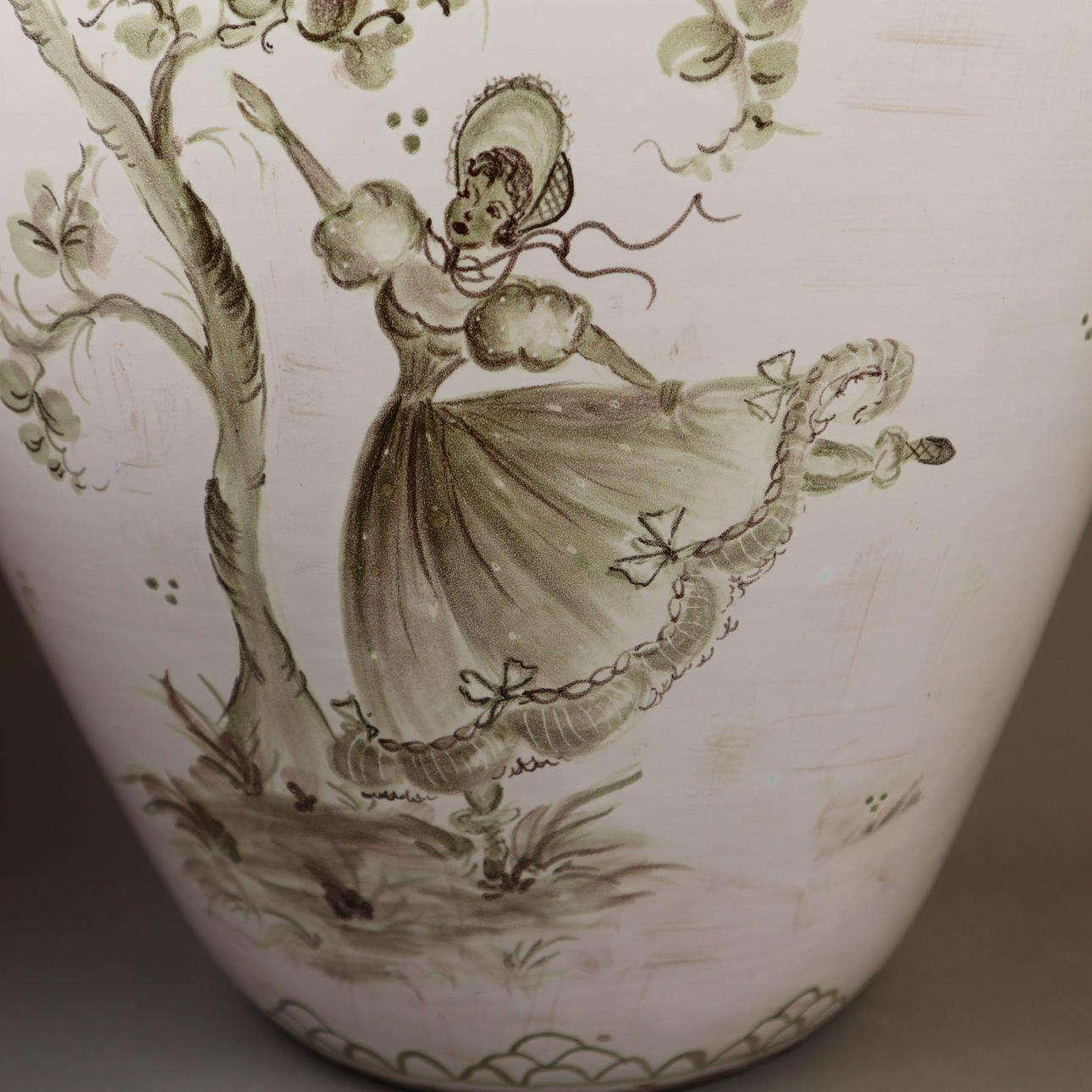 Bodenvase - Ulmer Keramik, grauer Scherben/heller Scherben eierschalfarben lasiert, über rundem Stand ansteigende Wandung mit weiter gerundeter Schulterpartie, eingeschnürtem Hals und leicht auskragender Mündung, umlaufend handbemalt mit figürlichen Paarszenen unter blütenbesetzten Bäumen in monochromer Malerei, grün gehöht, auf Unterboden leicht verwischte blaue Stempelmarke und Nummerierung 58/3, Höhe ca. 51 cm, Gesamtdurchmesser ca. 38 cm, Durchmesser der Vasenöffnung, außen : ca.18 cm, Mitte 20.Jh.