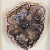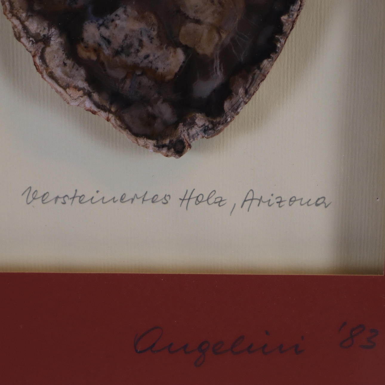 Versteinertes Holz - Arizona, mehrfarbige, polierte Scheibe, ca.12,5x10,5cm, mit PP unter Glas gerahmt, PP sign. "Angelini '83", Rahmen ca. 31,5 x 25 cm.