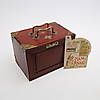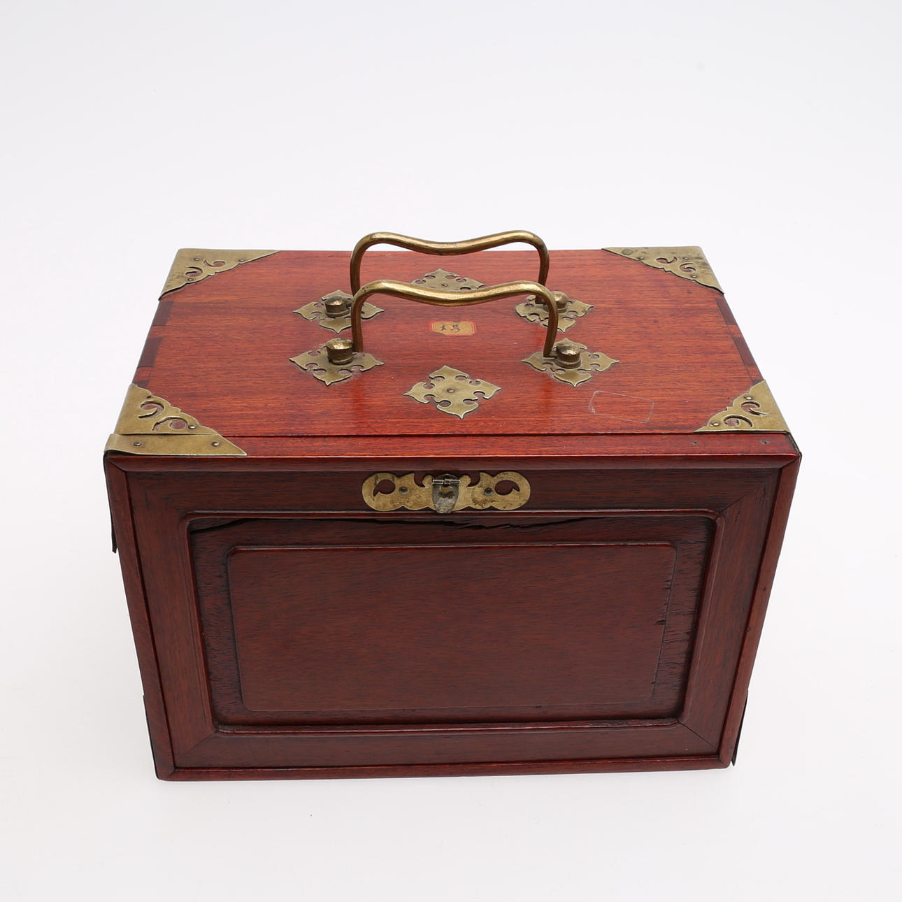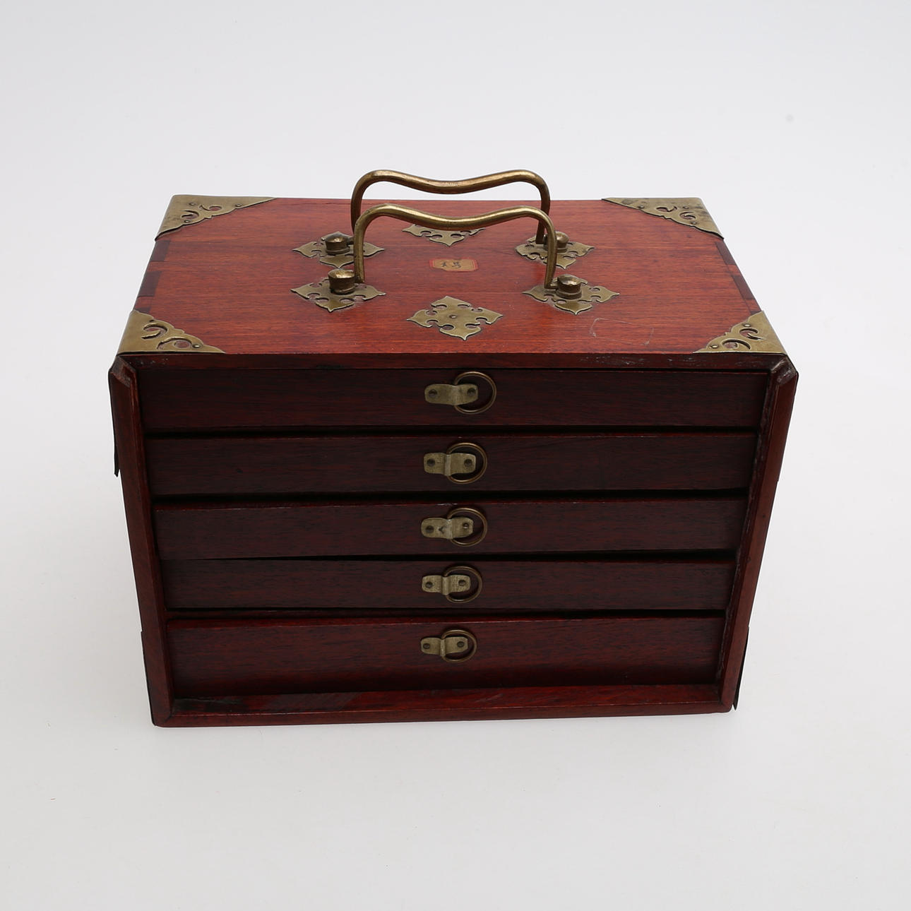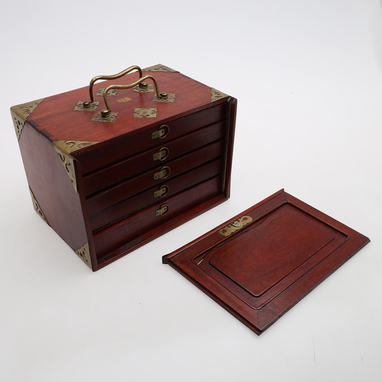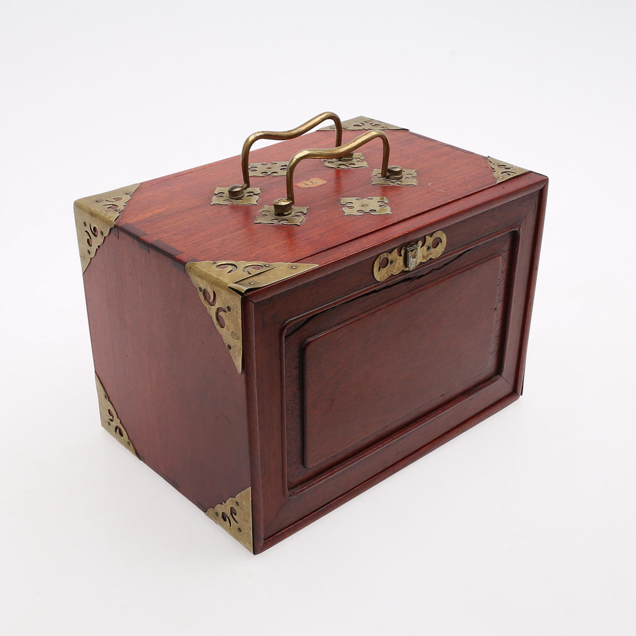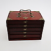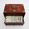 Zählstöcke, Zählscheibe, Würfel, Windmarker mit Schatulle und Etui mit vier Mahagonischubladen mit Messingbeschlägen, 1. Hälfte 20. Jahrhundert.