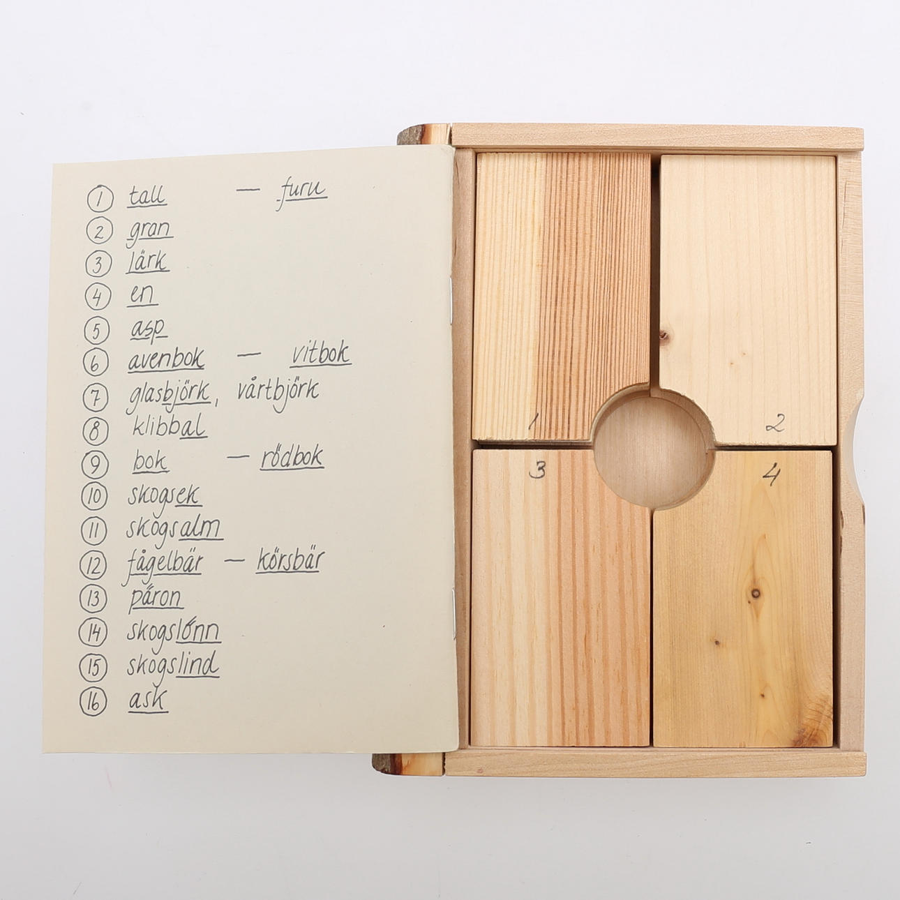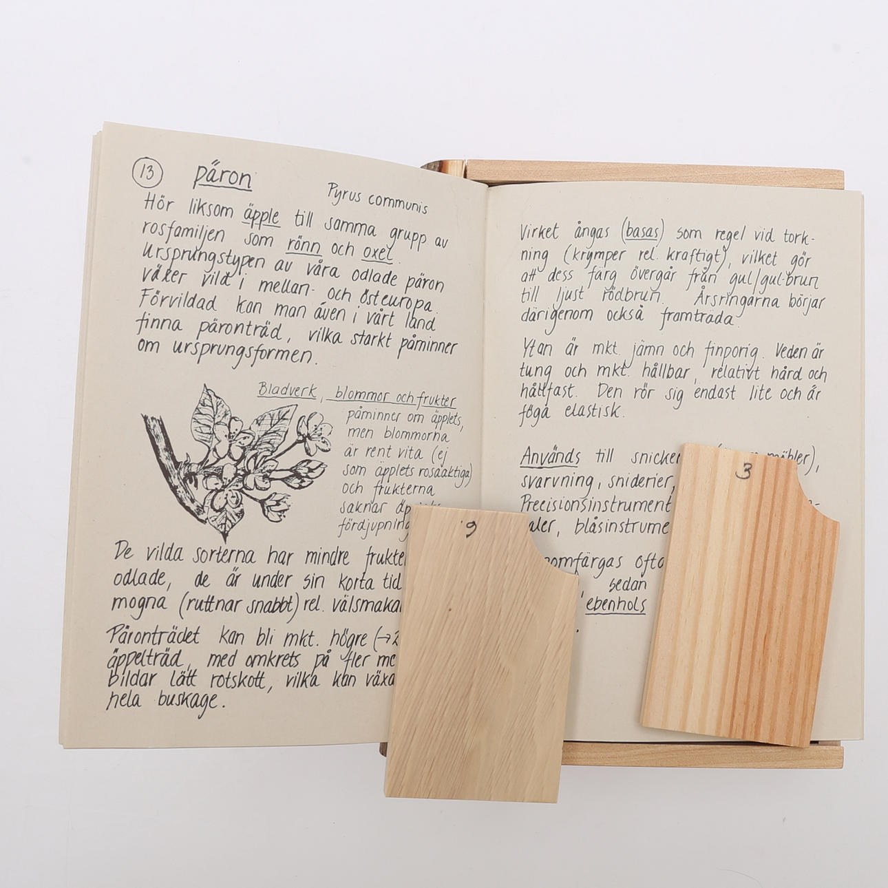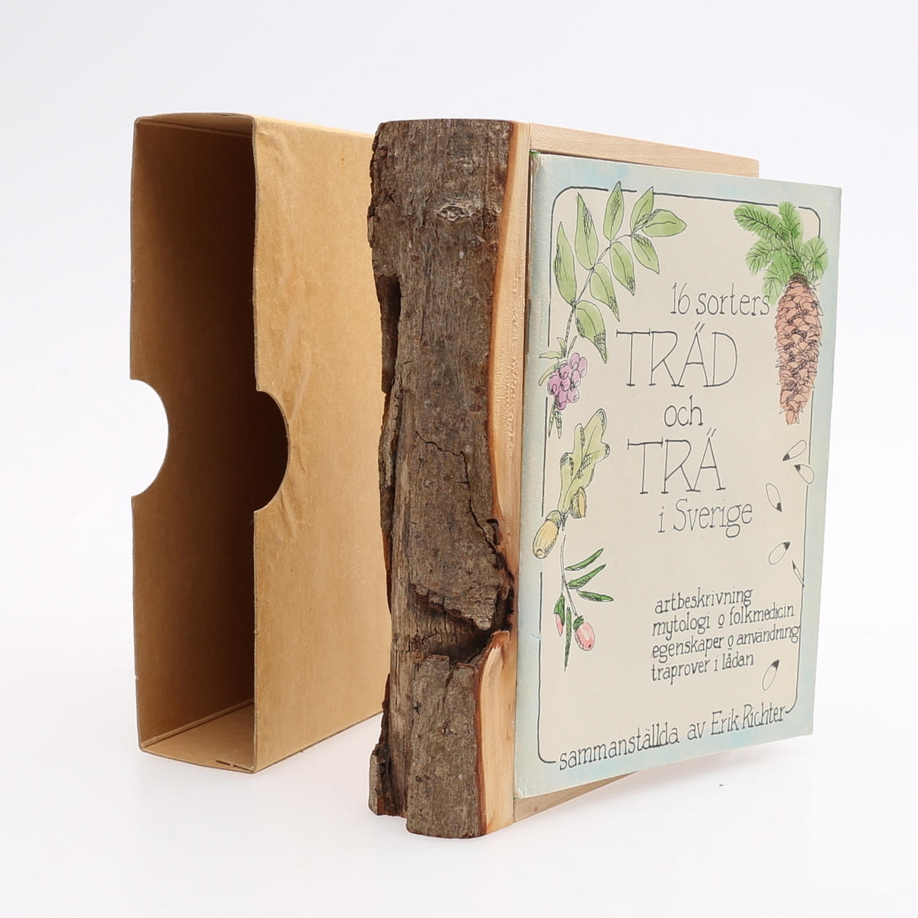 Baum. 16 Holz- und Baumarten. Baumbuch, zusammengestellt von Erik Richter im Jahr 1987 als Souvenir für eine Holzausstellung auf Schloss Läckö, Lidköping. Hier in der 4. Auflage von 1994. Herausgegeben von Norrgavel in Lund. Eine fein geschnitzte Birkenschachtel in Form eines Buches, dessen Rückseite mit Rinde bedeckt ist. In der Box mit Plexiglasdeckel befinden sich 16 Holzmuster. Im Heft werden die 16 Bäume/Holzarten beschrieben, jede mit ihrer eigenen Verbreitung. Der Text über Herkunft und Wachstumsbedingungen des Baumes, Mythen und Volksheilkunde sowie Eigenschaften und Verwendung des Holzes. Aufbewahrt in einem einfachen Karton.