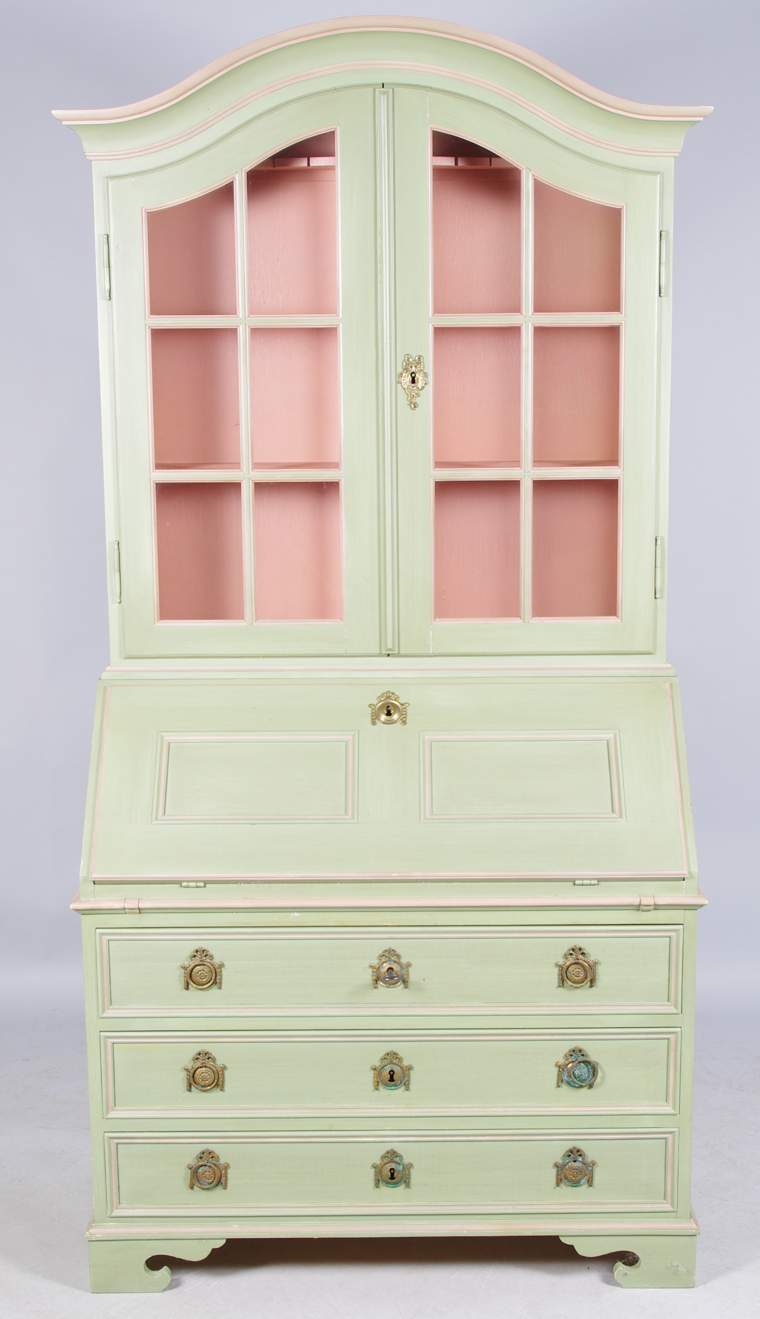 114236. SEKRETÄR MIT VITRINENPLATTE, grün lasiert, KA Roos.