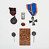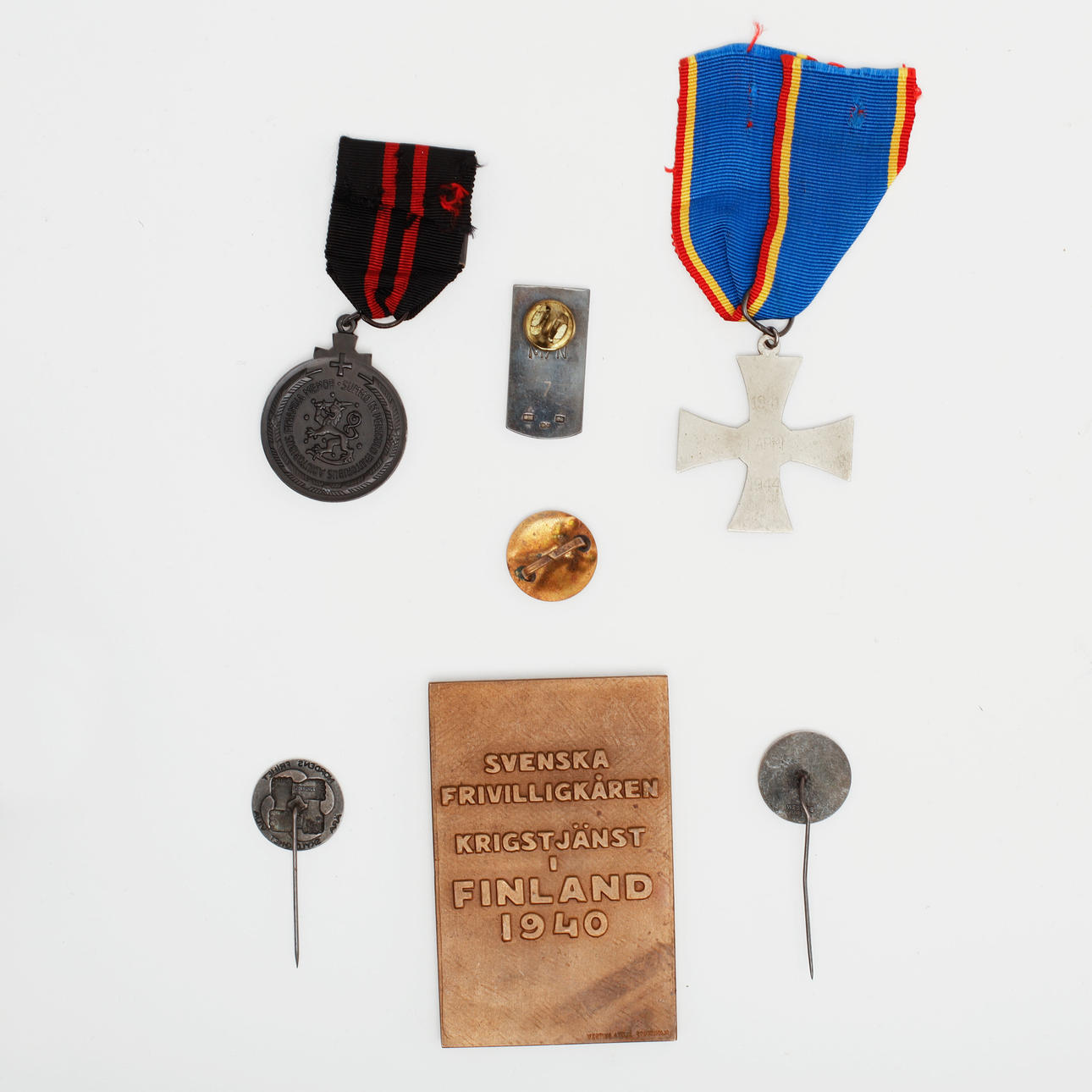 Das Fortsetzungskriegs-Gedenkkreuz, 2 Spendenabzeichen, Gedenkabzeichen, Winterkriegs-Gedenkmedaille für Ausländer, schwedisches Freiwilligenkorps-Kampfabzeichen, Gedenktafel für das schwedische Freiwilligenkorps.