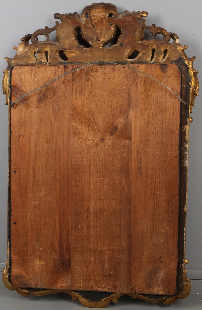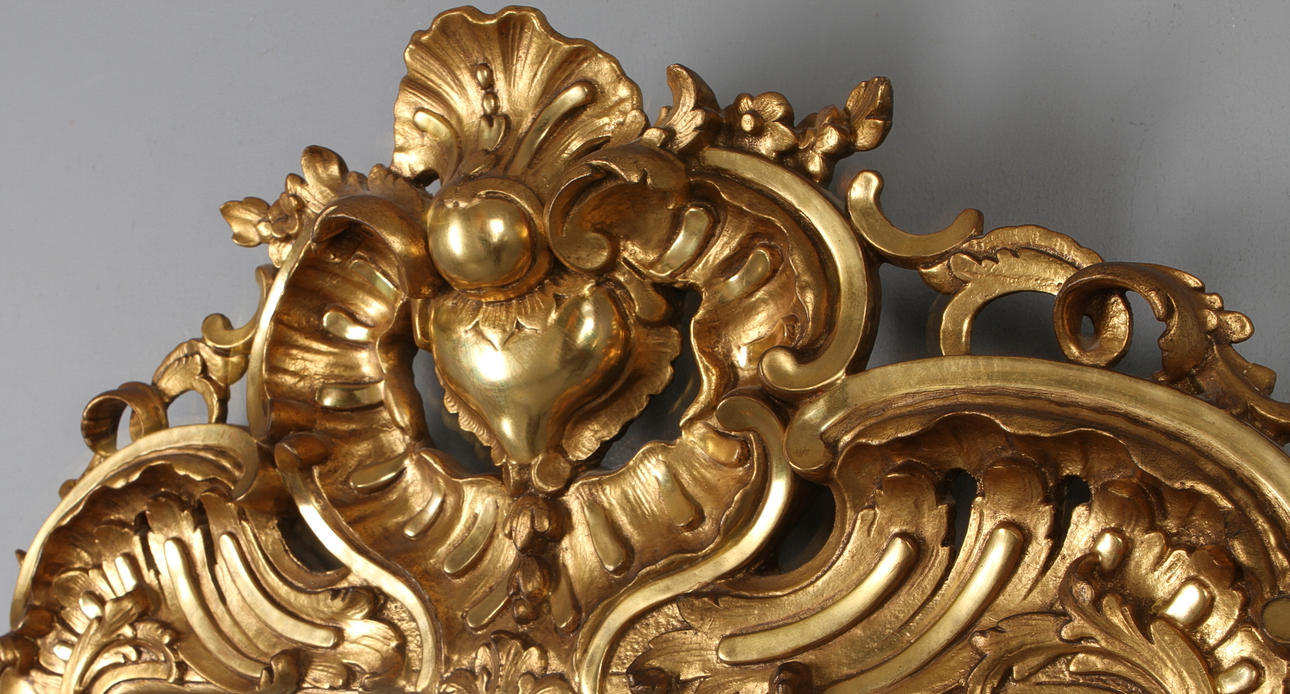 Bronziertes und vergoldetes Dekor. Durchbrochene Krone und Dekoration ua mit Rocaillen. Höhe 104, Breite 66 cm.
