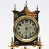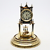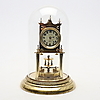 Eine deutsche 400-Tage-Jubiläumsuhr mit verschiedenen Schlüsseln aus dem 20. Jahrhundert, lackiertem Messing in konventioneller Form mit originaler Glaskuppel und einer Auswahl an sortierten Aufzugsschlüsseln, insgesamt 28 cm hoch.