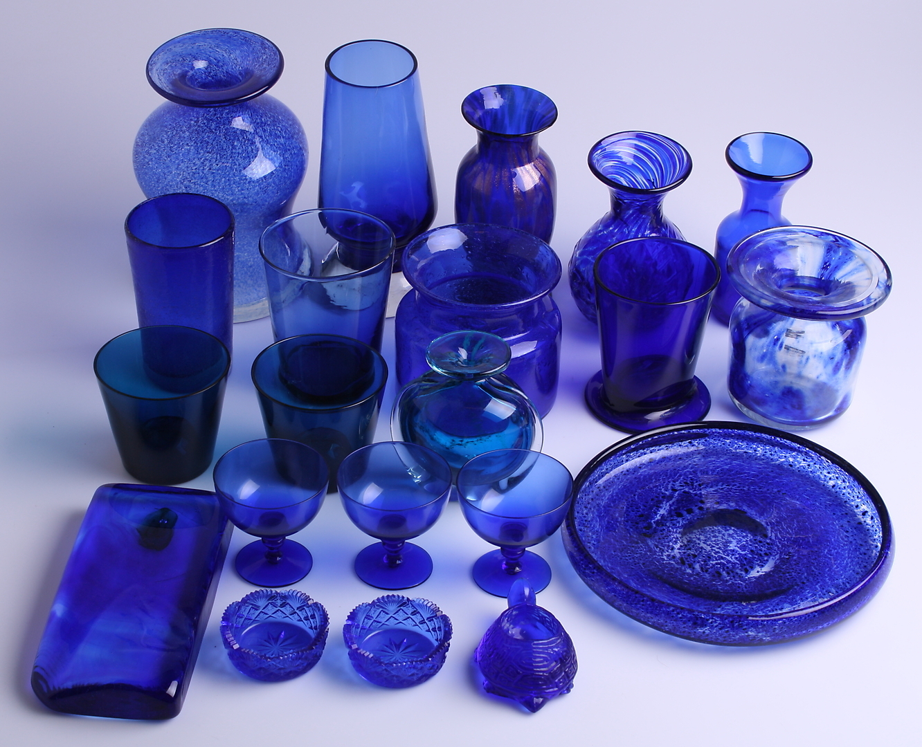 118564. GLASOBJEKTE, 21 Stück, blau gefärbt, davon 2 grün getönt.