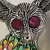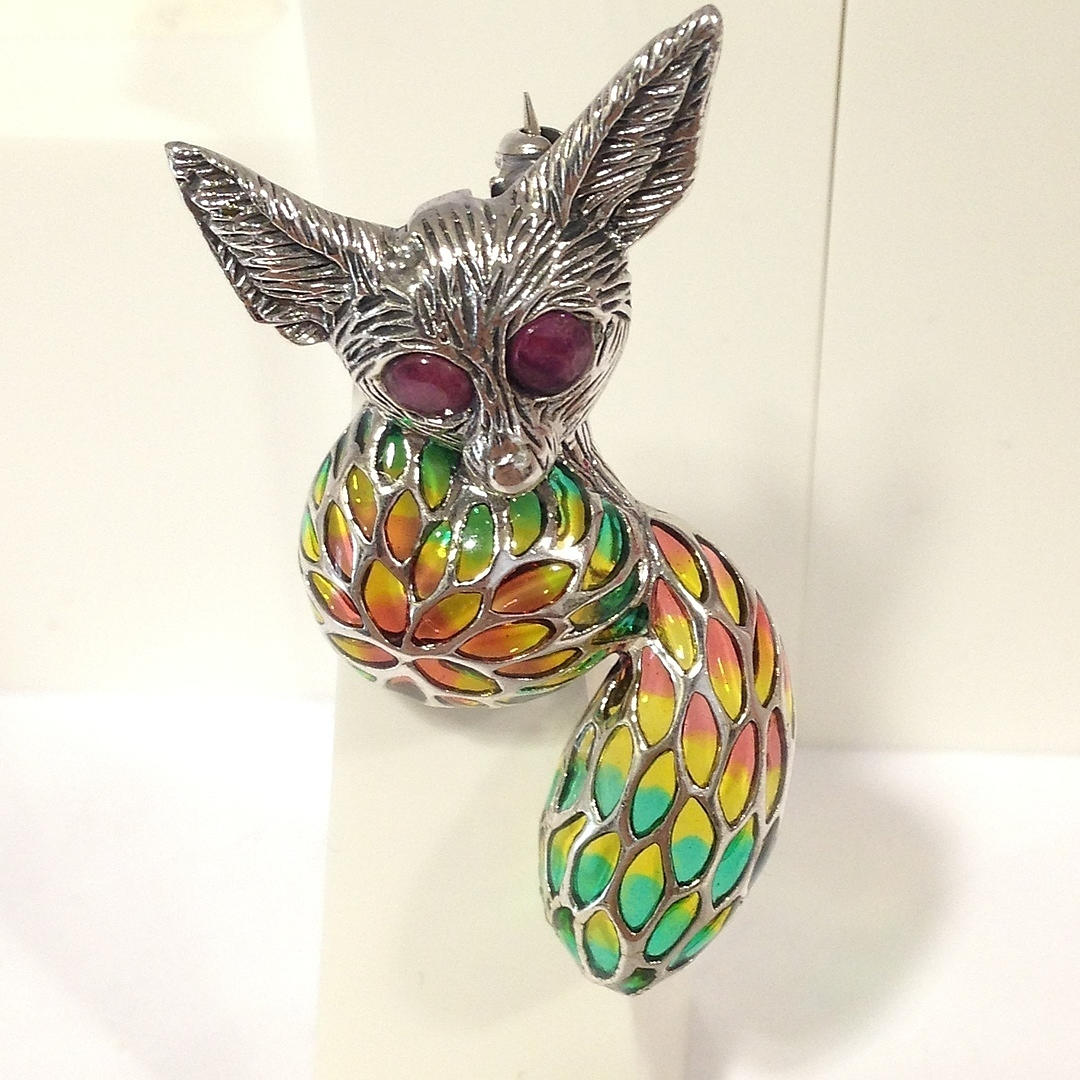Ein Fennek-Fuchs-Anhänger / Brosche mit Rubin besetzt und mit mehrfarbiger Emaille eingelegt.