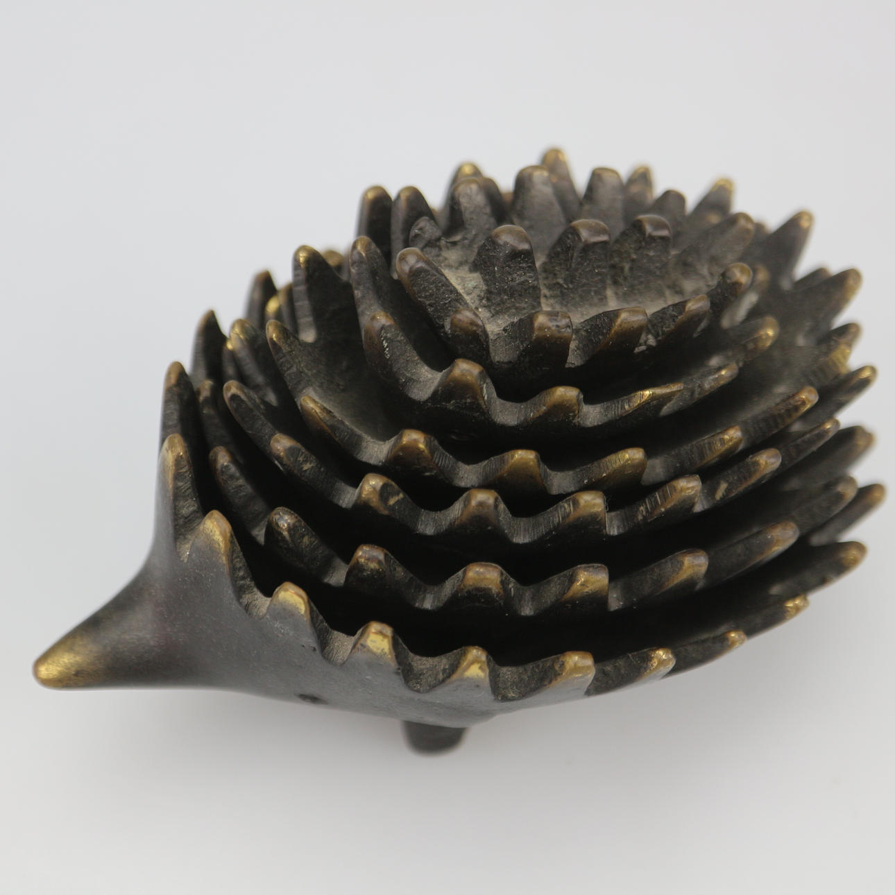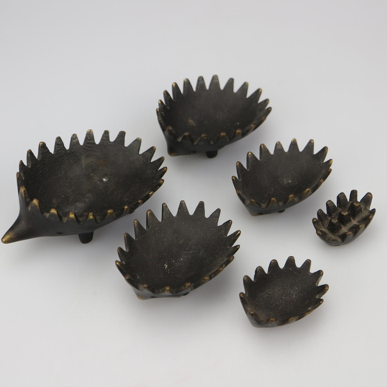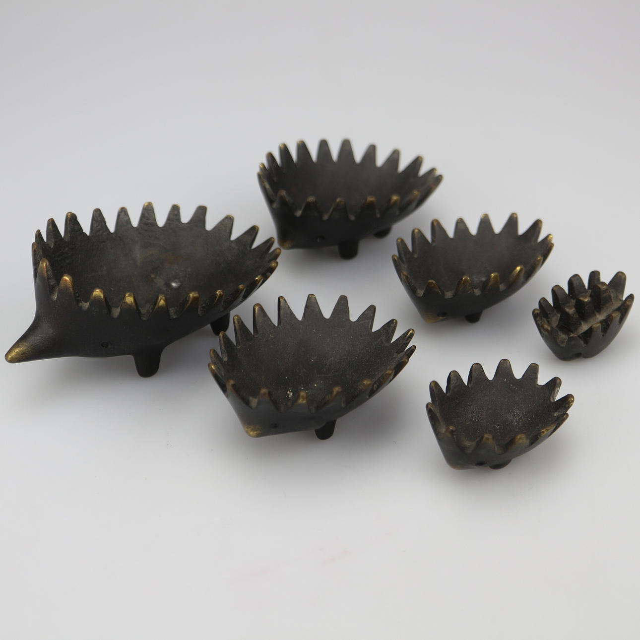 Original 6-teiliger Igel. Design von Walter Bosse für Hertha Baller. Österreich, 1950er Jahre, geschwärztes Messing. 12 x 8 x 7 cm.