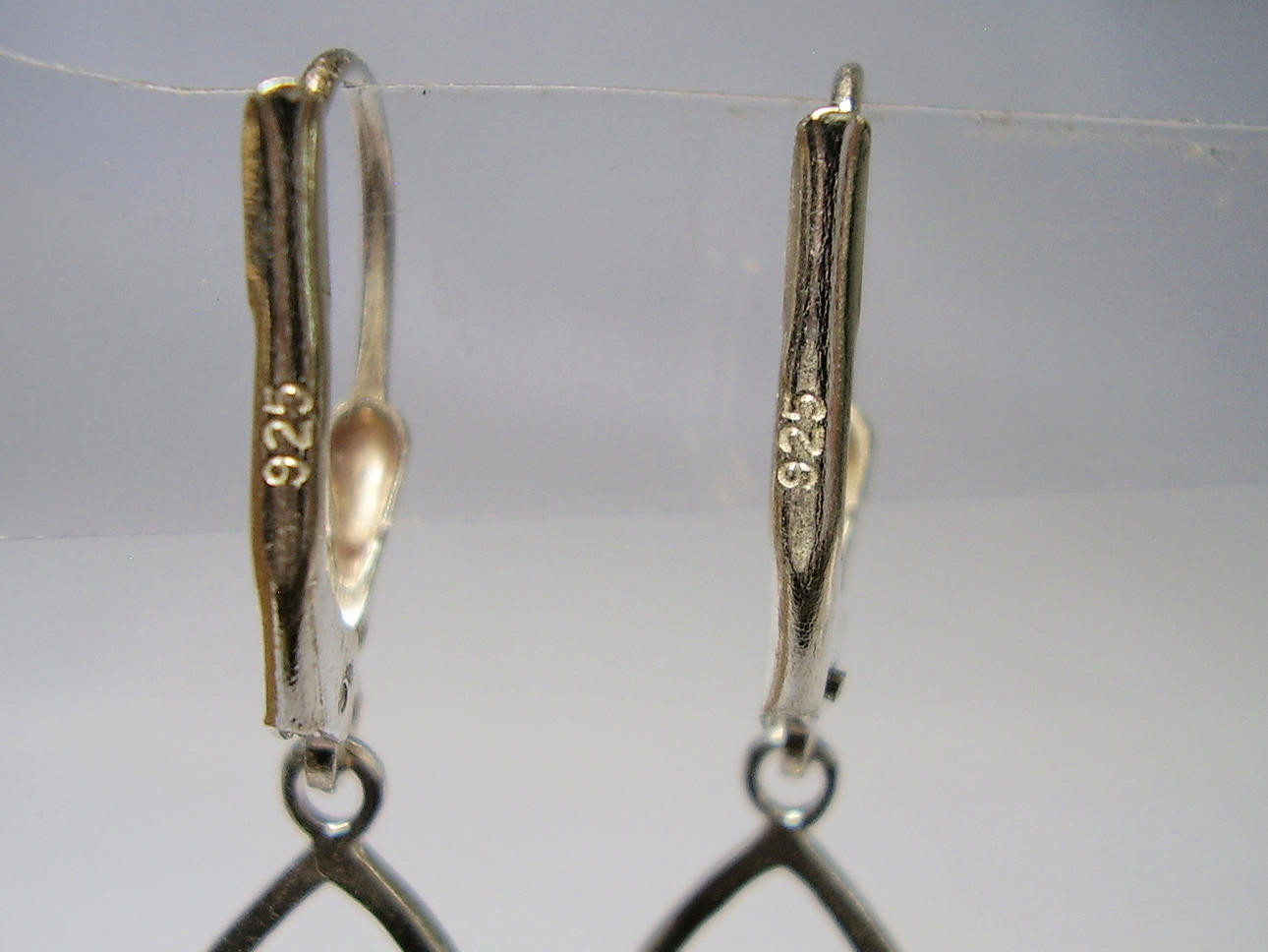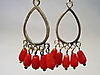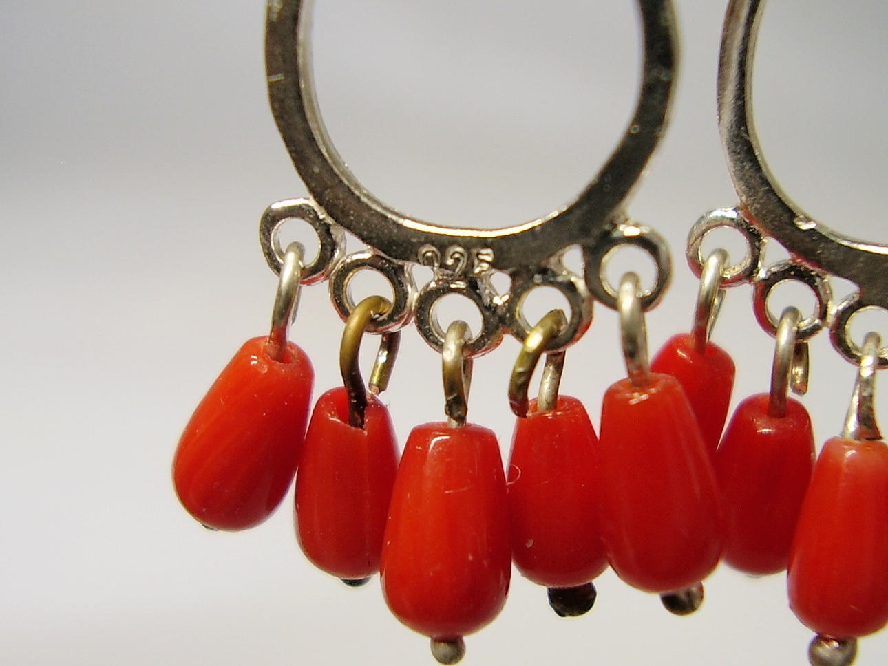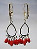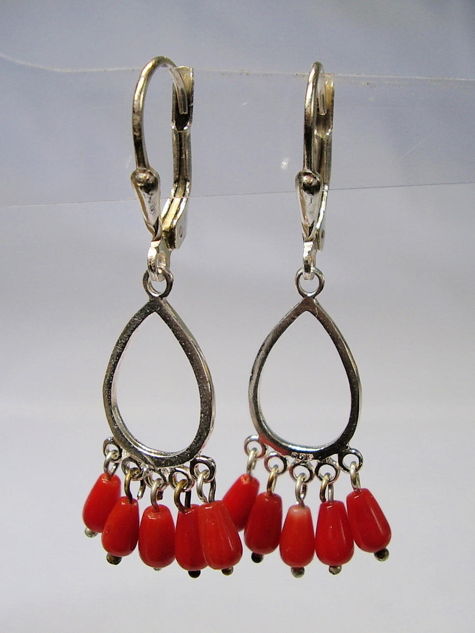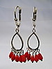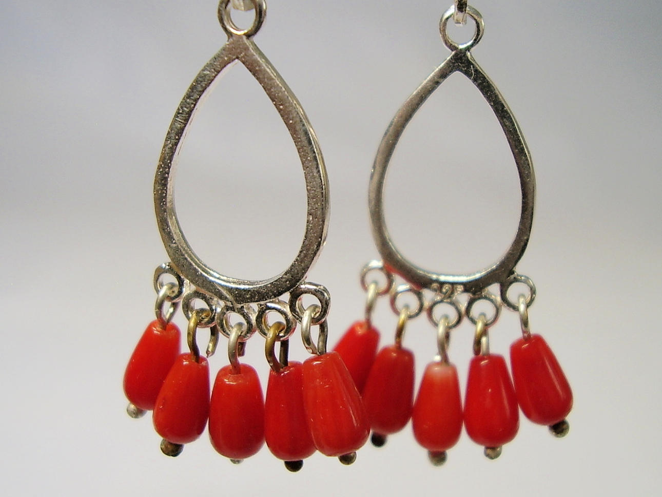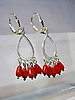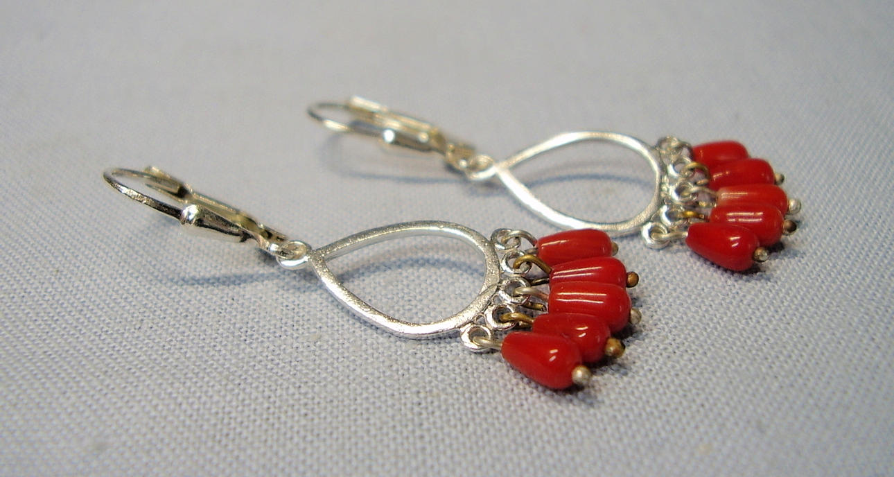 Die Ohrringe sind in Silber 925 gearbeitet und auch so punziert. Sie sind mit Klapp-Ohrbügeln ausgestattet. Daran hängen ovale, offene Silber-Tropfen die unten insgesamt 10 glänzende, rote Korallen tragen. Diese Korallen sind in Tropfenform geschnitten, fein poliert und beweglich abgehängt.