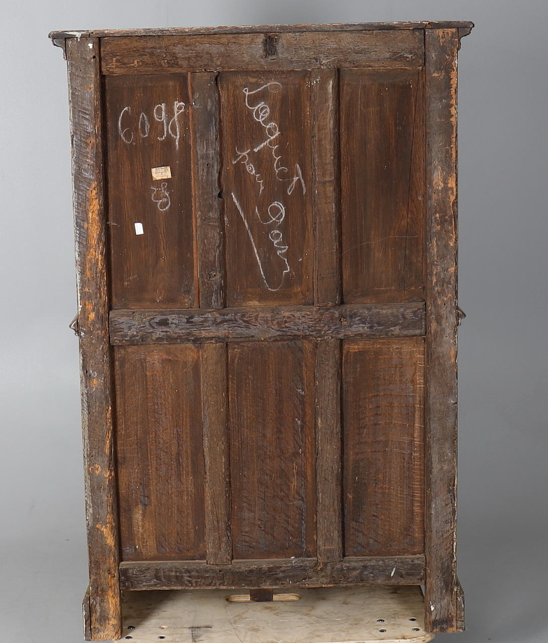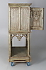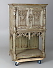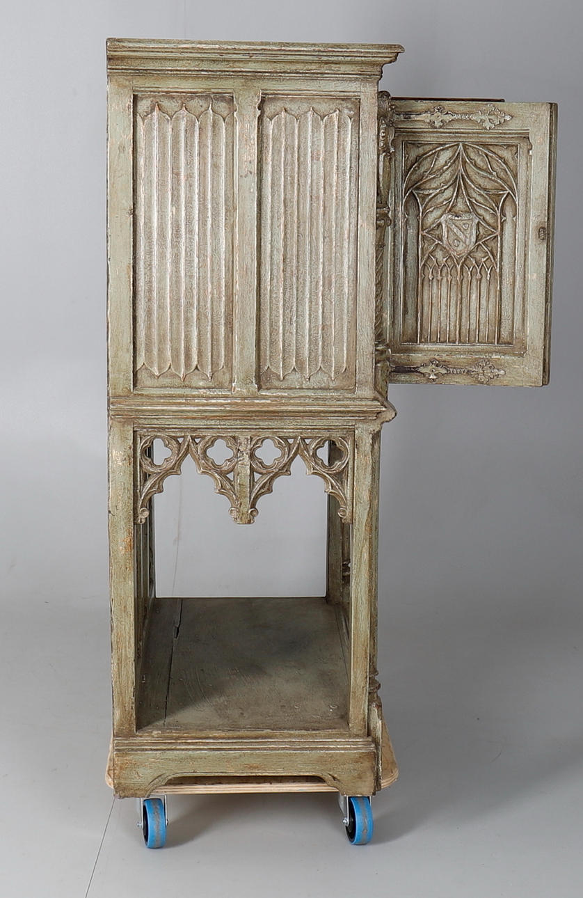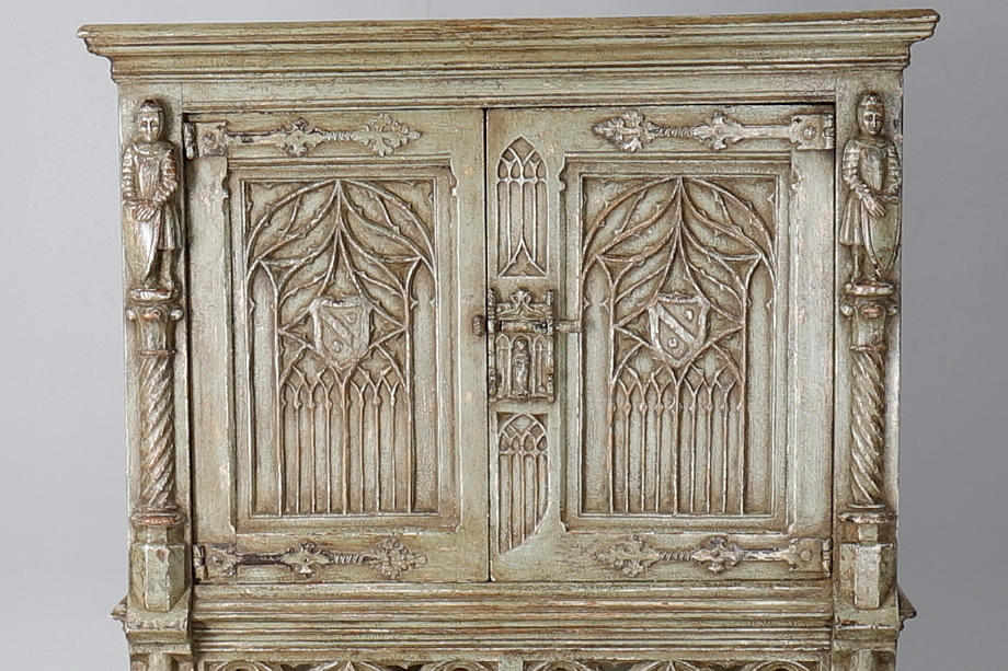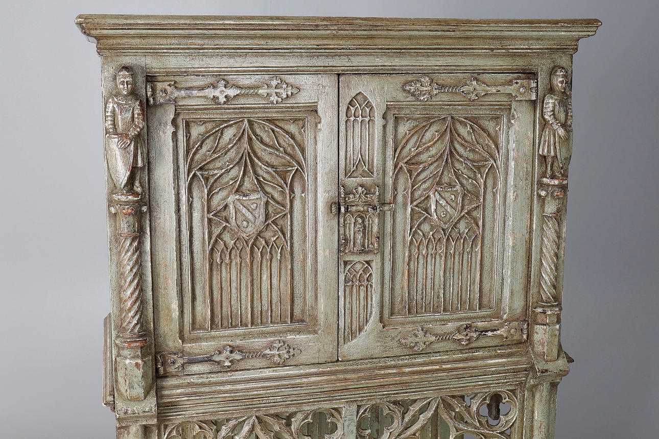 ca. 1900, jetzt mit Grünspan-Lackierung, zwei gotische Maßwerktüren, flankiert von Kreuzfahrerrittern an den Ecken, Regal innen, über den Beinen durch Unterlage verbunden, das Ganze mit gotischen Schriftrollenschnitzereien und Leinenfalten an Seiten und Boden, 96 cm breit, 96 cm breit, 146 cm hoch, 46 cm tief.