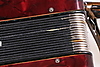 Eine Balg-Metallabdeckung fehlt oben, eine kurze seitliche Holzleiste fehlt, Plastikabdeckung oben an den Klaviertasten fehlt, der Riemen zum Verriegeln des Akkordeons ist gebrochen, Kratzer und Flecken, Kartontürkasten.