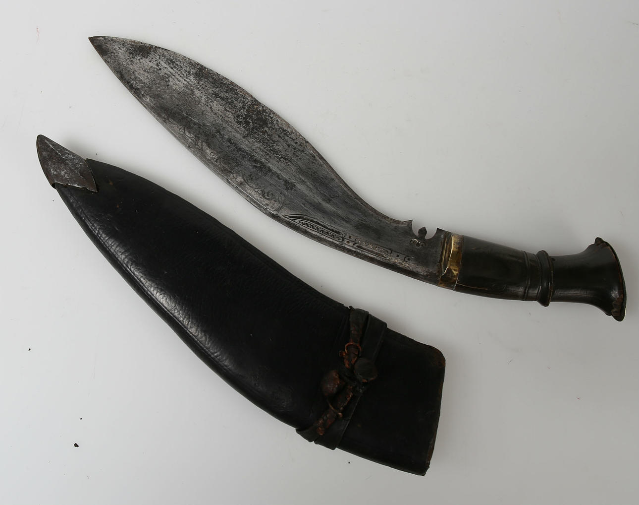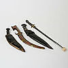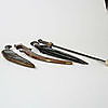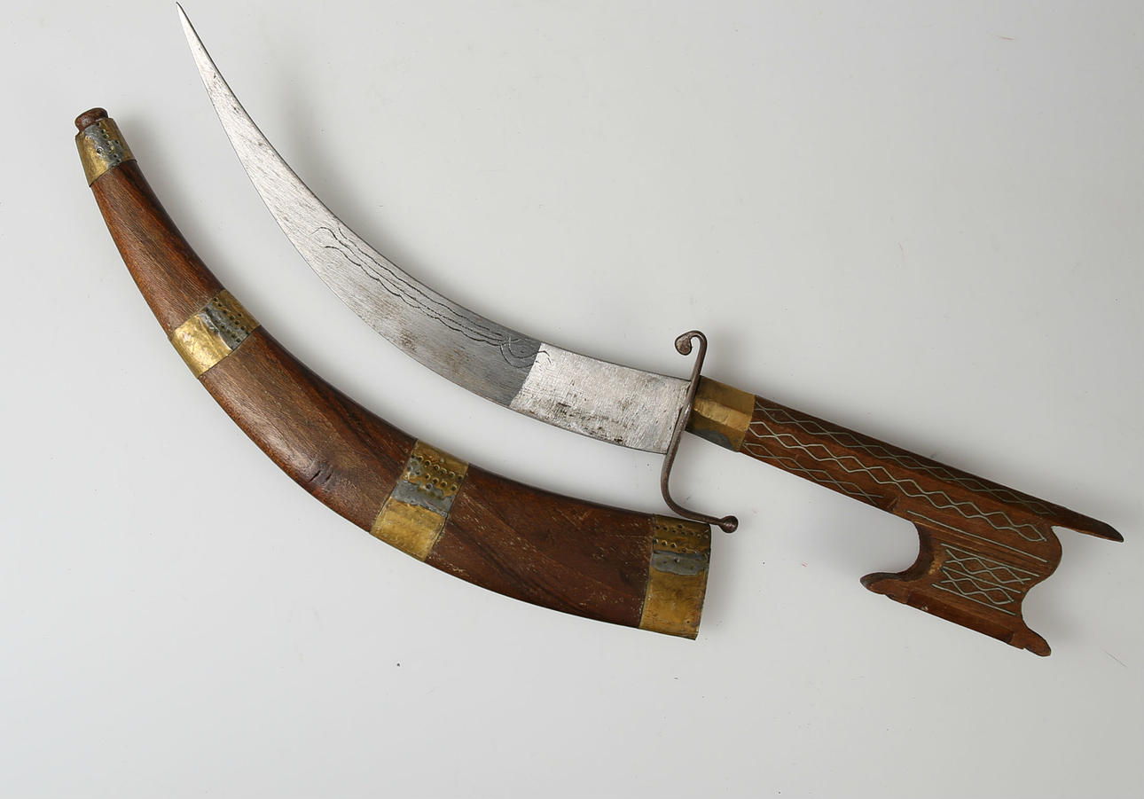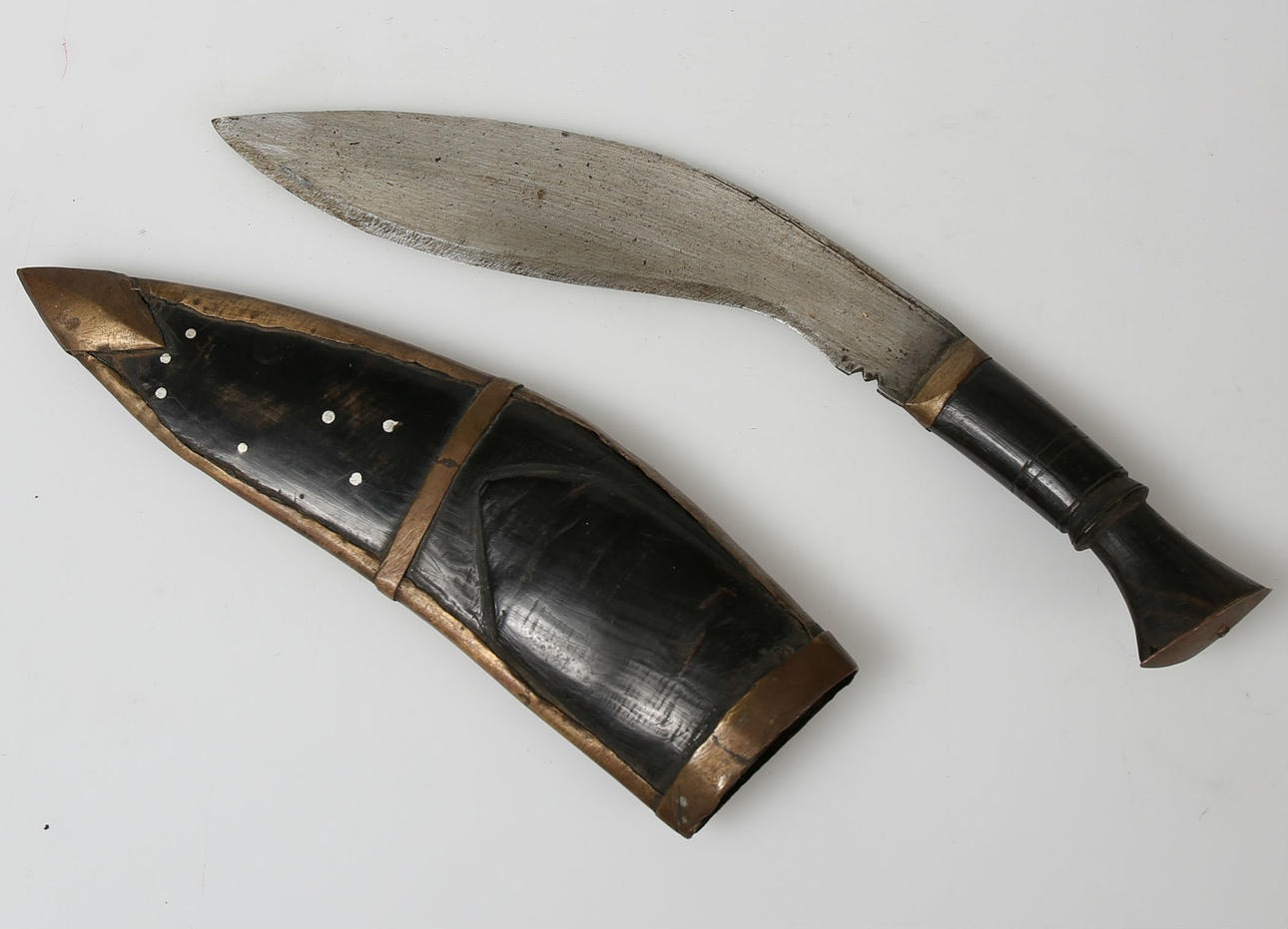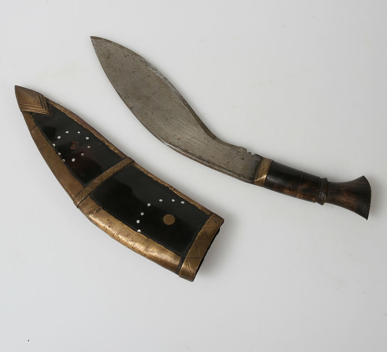 Original Khukri, Griff aus Horn und Lederscheide, Nepal, Länge 38 cm Khukri zur Dekoration, Griff und Scheide aus Horn und Messing, Länge 32 cm Messer, Algerien, Länge 39 cm Dolch, nachgefertigt aus Schwert, Mitte des 18. Jahrhunderts, Länge 48 cm.