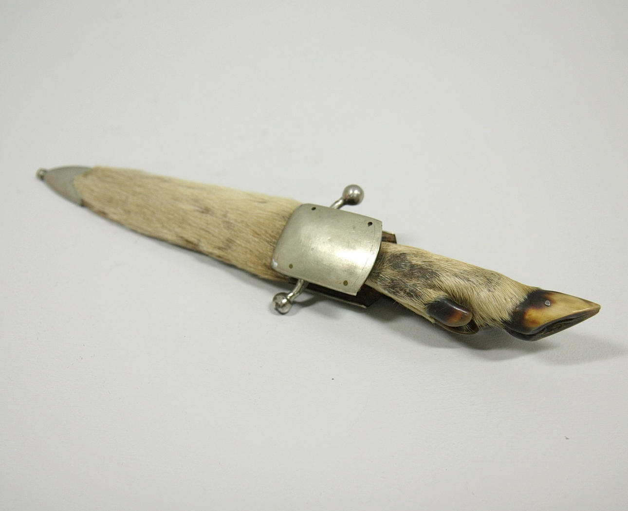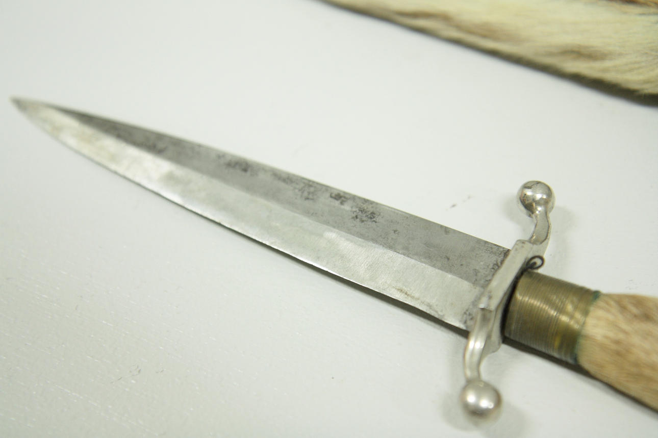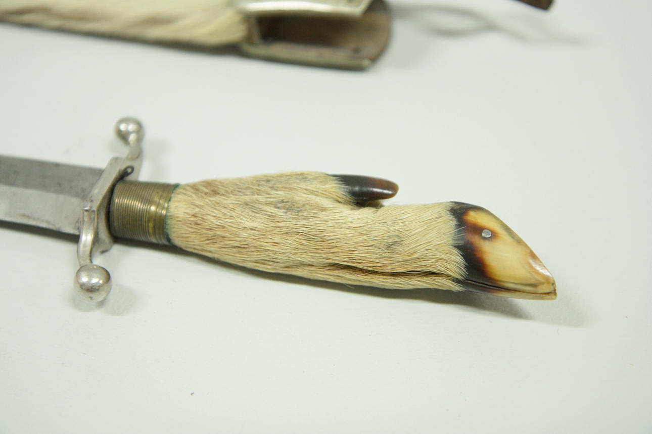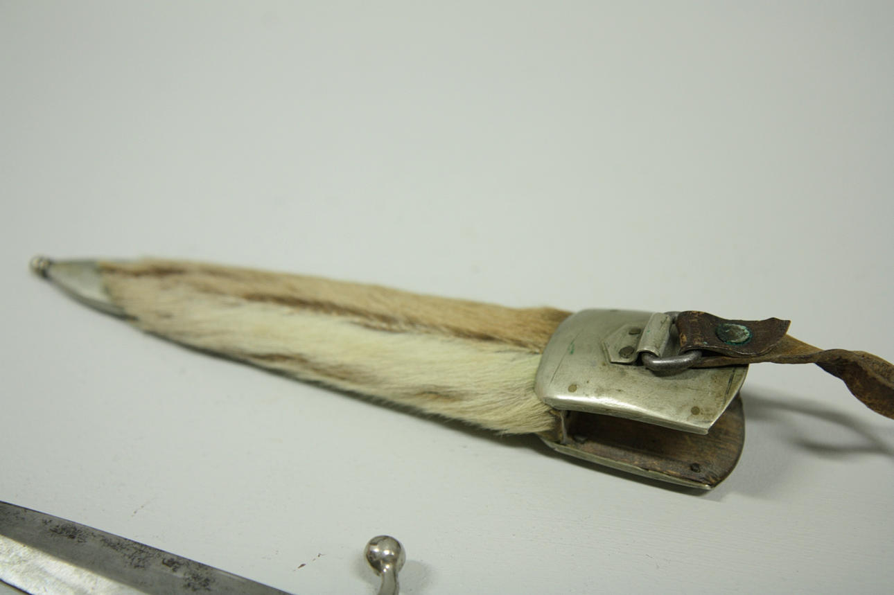 Griff aus Huf und Fell und Scheide mit Fell bezogen.