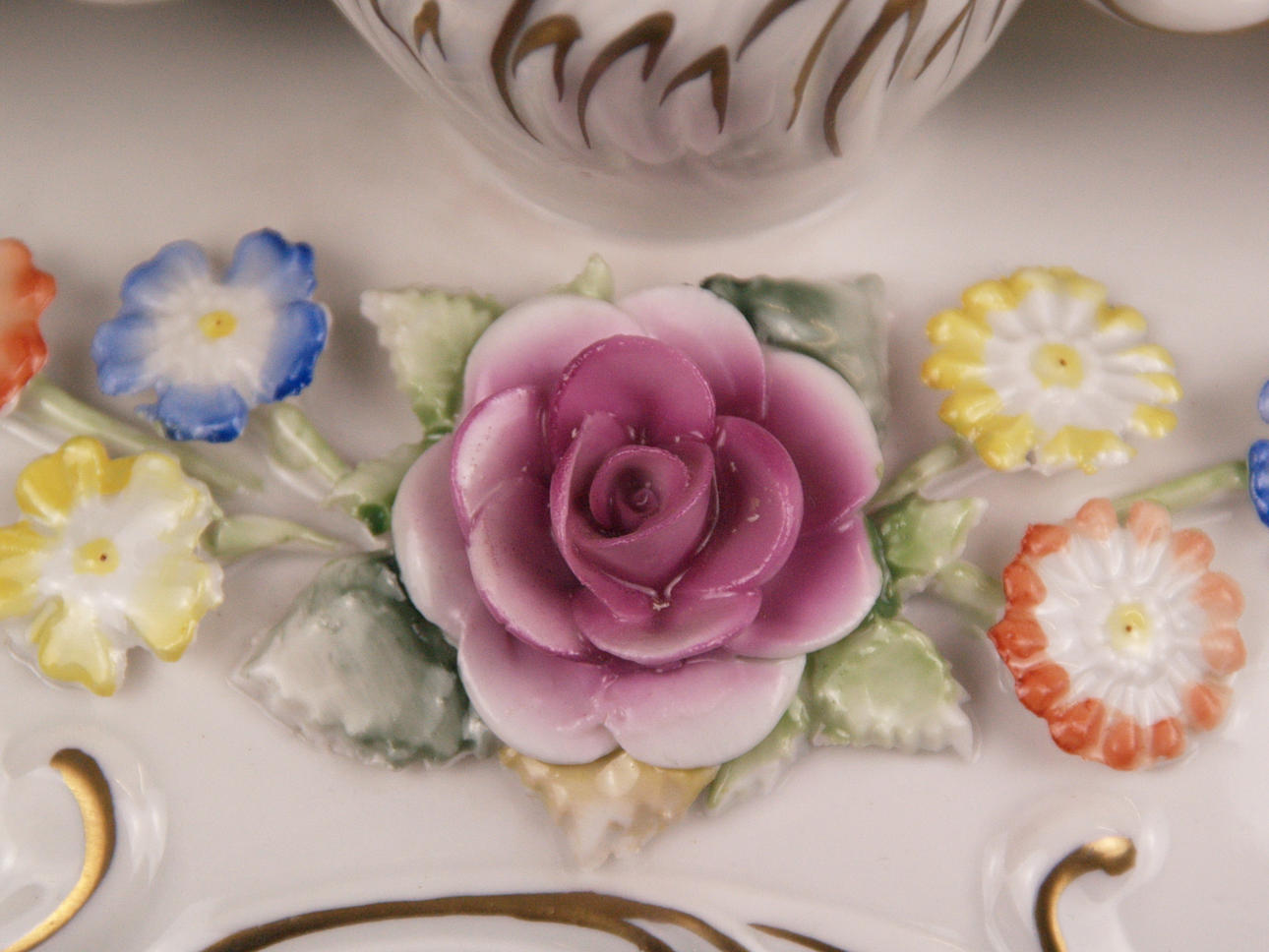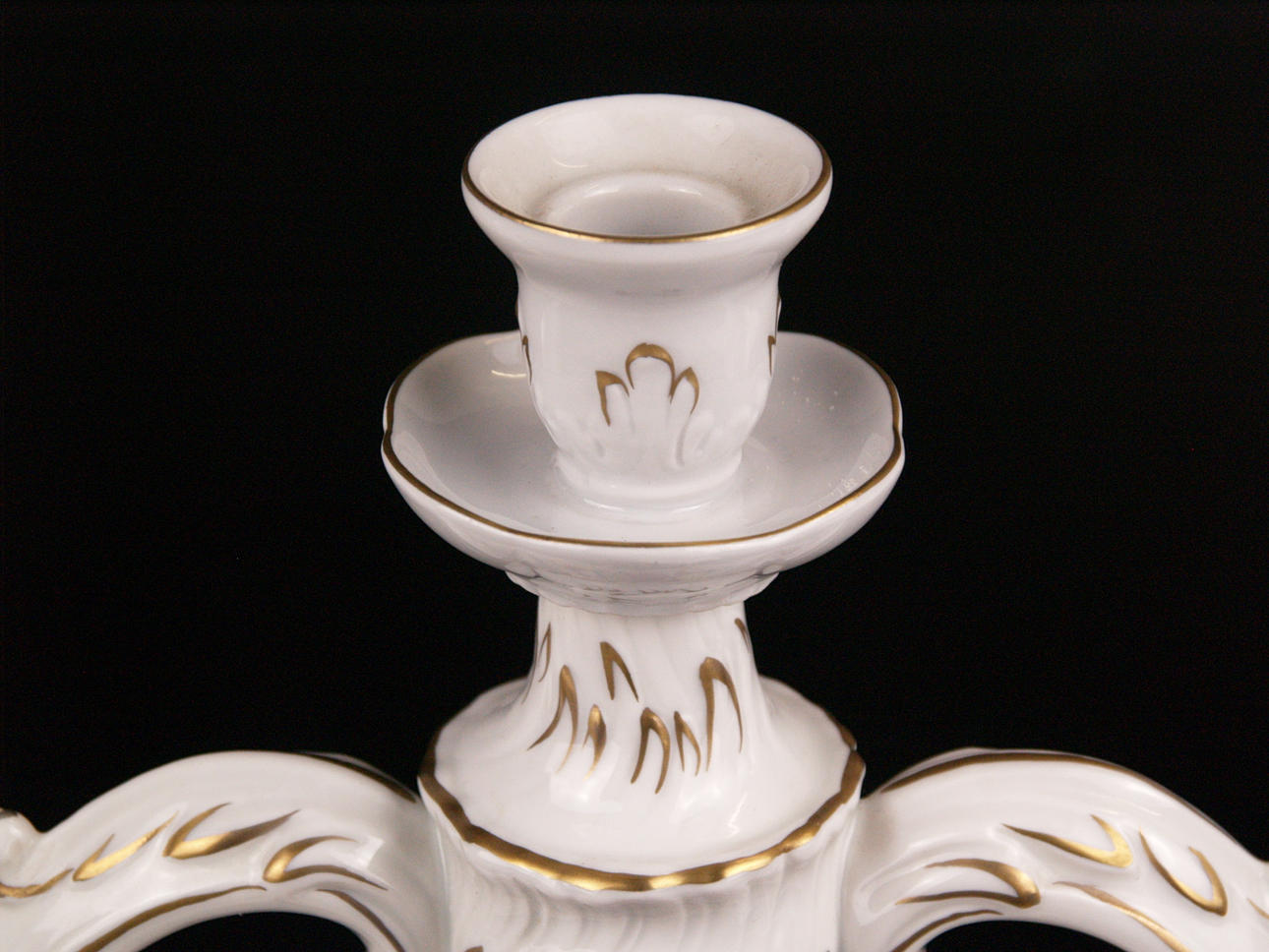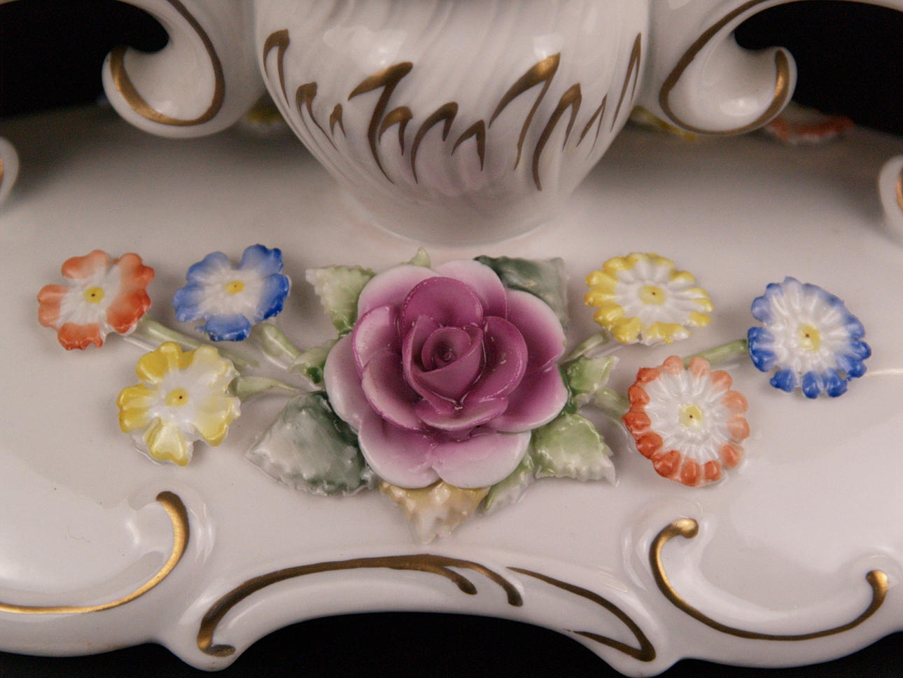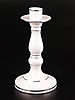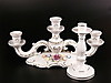 Zwei Leuchter - Schierholz, Plaue, Thüringen, 20. Jh., 1x 3-flammig, geschwungene Arme und Sockel, vasenförmige Tüllen, Rocailledekor, besetzt mit plastischen Blüten, polychrom bemalt, ziervergoldet, min. Chips, H. 18 cm, B. 34 cm; 1x 1-flammig, runder Stand, Balusterschaft, Platinstaffage, H.ca.18,5cm.