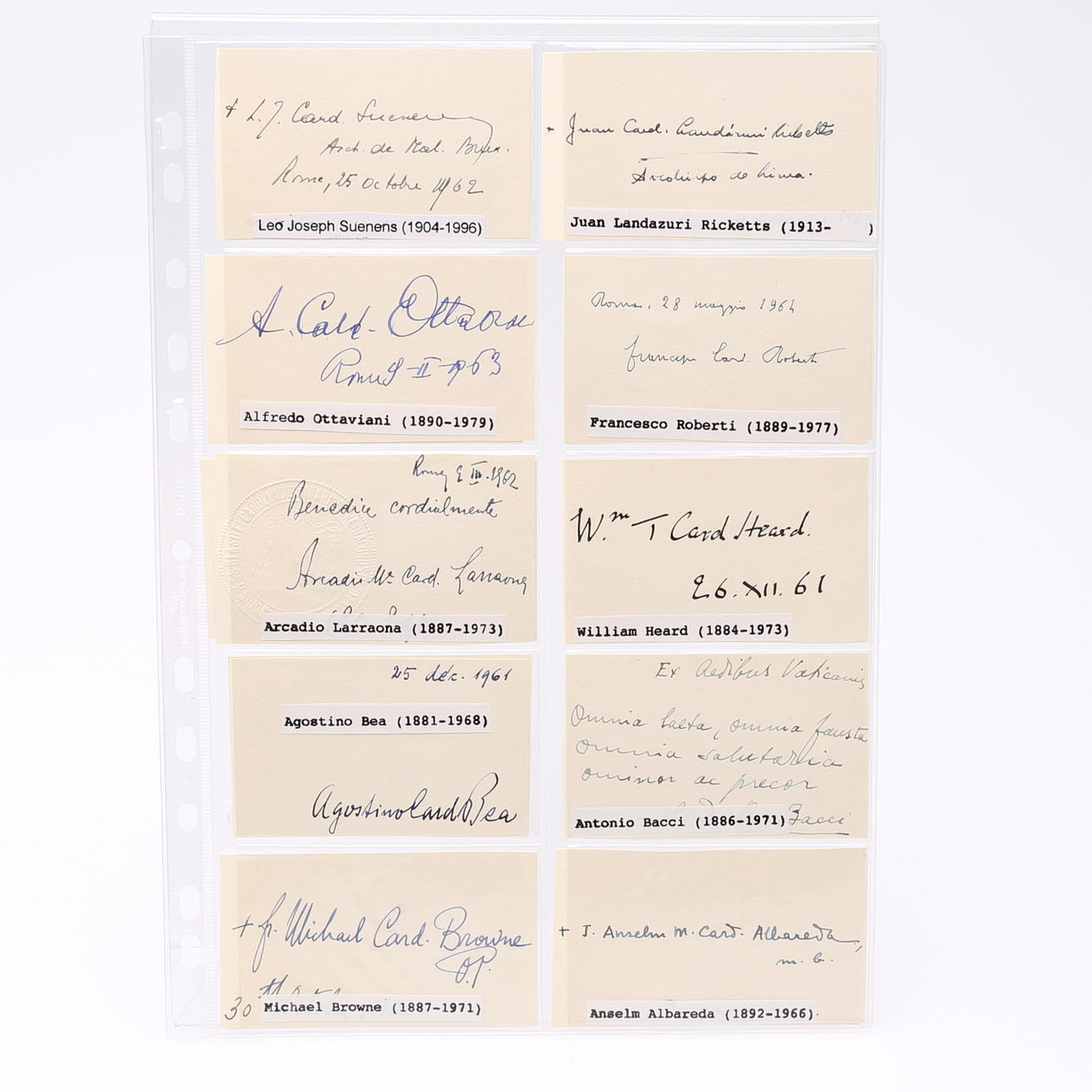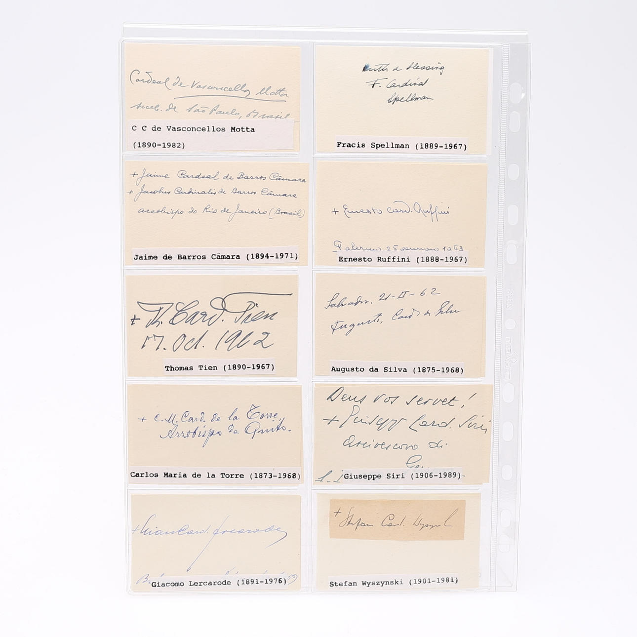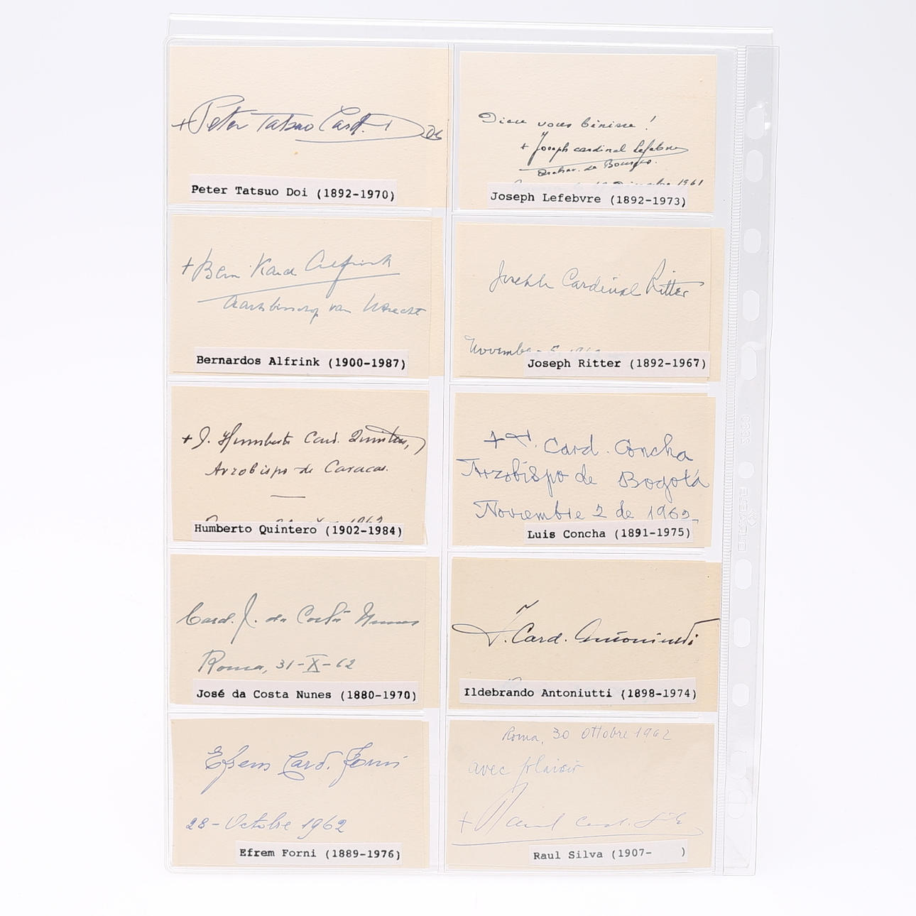 Theodor Innitzer, Eugene Tisserant, Aloisi Masella, Guiseppe Ferretto, Achille Lienart, Ignatio Gabriel Tappouni, Santiag Copello, Gregory Peter Agagianian, James McGuigan, CC de Vasconcellos Motta, Francis Spellman, Jaime de Barros Camara, Ernesto Ruffini, Thomas Thien, Augusti da Silva, Carlos Maria de la Torre, Guiseppe Siri, Gacomo Lercarode, Stefan Wyszynski, JF McIntyre, Fernando Quiroga, Paul Emile Leger, Giovanni Urbani, José Garibi Rivera, Antiono, Barbieri, Carlo Confalonieri, Richard Custing, José Bueno Monreal, Julius Döpfner , Peter Tatsuo Doi, Joseph Lefebre, Bernardos Alfrindk, Joseph Ritter, Humberto Quintero, Luis Concha, José de Costa Nunes, Ildebrando Antoniutti, Efrem Forni, Raul Silva, Leo Jospeh Suenens, Juan Landazuri, Ricketts, Alfredo Ottaviani, Franceso Roberti, Arcadio Larraona, William Heard, Agostono Bea, Antonie Bacci, Michael Browne, Anselm Albareda, Elia Dalla Costa, jsoeph van Roey, Clemente Micara, Clemet Roques, Carlo Chiarlo, John d´Alton, Valerio Val eri, Willam Godfrey, Albert Mayer, Francois Marty, CA Renard, Tomas O´Fiaich, Johannes Willebrands, Frantisek Tomasek, Alberto di Joria, Manuel Goncalves Cerejeira, Amleto Cicagnani, Norman Gilroy, Joseph Frings, B de Arriba y Castro, Valerian Gracias , Fernand Cento, Gustvo Testa, Rufino Santos, Franz König, Laurian Rugambwa, Jaime Sin, Josef Glemp und Achille Silvestrini Signiertes Foto – misst 9 cm. × 5,5 cm. . Provenienz: Sverker Hiort aus der Autographensammlung von Ornäs.