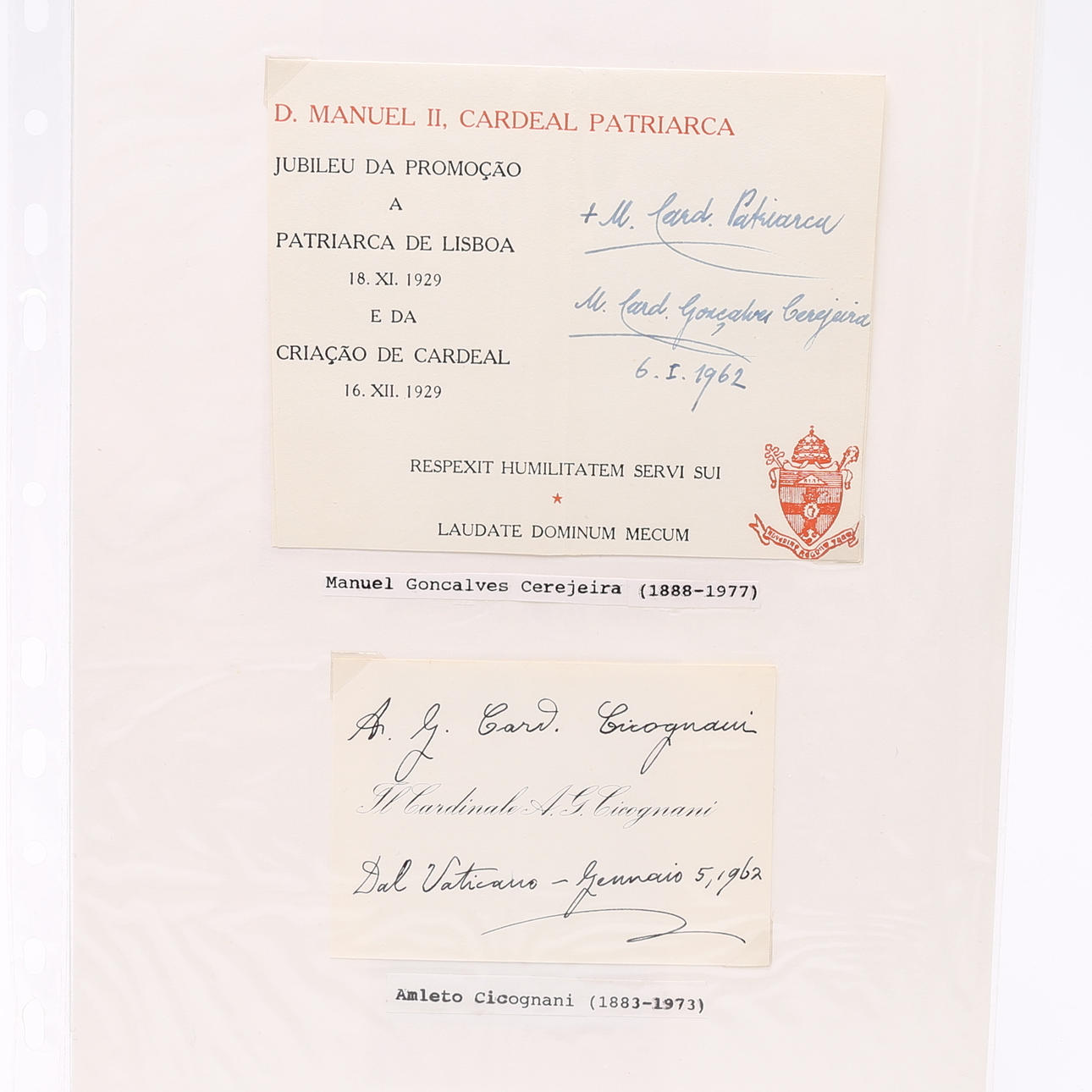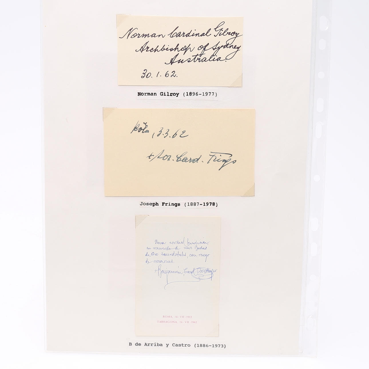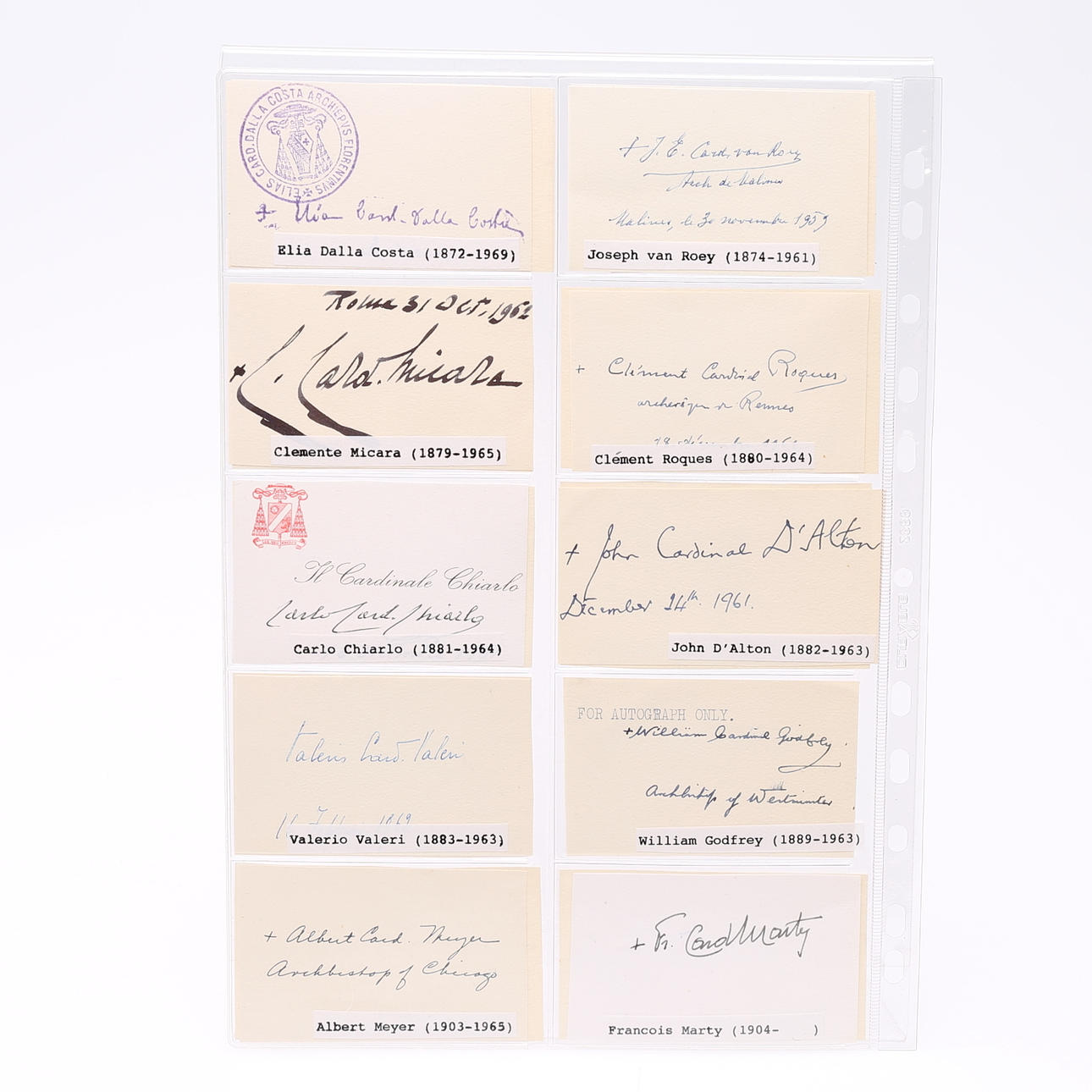Theodor Innitzer, Eugene Tisserant, Aloisi Masella, Guiseppe Ferretto, Achille Lienart, Ignatio Gabriel Tappouni, Santiag Copello, Gregory Peter Agagianian, James McGuigan, CC de Vasconcellos Motta, Francis Spellman, Jaime de Barros Camara, Ernesto Ruffini, Thomas Thien, Augusti da Silva, Carlos Maria de la Torre, Guiseppe Siri, Gacomo Lercarode, Stefan Wyszynski, JF McIntyre, Fernando Quiroga, Paul Emile Leger, Giovanni Urbani, José Garibi Rivera, Antiono, Barbieri, Carlo Confalonieri, Richard Custing, José Bueno Monreal, Julius Döpfner , Peter Tatsuo Doi, Joseph Lefebre, Bernardos Alfrindk, Joseph Ritter, Humberto Quintero, Luis Concha, José de Costa Nunes, Ildebrando Antoniutti, Efrem Forni, Raul Silva, Leo Jospeh Suenens, Juan Landazuri, Ricketts, Alfredo Ottaviani, Franceso Roberti, Arcadio Larraona, William Heard, Agostono Bea, Antonie Bacci, Michael Browne, Anselm Albareda, Elia Dalla Costa, jsoeph van Roey, Clemente Micara, Clemet Roques, Carlo Chiarlo, John d´Alton, Valerio Val eri, Willam Godfrey, Albert Mayer, Francois Marty, CA Renard, Tomas O´Fiaich, Johannes Willebrands, Frantisek Tomasek, Alberto di Joria, Manuel Goncalves Cerejeira, Amleto Cicagnani, Norman Gilroy, Joseph Frings, B de Arriba y Castro, Valerian Gracias , Fernand Cento, Gustvo Testa, Rufino Santos, Franz König, Laurian Rugambwa, Jaime Sin, Josef Glemp und Achille Silvestrini Signiertes Foto – misst 9 cm. × 5,5 cm. . Provenienz: Sverker Hiort aus der Autographensammlung von Ornäs.