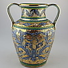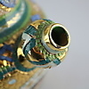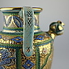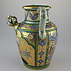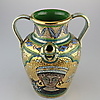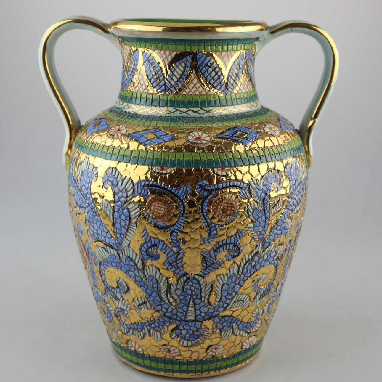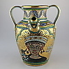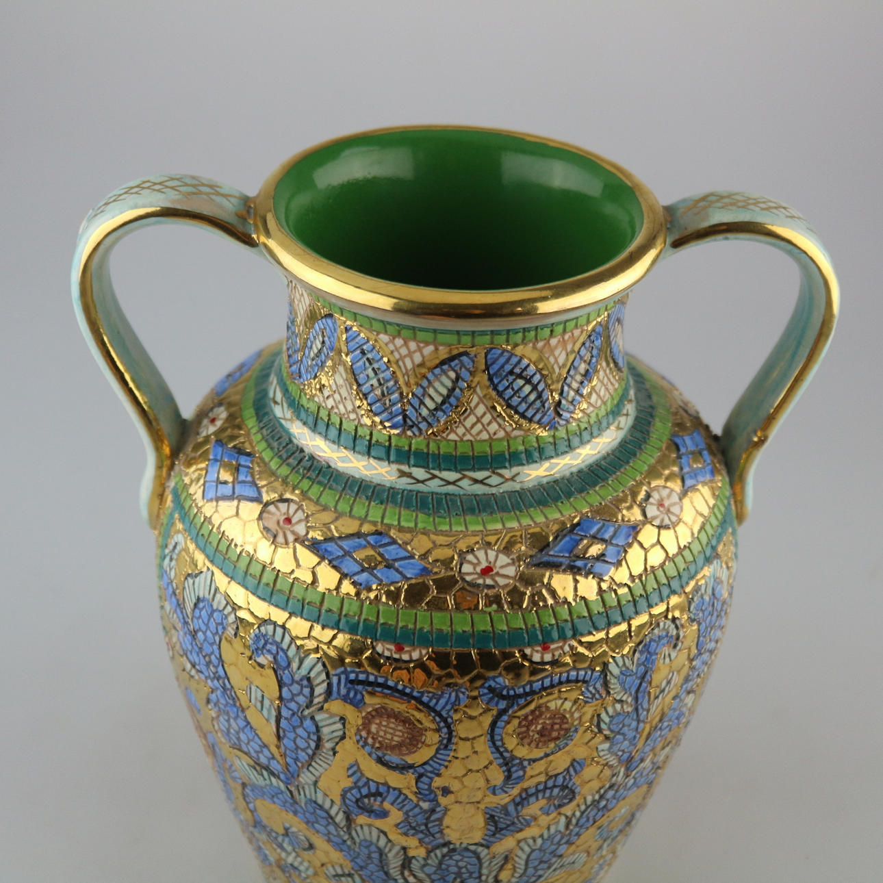 Vintage Neruda Mosaik Vase, design is a depiction of Empress Theodora, sixth century Byzantine wife of Emperor Justinian, later canonized by the Eastern Orthodox Church as Saint Theodora. The mosaic design is hand incised on to the vase rather than applied pieces. Höhe: 23 cm.