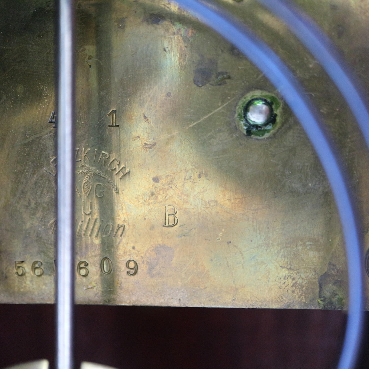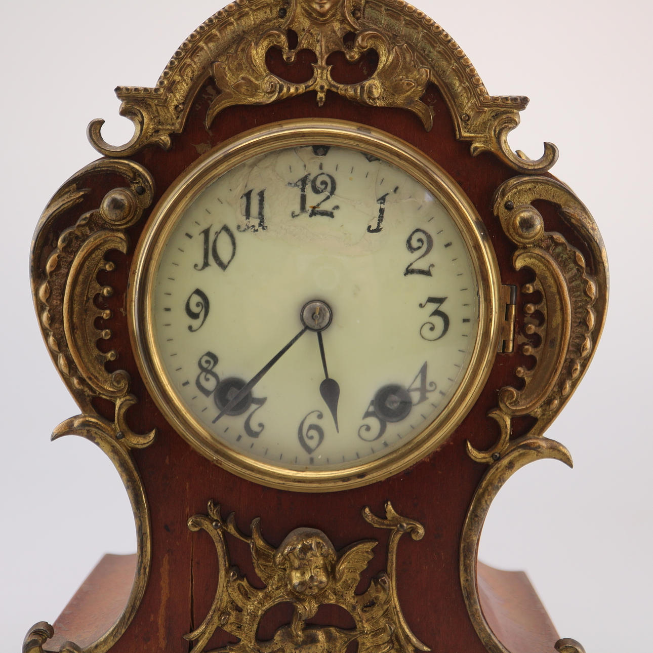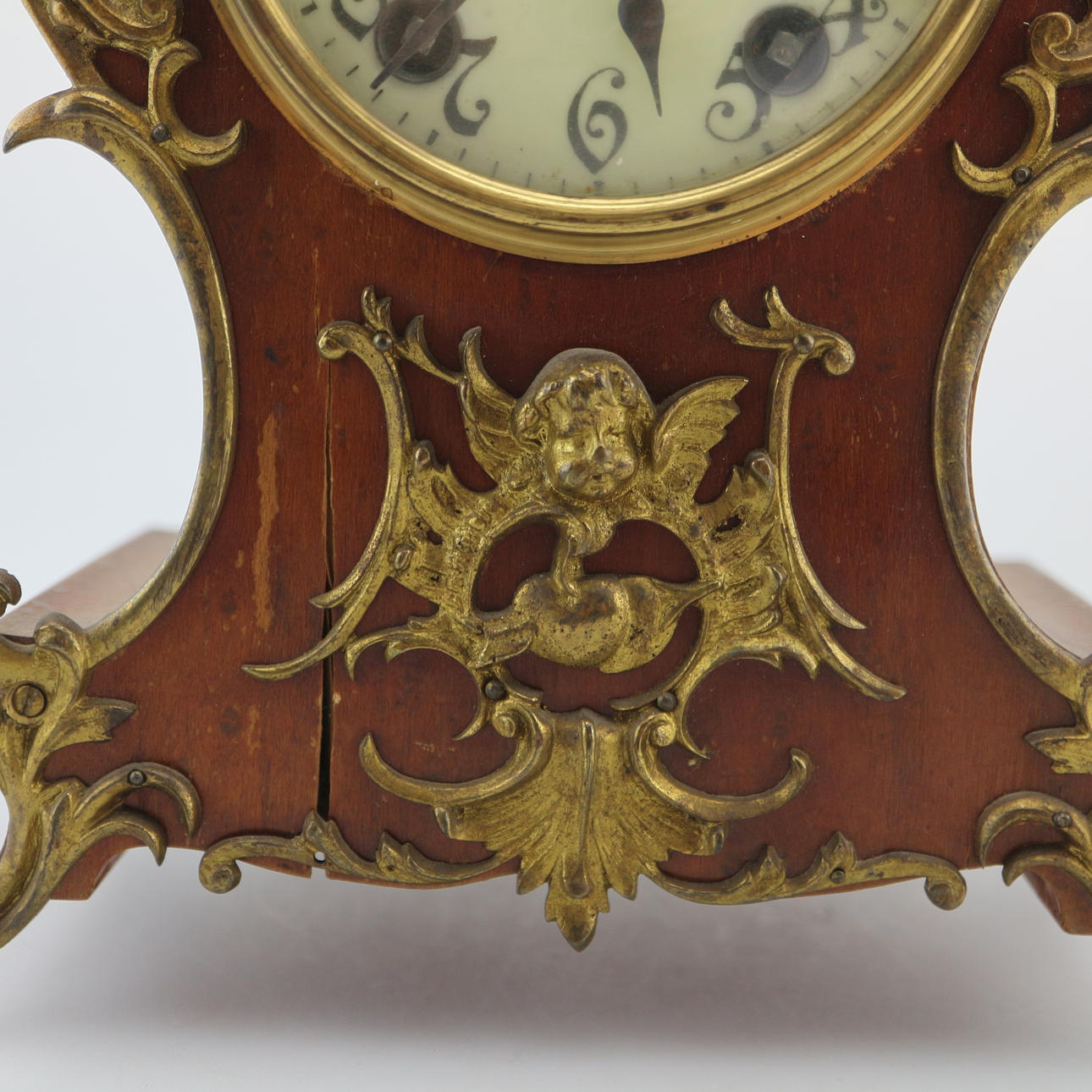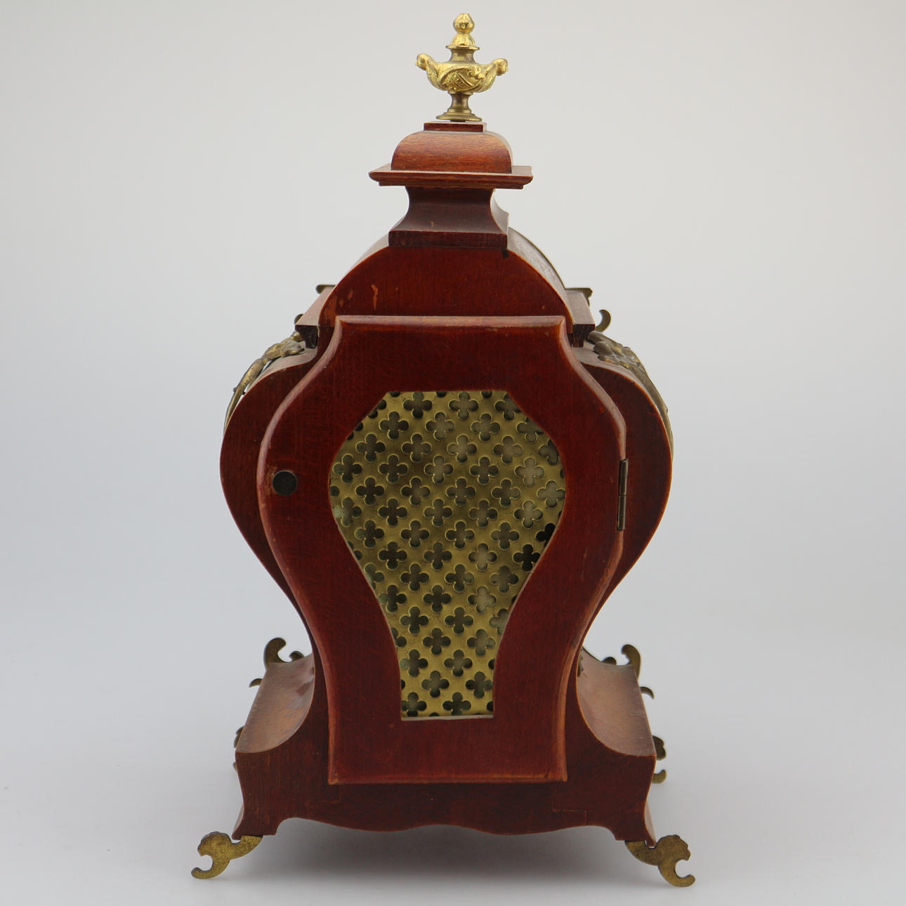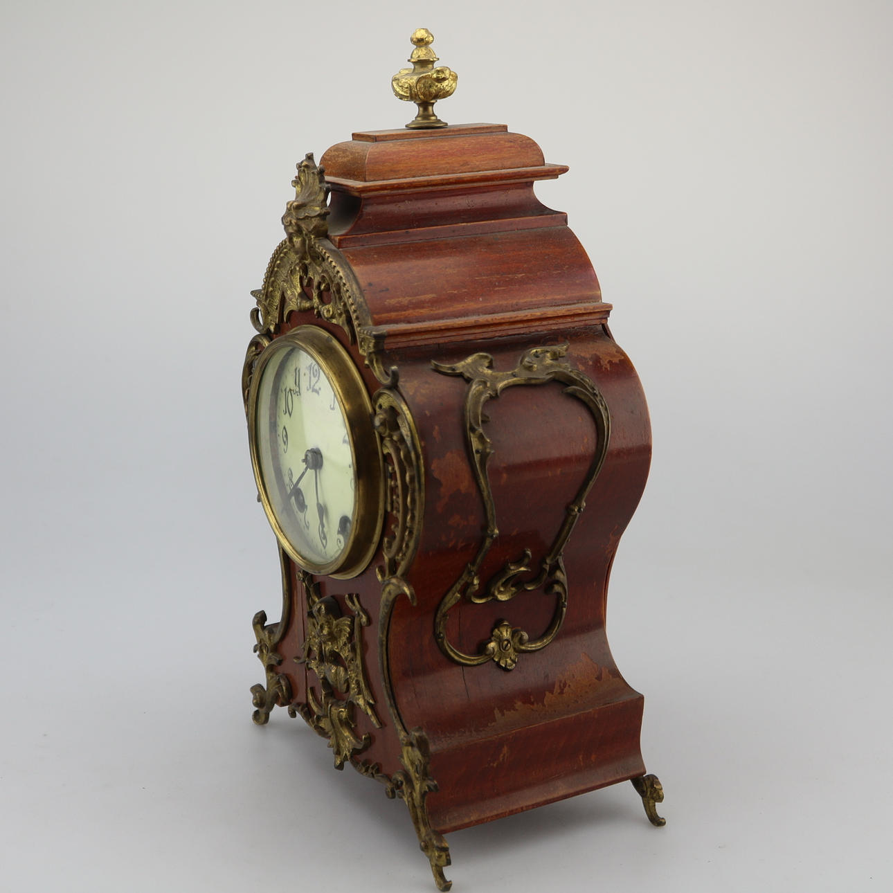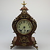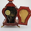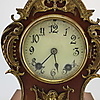 KAMINUHR 'LENZKIRCH' Deutsch, Anfang 20. Jh. Holz, dunkel gebeizt, Messing. H. 34 cm. Auf dem Uhrwerk bezeichnet 'Lenzkirch', mit Werknummer '567609'. Hoher, mehrfach geschwungener Korpus mit flächendeckenden Applikationen in Rocaillen- und Muschelform. Zentral gesetztes, weißes Ziffernblatt mit arabischen Zahlen hinter Glas. Funktionsfähig, Pendel vorhanden.