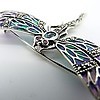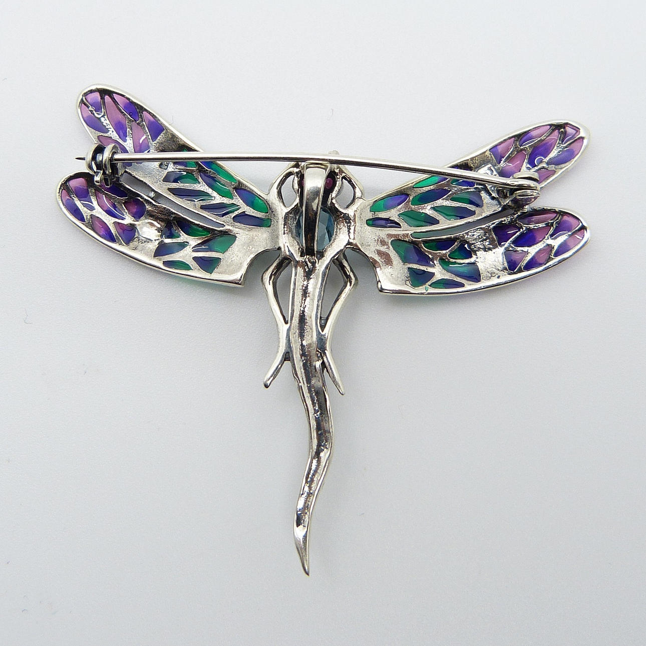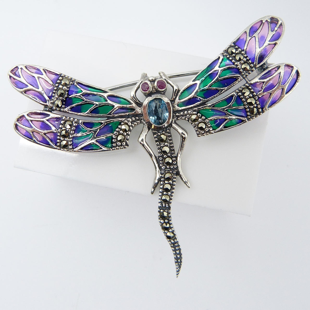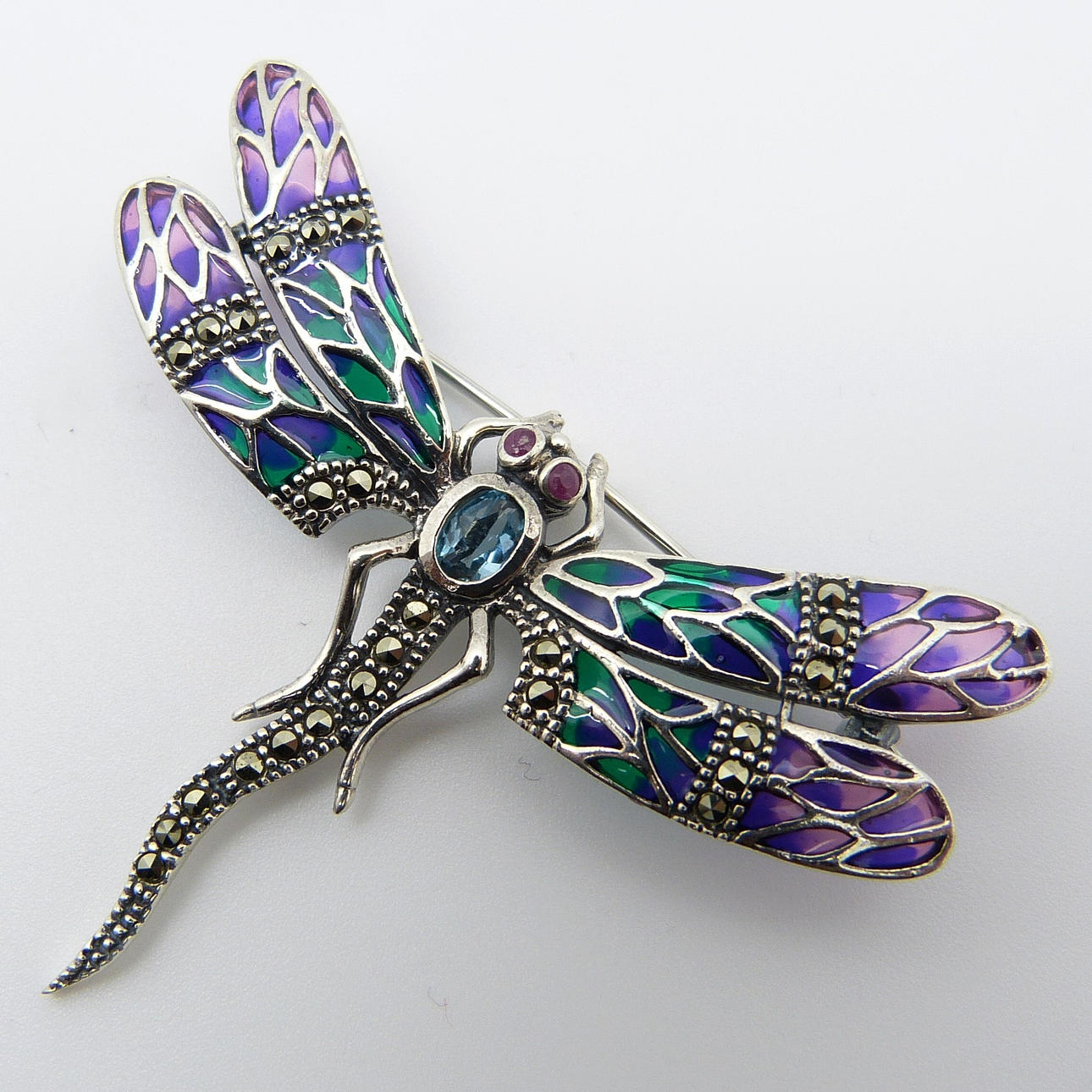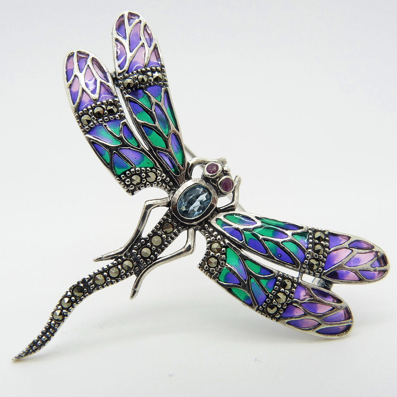 Ein großer Libellen-Anhänger / Brosche aus Silber, besetzt mit blauem Topas und Markasiten und eingelegt mit mehrfarbiger Emaille.