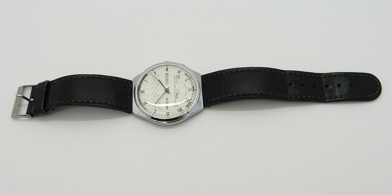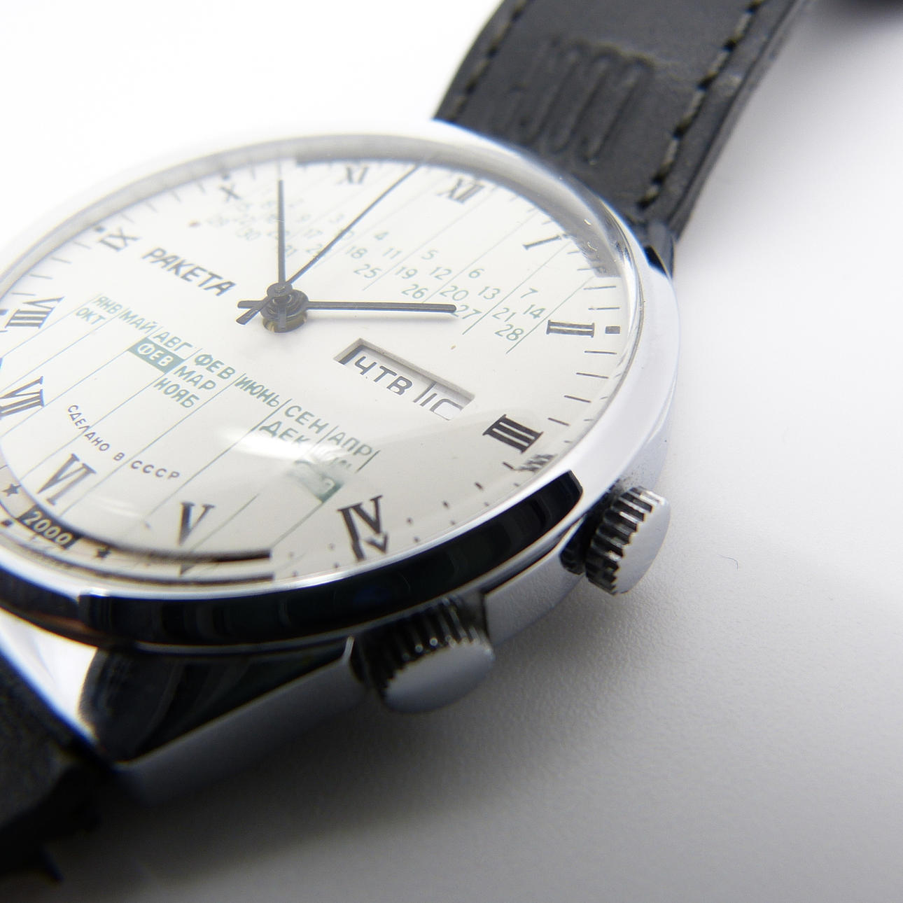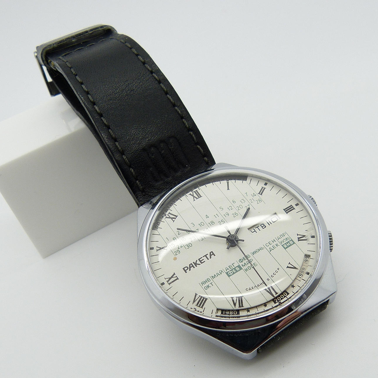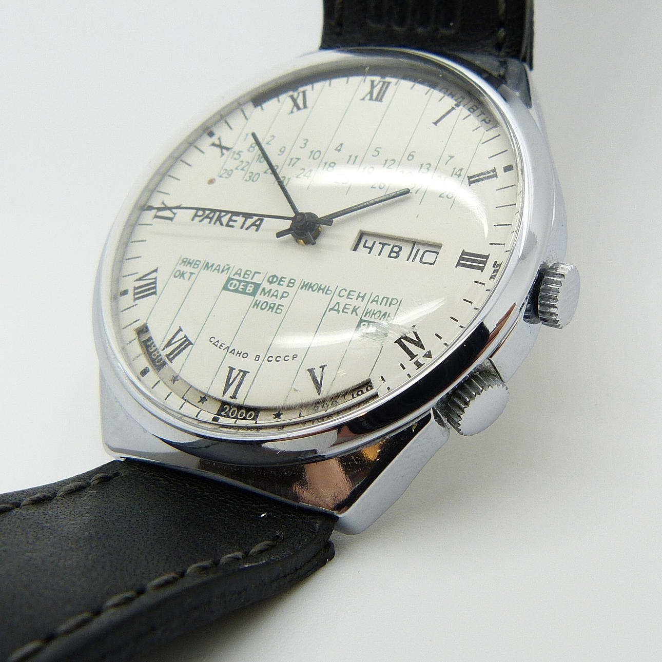 • Herrenuhr • Herkunftsland: CCCP / UdSSR / Russland • Gehäuse: Edelstahl • Armband: Originalleder • Uhrwerk: Manuell, aufziehbar • Anzeige: Analog und Datumsfenster • Chromo: Ja • Ziffernblatt: Weiß mit Blau/Grün Beschriftung • Zifferblatt: römische Zahlen, schwarz • Zeiger: schwarz, schmal • Gehäusedurchmesser: ca. 40 mm • Armbandbreite: ca. 20 mm Gesamtgewicht: 62,1 Gramm.