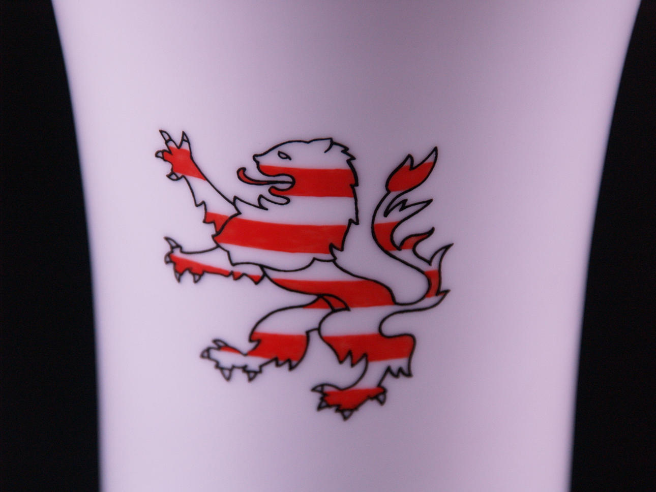 Vase- Hoechst, blaue Radmarke, 20.Jh., Trompetenform, schauseitig bemalt mit hessischem Löwen, weiß/rot/schwarz, H.ca.20cm.