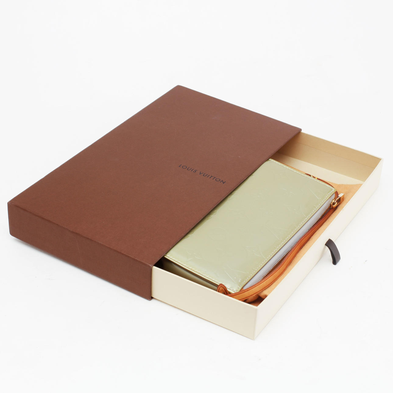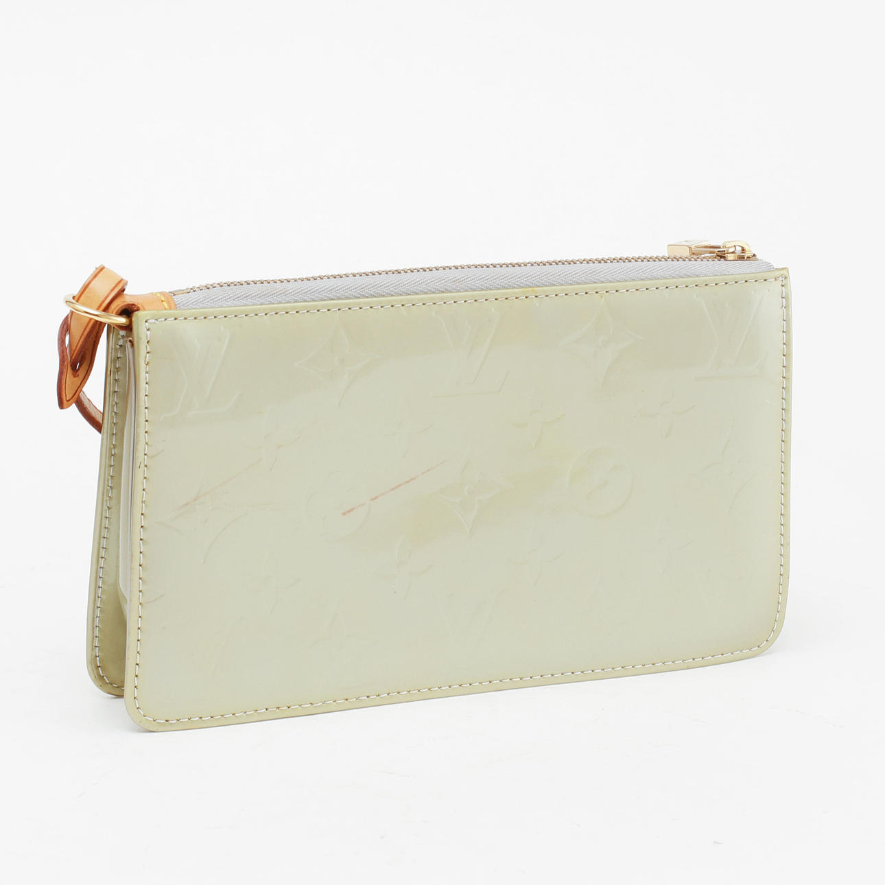 Monogrammlack hellgrün mit braunen Lederdetails. Beschläge aus gelbem Metall. Abnehmbarer Riemen. Innen gemarkt "LOUIS VUITTON PARIS made in France", VI0061. 20 x 12 x 4 cm. Inklusive Staubbeutel und Karton.