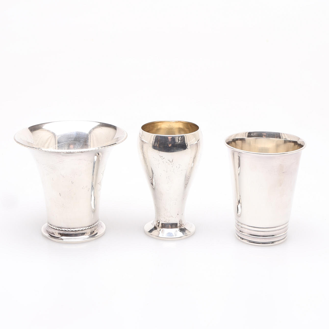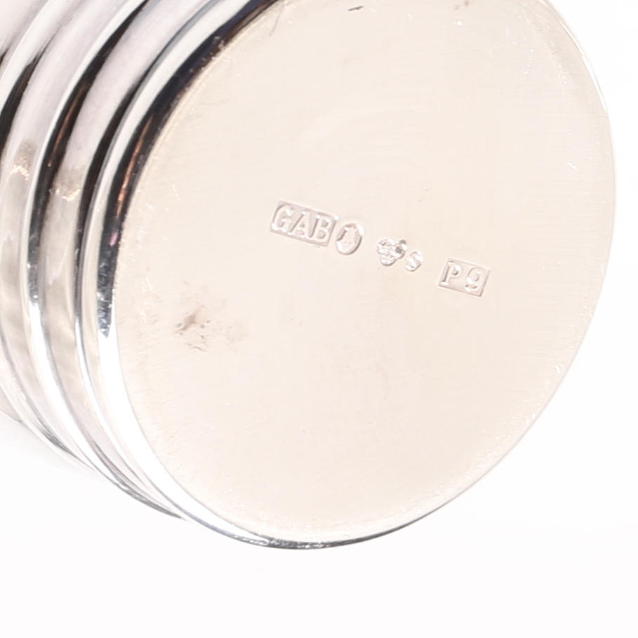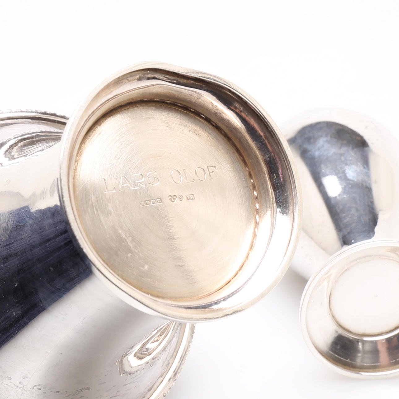 Dose in Silber mit Innenvergoldung, Ausführung Nils Jacob Helldahl, Jahr 1850 Gestempelt NJ HELLDAHL, U4(1850) Brillenetui in Silber, gestempelt 830S, Katzenpfote, S, ELW Pokal, Höhe 8 cm, gestempelt GAB, Stockholm, Katzenpfote , S, P9(1965) Becher, Höhe 9 cm, gestempelt GAH, Stockholm, Katzenpfote, S, R7(1919) Becher, Höhe 8,2 cm, Durchmesser 9 cm, gestempelt Uppsala, Katzenpfote, S, V8 (1947) u undeutlicher Stempel Gesamtgewicht 318 Gramm.