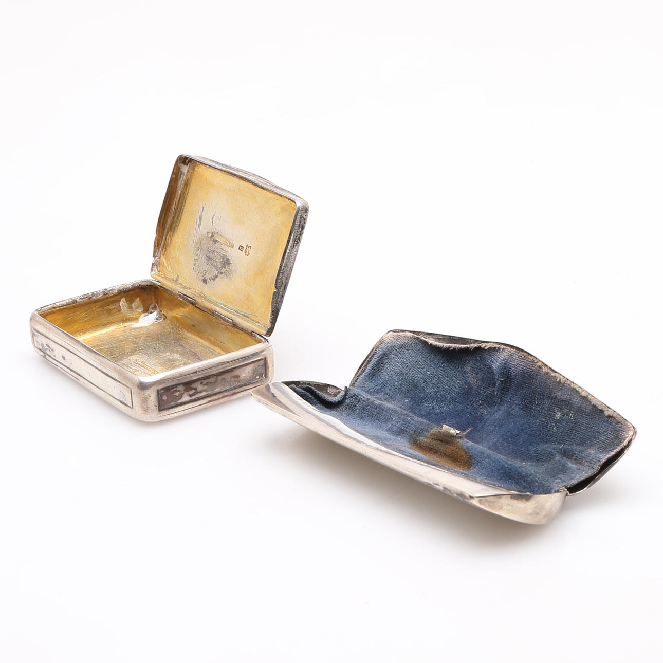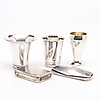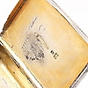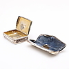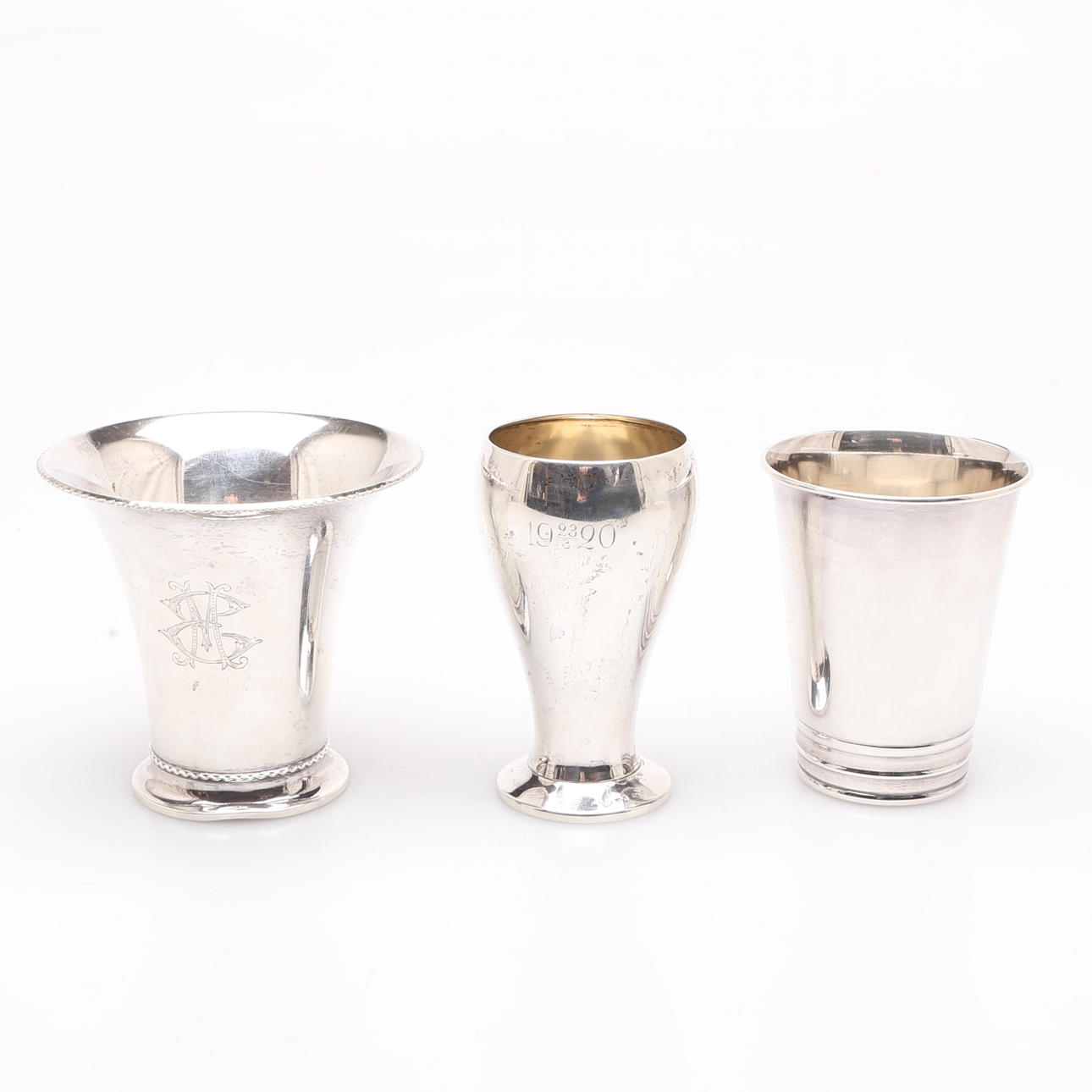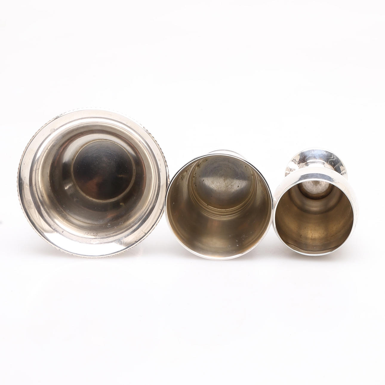 Dose in Silber mit Innenvergoldung, Ausführung Nils Jacob Helldahl, Jahr 1850 Gestempelt NJ HELLDAHL, U4(1850) Brillenetui in Silber, gestempelt 830S, Katzenpfote, S, ELW Pokal, Höhe 8 cm, gestempelt GAB, Stockholm, Katzenpfote , S, P9(1965) Becher, Höhe 9 cm, gestempelt GAH, Stockholm, Katzenpfote, S, R7(1919) Becher, Höhe 8,2 cm, Durchmesser 9 cm, gestempelt Uppsala, Katzenpfote, S, V8 (1947) u undeutlicher Stempel Gesamtgewicht 318 Gramm.