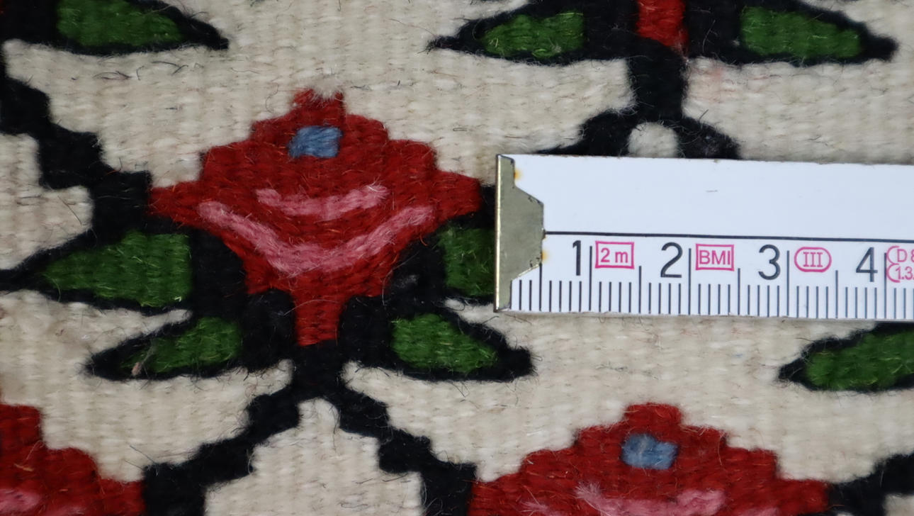 Kelim - Turkmenien, Wolle, beigegrundig mit durchgehendem floralem Muster, rotgrundige Borte, Fransen an schmalen Seiten, Maße ohne Fransen gemessen ca.156x104cm.