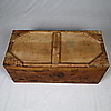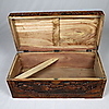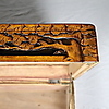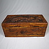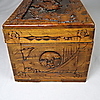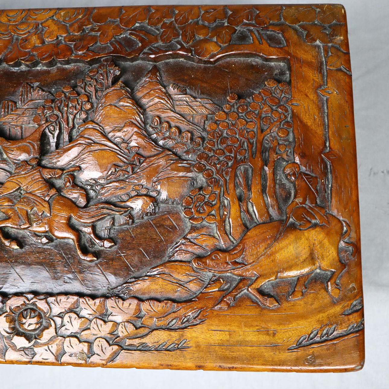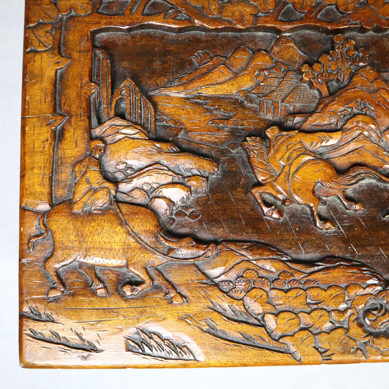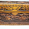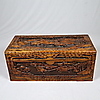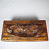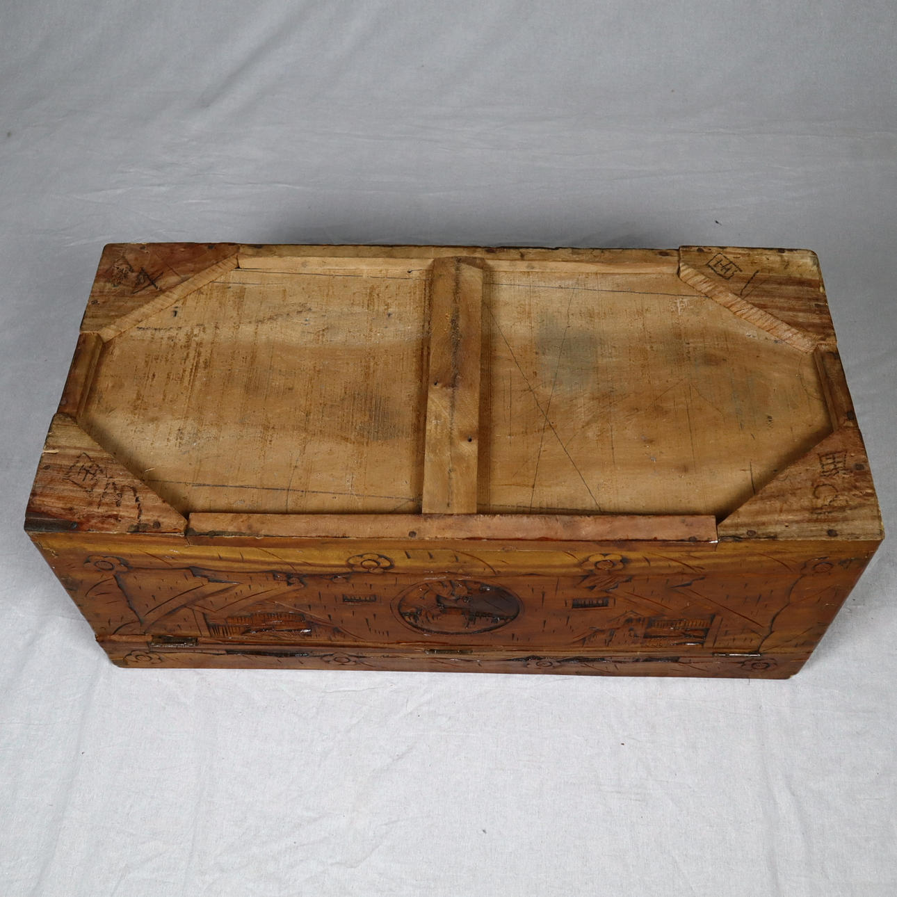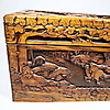 Kleine Truhe - China, Sandelholz, rechteckige Form mit Scharnierdeckel, ringsum reliefartige Schnitzereien, u.a großformatige Landschaftsszenerien mit reitenden Kriegern, H-32cm B-79cm T-37cm.