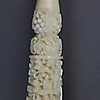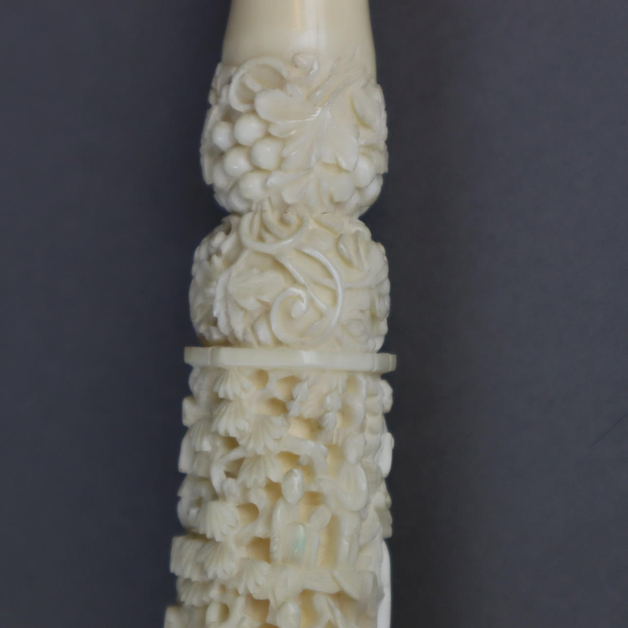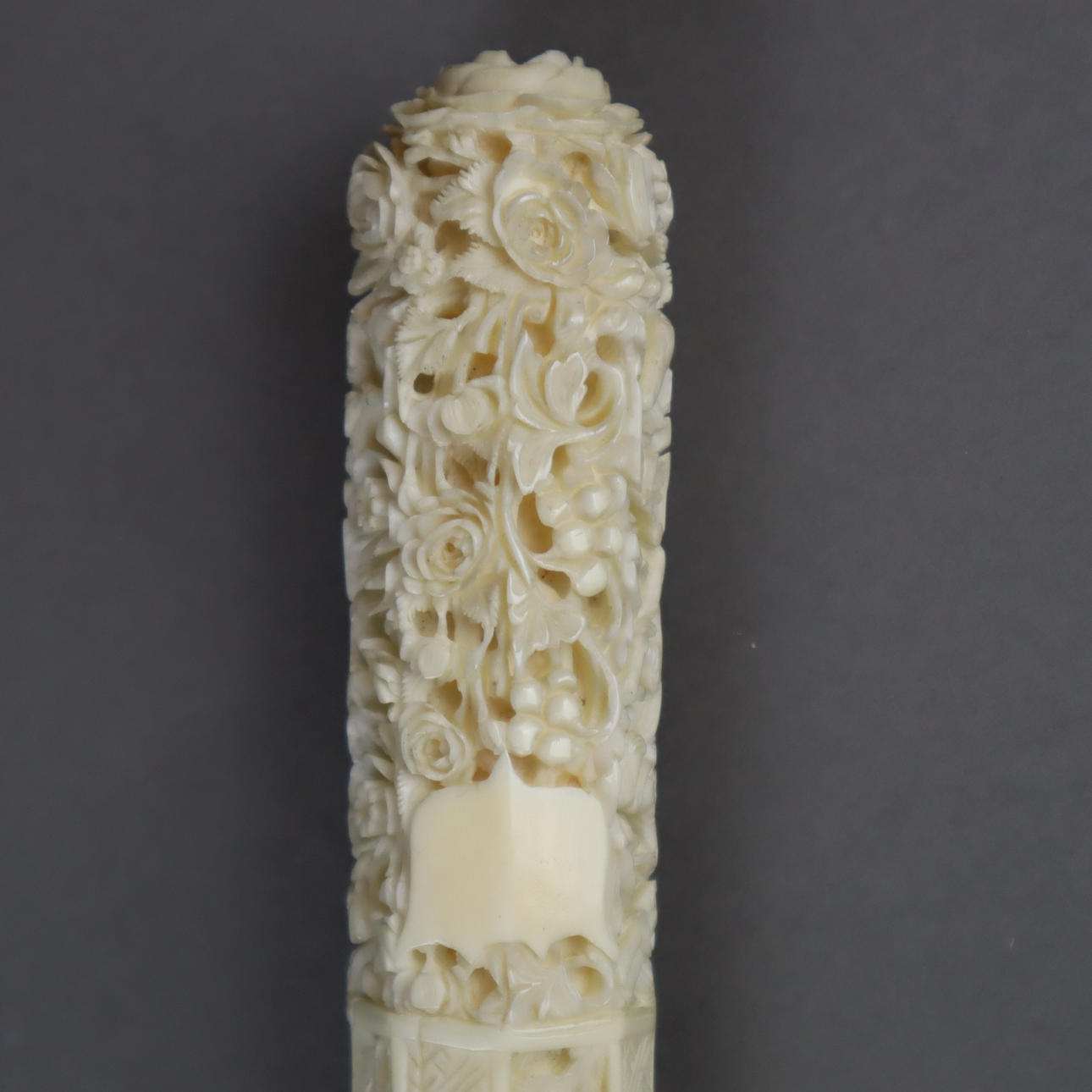 Elfenbein-Schirmgriff - China, nach 1900, langer keulenförmiger Griff überaus fein beschnitzt mit Rosenranken, Ornamenten, Weinreben sowie Architekturlandschaft mit Figurenstaffage, L.ca.32cm.