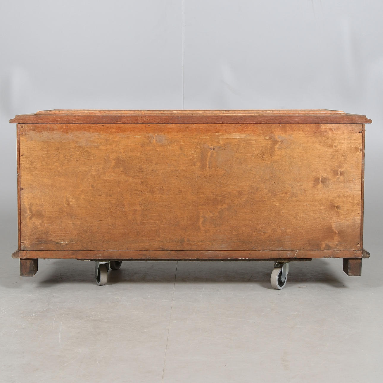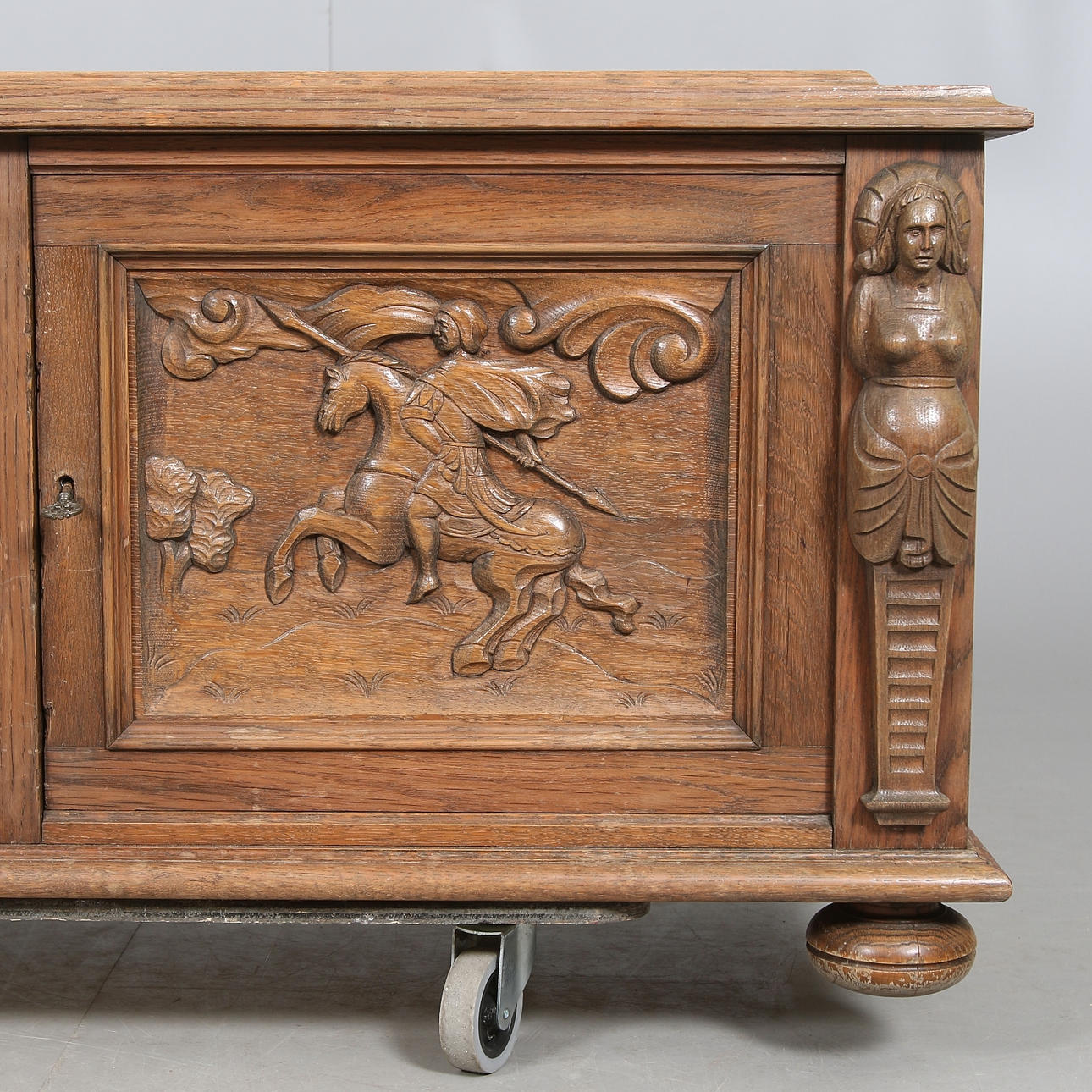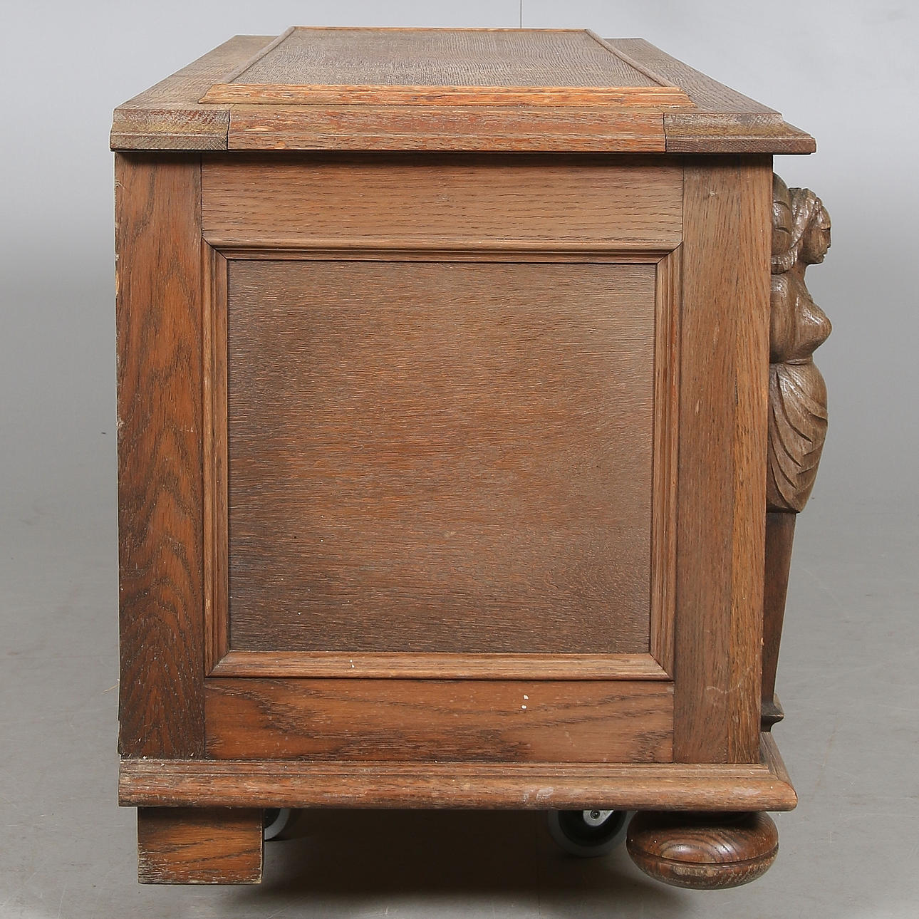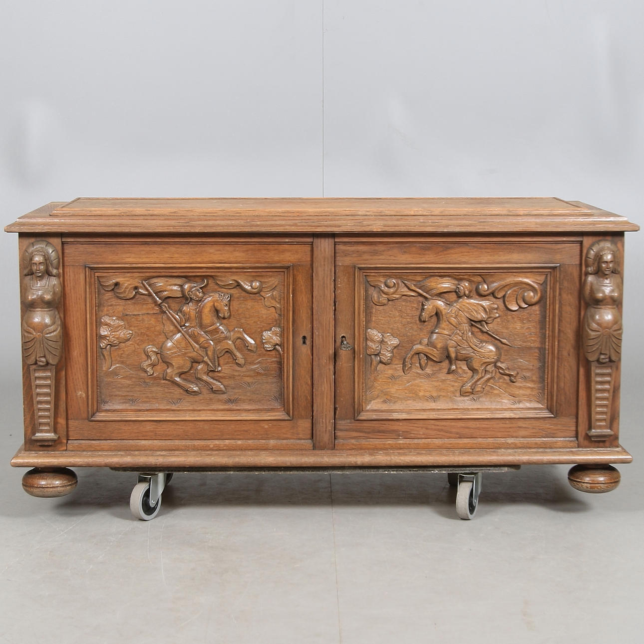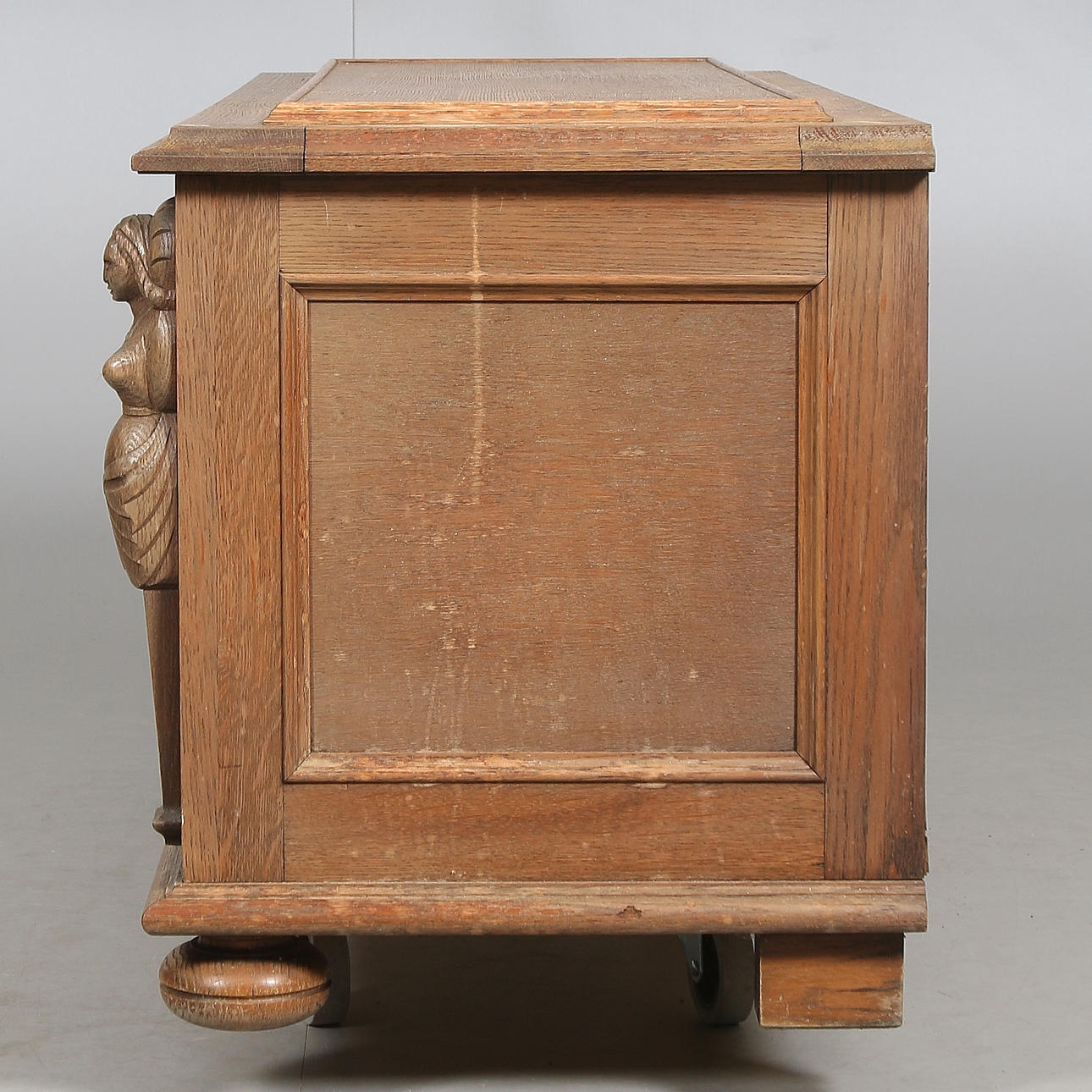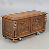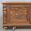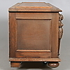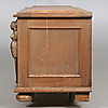 Hergestellt/furniert in Eiche. Schnittdekor in Form von Figurenszenen und Karyatiden. Länge ca. 118, Breite 49, Höhe 55 cm.