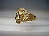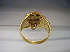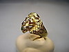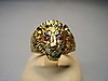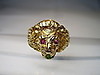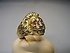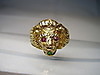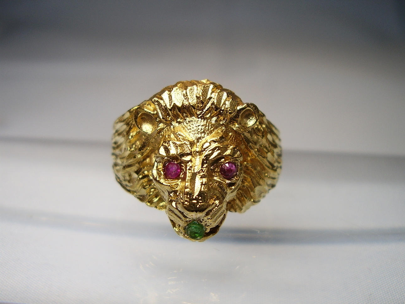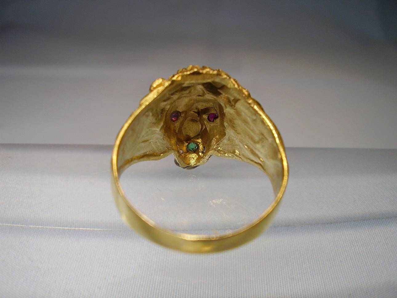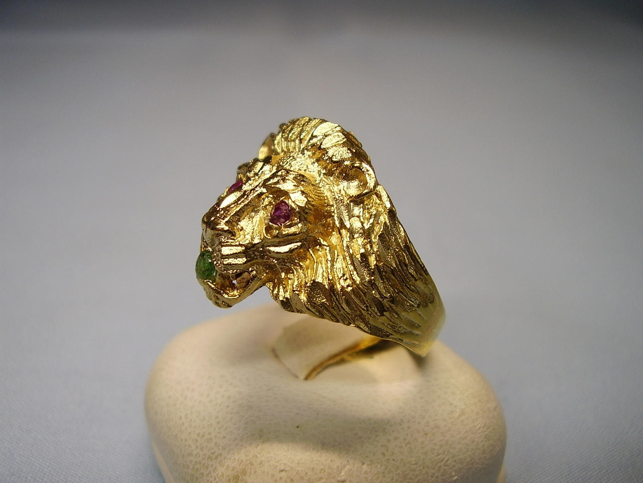 Er ist in Form eines Löwenkopfes ausgearbeitet. Als Augen sind rund facettierte, Natur- Rubine sowie im Maul ein rund facettierter Natur- Smaragd eingesetzt.