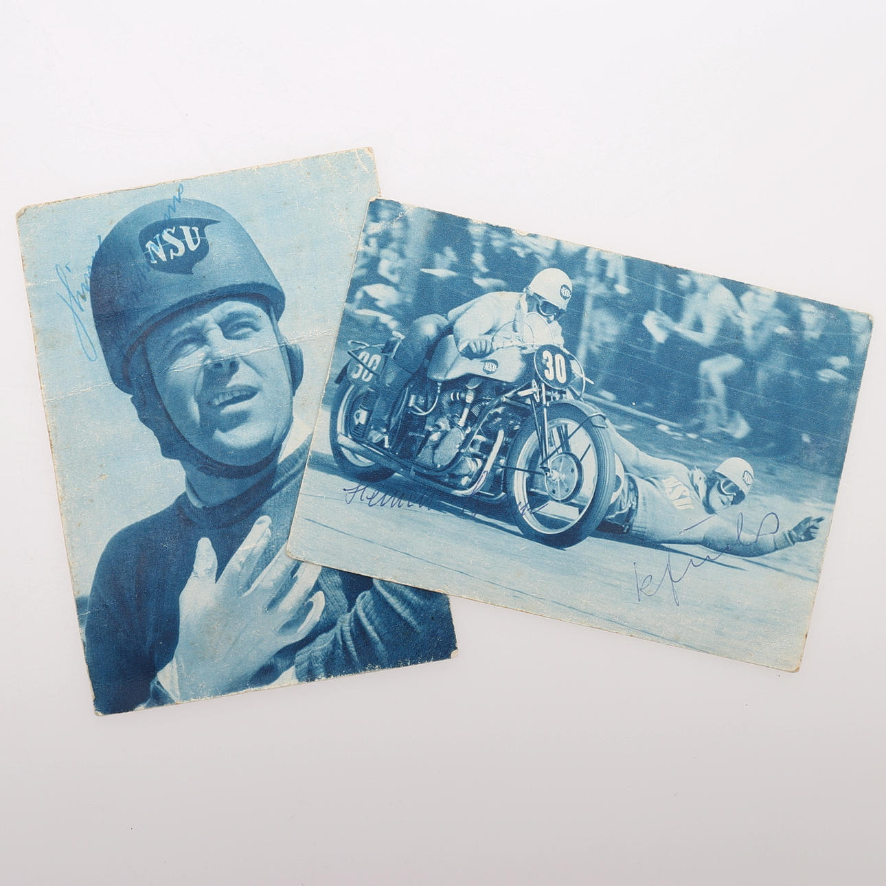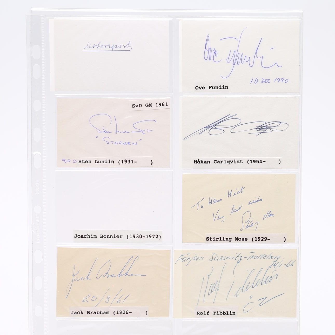 Ove Fundin, Sten Lundin, Håkan Carlqvist, Stirling Moss, Jack BRabham, Rolf Tibblin, Niki Lauda (Rückseite der Postkarte), Bobby Schwartz (Aufkleber), Heiner Fleishmann, Hermann Böhm, Karl Fuchs, Harry Källström und Björn Waldegård – misst 9 cm . × 5,5 cm. Provenienz: Sverker Hiort aus der Autographensammlung von Ornäs.
