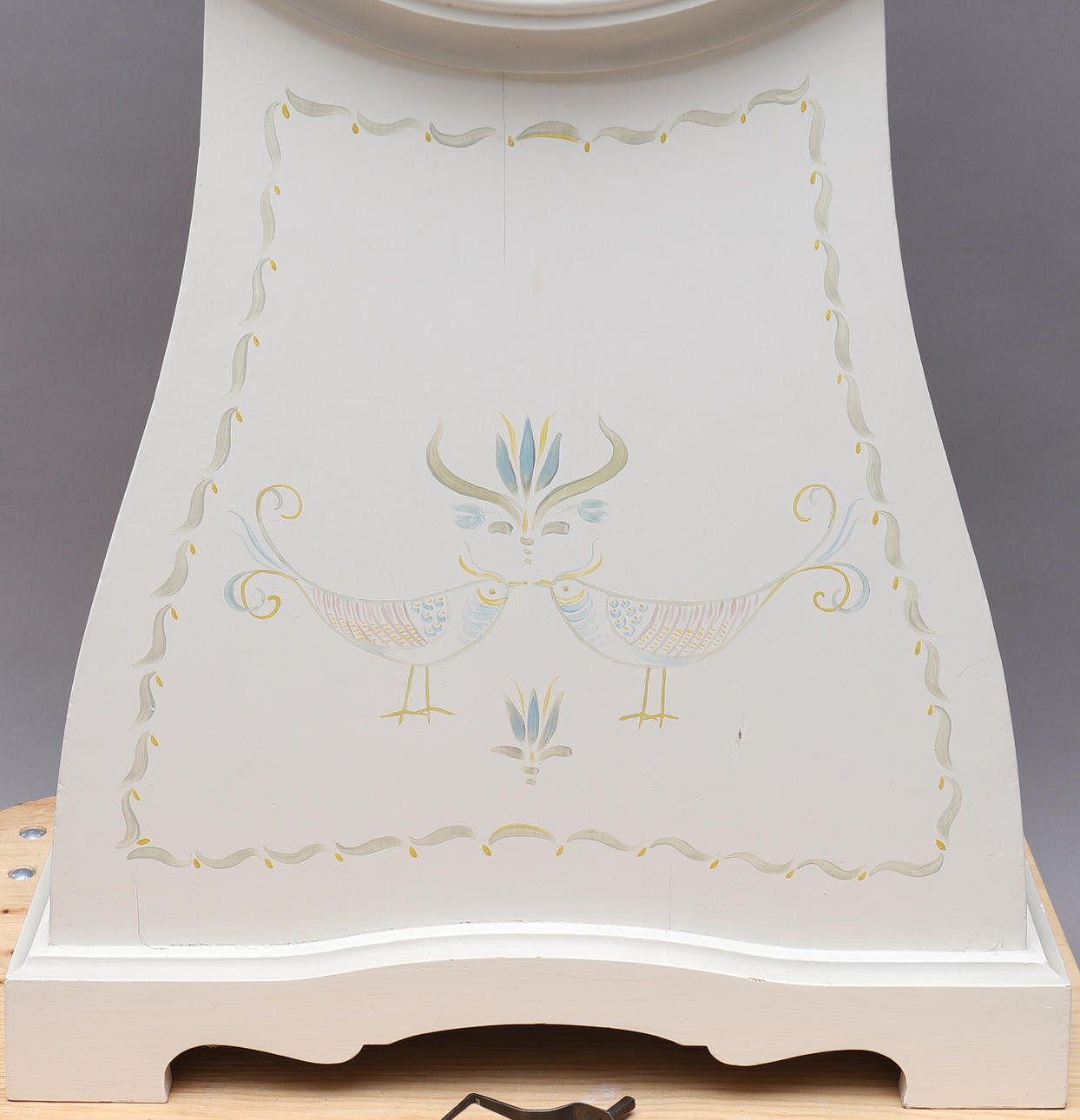 Vogelmotiv, abnehmbares Oberteil. Holzstecker zurück. Lot & Pendel.
