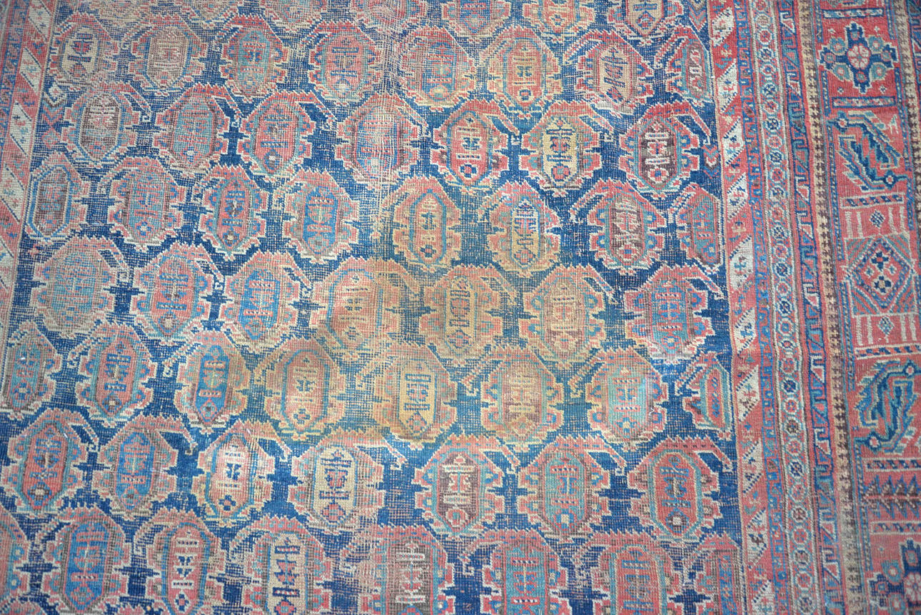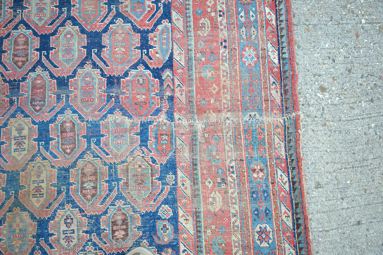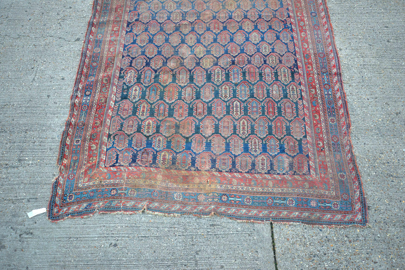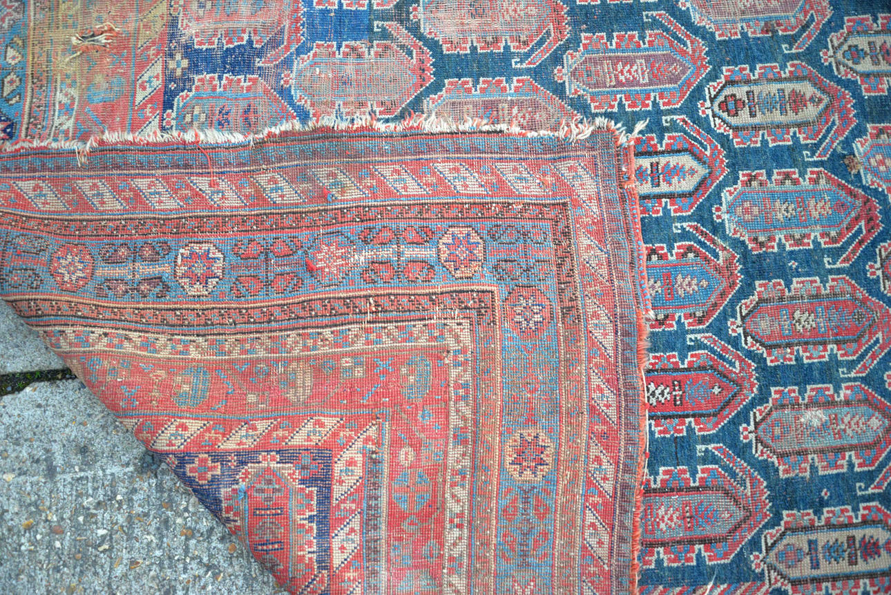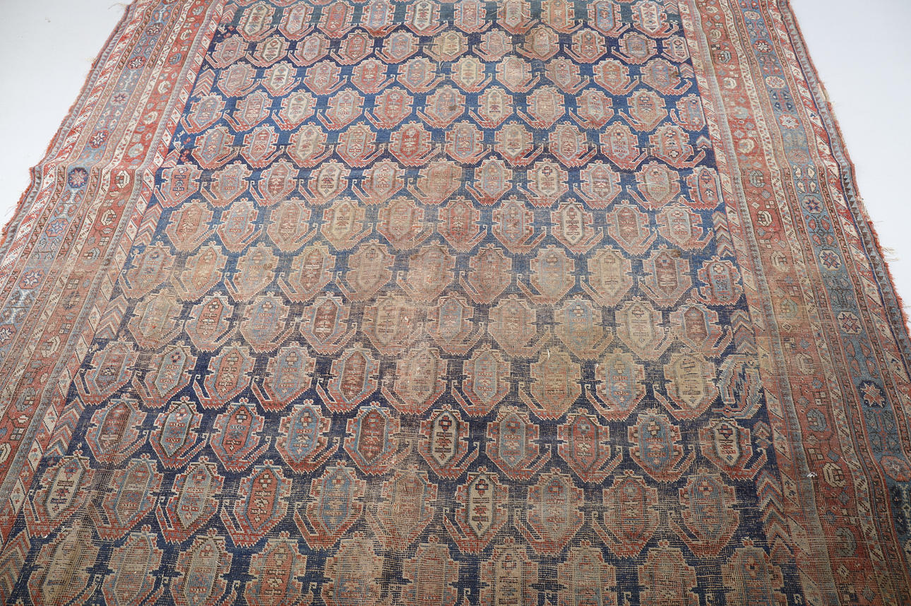 "Landhauszustand" - stark durch Gebrauch abgenutzt mit reduziertem Flor, fehlende Seitenkordeln und lose Fäden, alte Reparaturen mit genähten Rissen und Flecken, Löcher, schlechte Flecken.